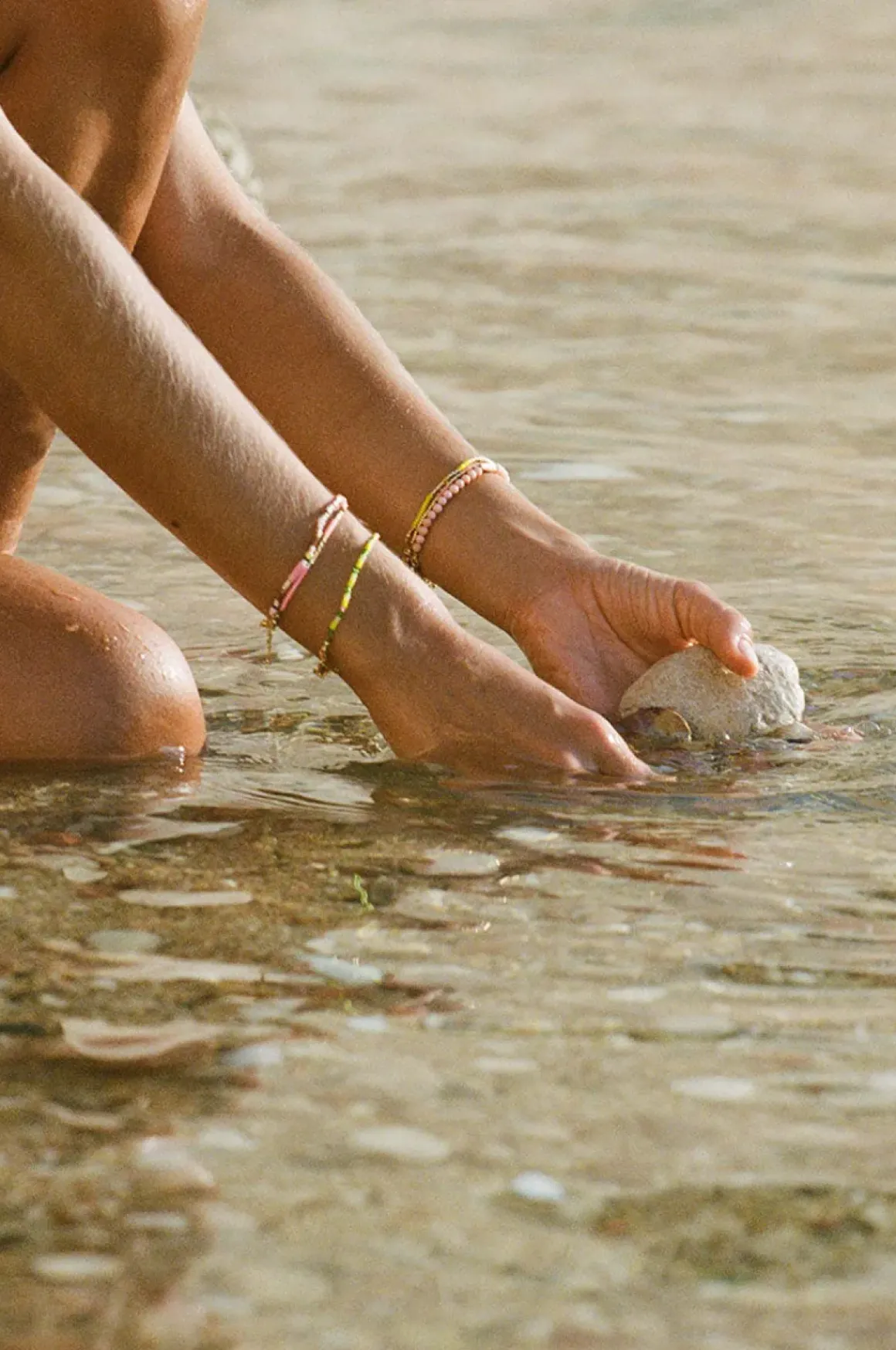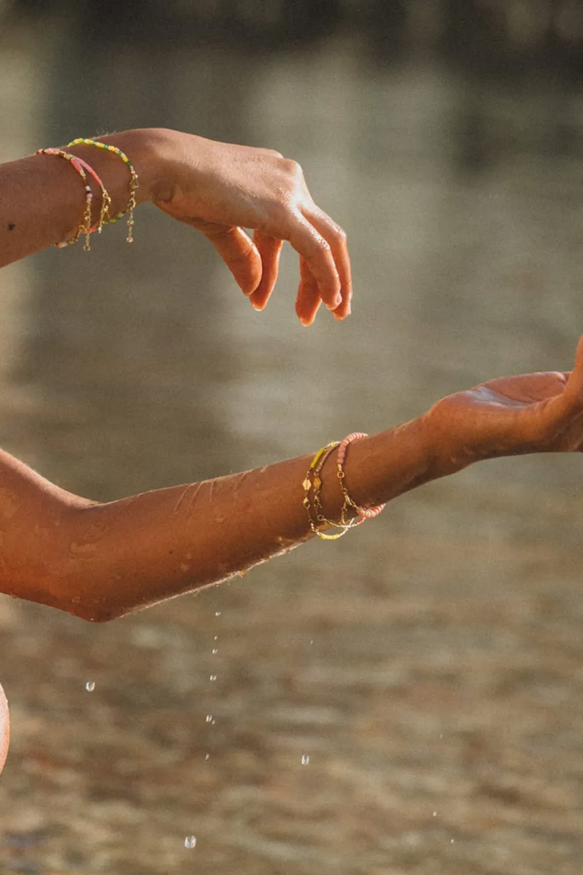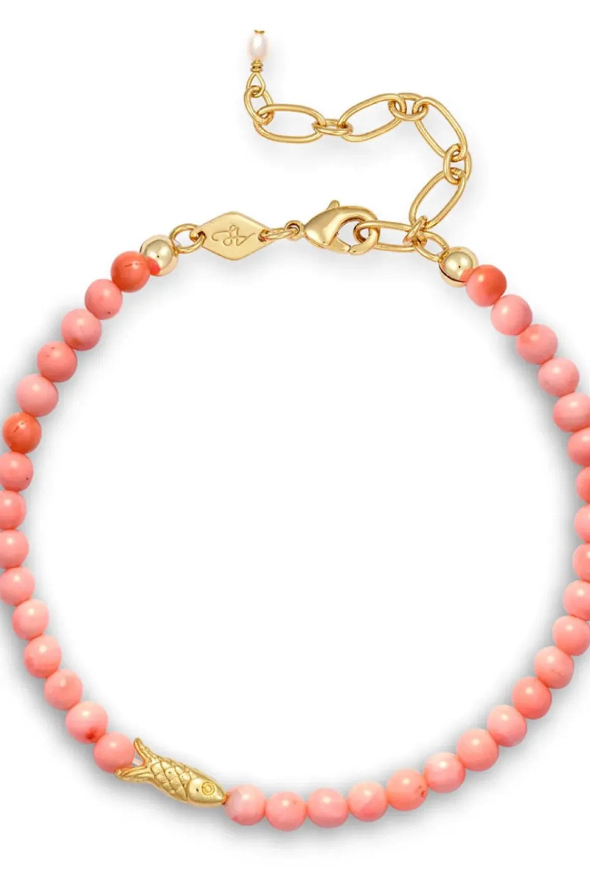 Fingerling-armbåndet fra Anni Lu og Il Mare-kolleksjonen er inspirert av havets magiske verden. De korallrosa perlene og den lille gullfisken skaper en leken detalj som minner om strandens skatter. Perfekt alene eller i kombinasjon med andre smykker for å tilføre et snev av havets skjønnhet til ethvert antrekk.