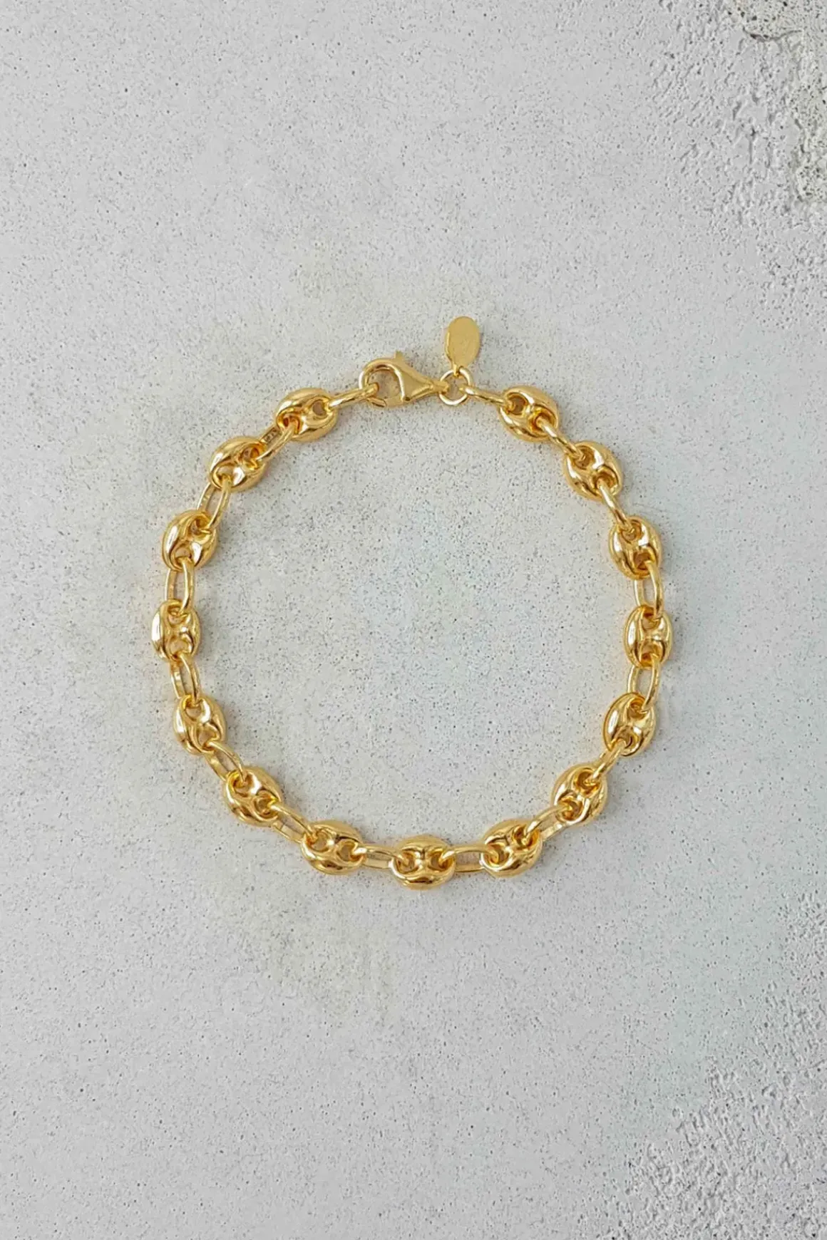 Metung-armbånd i 18k gullbelagt sterlingsølv fra Romanin. Armbåndet er et iøyenfallende statement rundt håndleddet. Bruk det alene eller i kombinasjon med flere smykker fra samme merke. Armbåndet kommer i tre ulike tykkelser, hvor dette er det tynneste.