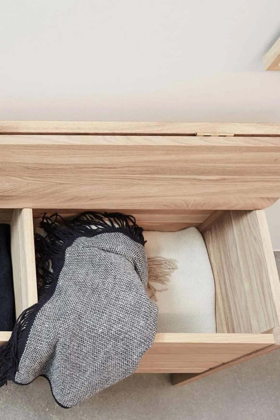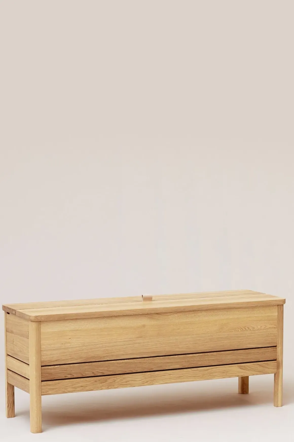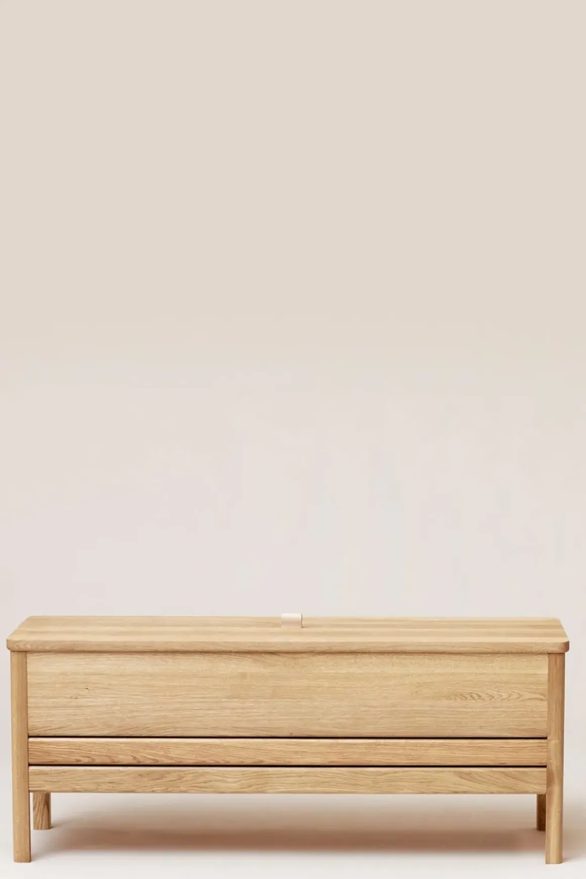A Line benken fra Form u0026amp; Refine er både allsidig og praktisk. Designet av duoen Herman Studio, som kjennetegnes av balanserte kombinasjoner mellom funksjonelt og overraskende design. Benken har en innovativ konstruksjon som gir deg haugevis av oppbevaringsmuligheter. Setet kan løftes opp ved hjelp av et skinnhåndtak, og avslører to oppbevaringsrom inni benken. Perfekt til sko og klær i gangen, sengetøy og håndklær på soverommet, eller puter og pledd i stuen. Det tidløse designet av hvitoljet eik vil skli rett inn i alle interiørstiler.