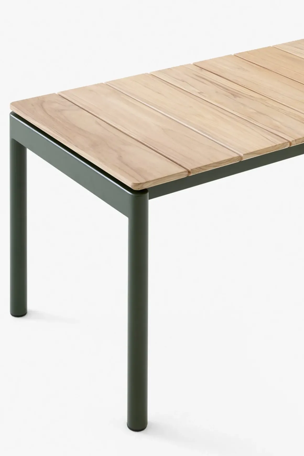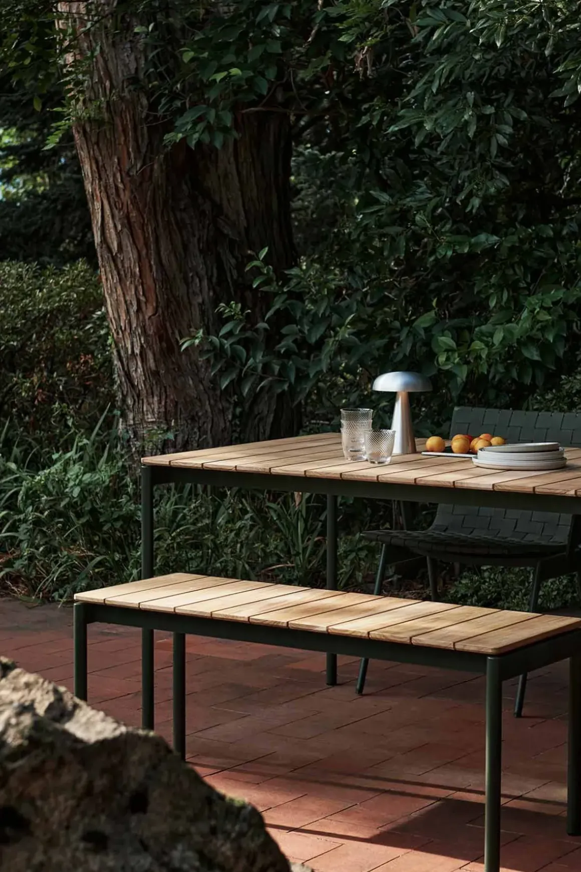 Ville utebenk fra u0026amp;Tradition, designet av den norske designduoen Andersen u0026amp; Voll. Benken er laget av teak og pulverlakkert stål som gjør det perfekt til utebruk. Metallet kuttes, formes, sveises og deretter pulverlakkeres, mens treverket freses i form og deretter slipes og forblir ubehandlet, men glatt. Benken kan like gjerne kombineres med andre typer utemøbler, eller man kan komplettere med stoler, bord og sitteputer fra samme serie. Ville kommer i en sort eller grønn utgave.