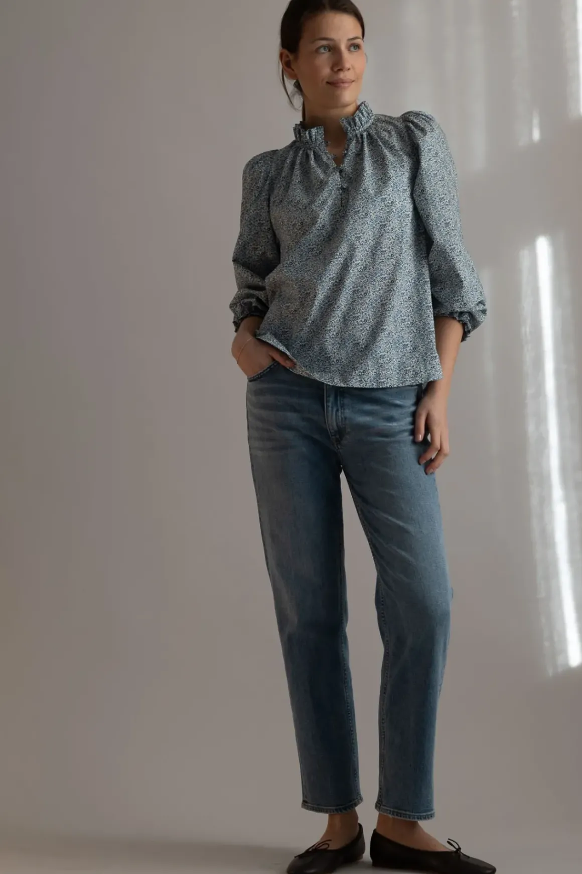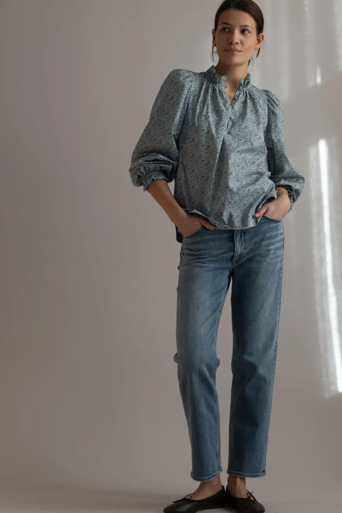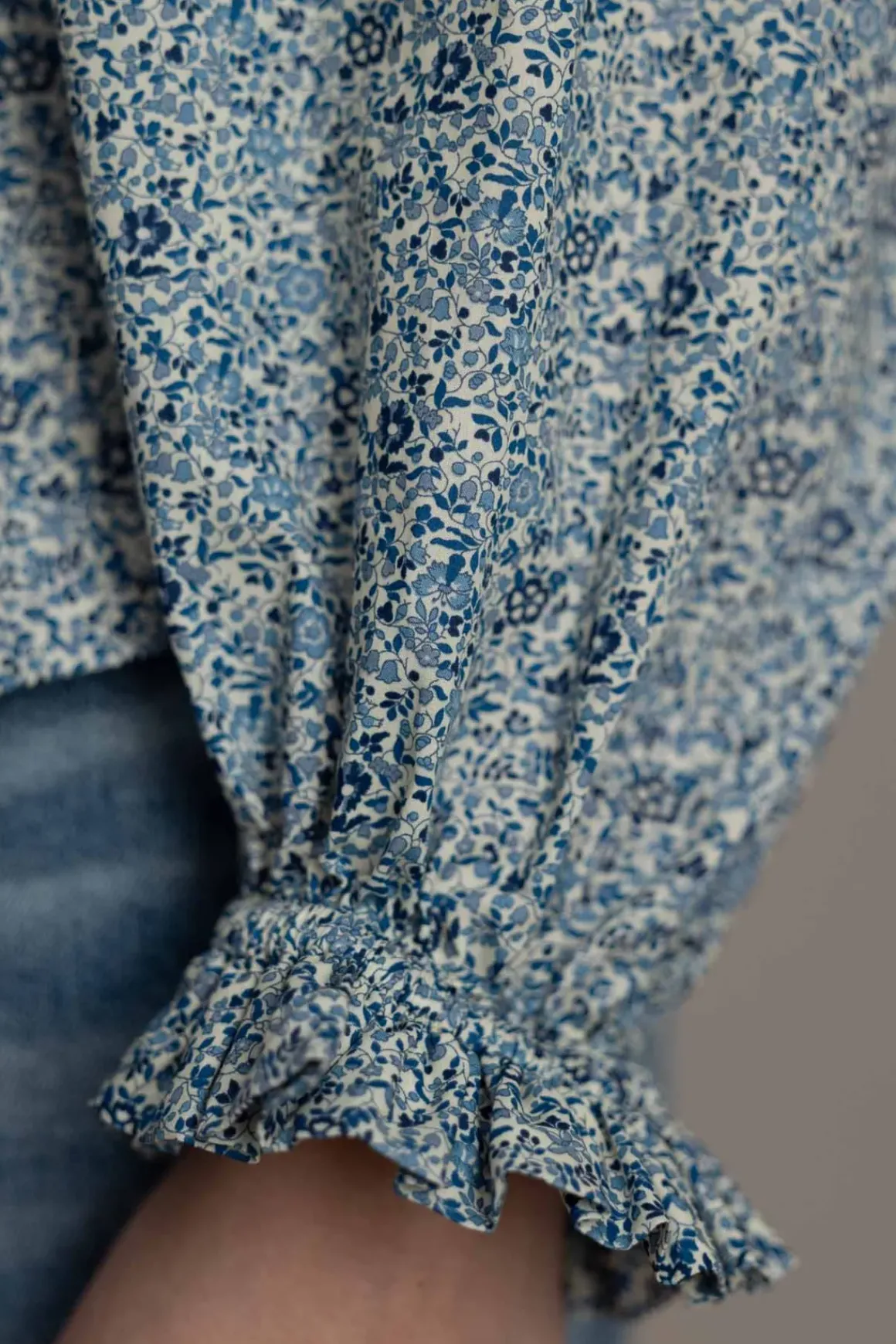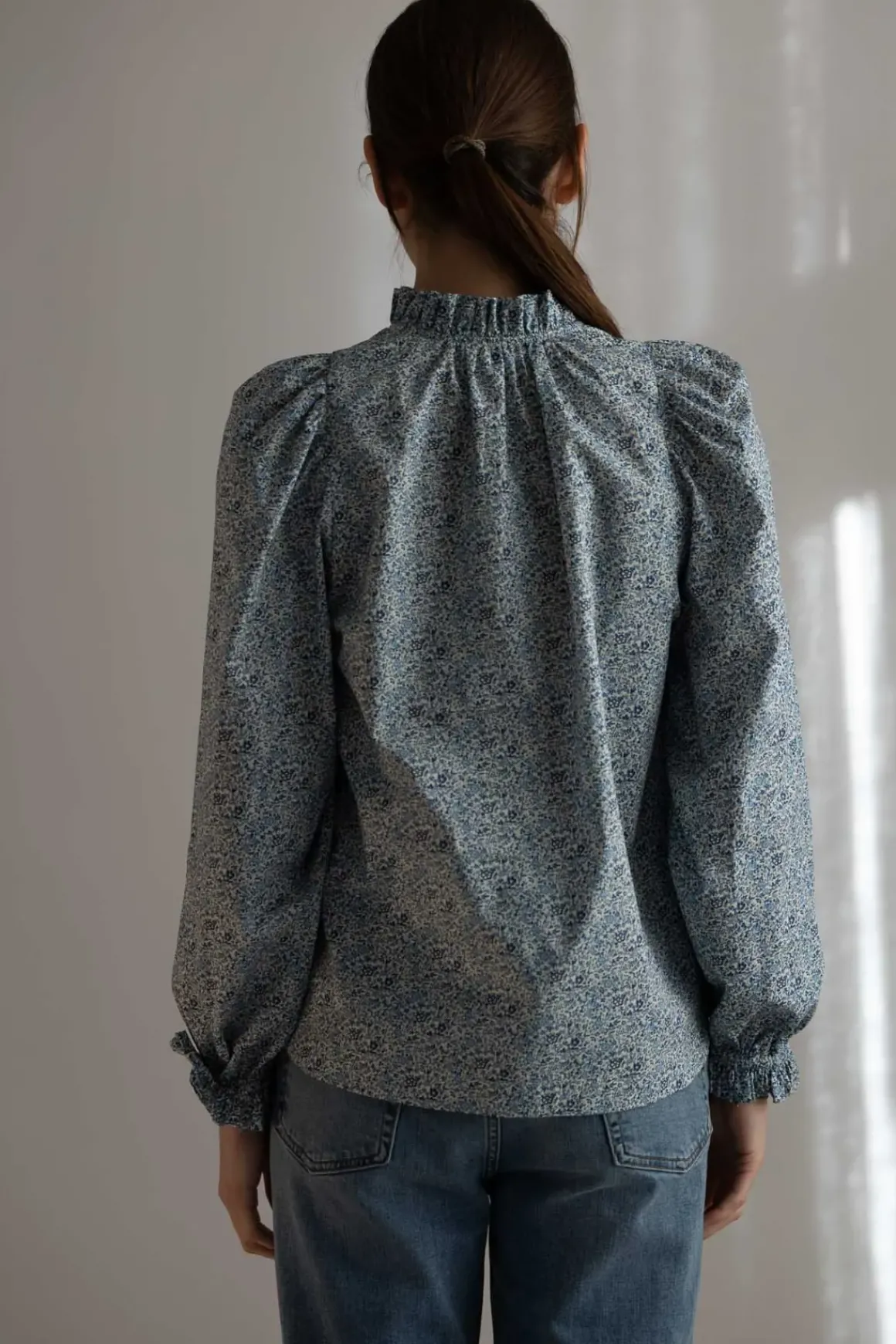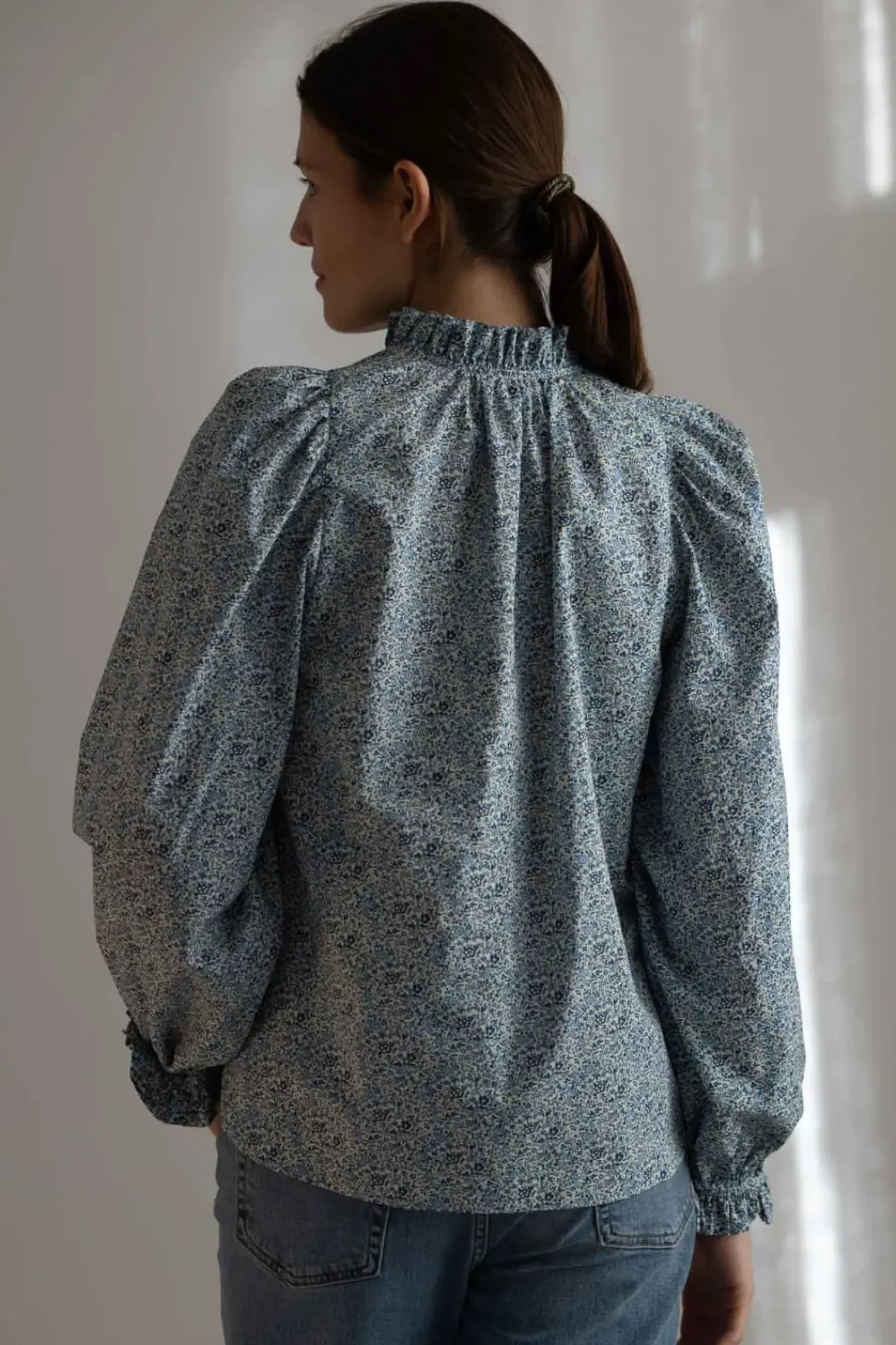 Denne blusen har en avslappet passform med voluminøse puffermer. Skjorten er detaljert med volang krage og avrundet kant nederst. Skjorten kommer i en blå nyanse med blomstermønster. Match skjorten med jeans for et gjennomført antrekk.