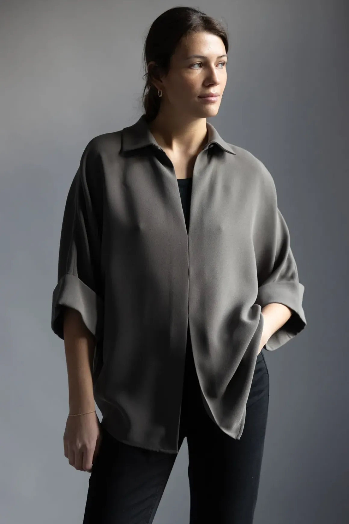 Signaturblusen Bailee i fargen Moss fra MKDT er et tidløst plagg som kombinerer stil og komfort. Blusen er produsert i en behagelig crepe georgette-kvalitet som gir den en lett og luftig følelse. Det unike med Bailee er at den kan brukes på begge sider, slik at du kan velge knappelukking foran eller bak, avhengig av hva som passer din stil for dagen. Med trekvart ermelengde og elegante brett, er denne blusen både sofistikert og allsidig. Den passer perfekt til både sorte dressbukser eller jeans, alt etter hvilken look du ønsker å oppnå. Kombiner den med matchende bukser Palmira for et gjennomført antrekk. En sikker vinner, enten det er til hverdagsbruk eller til festlige anledninger.