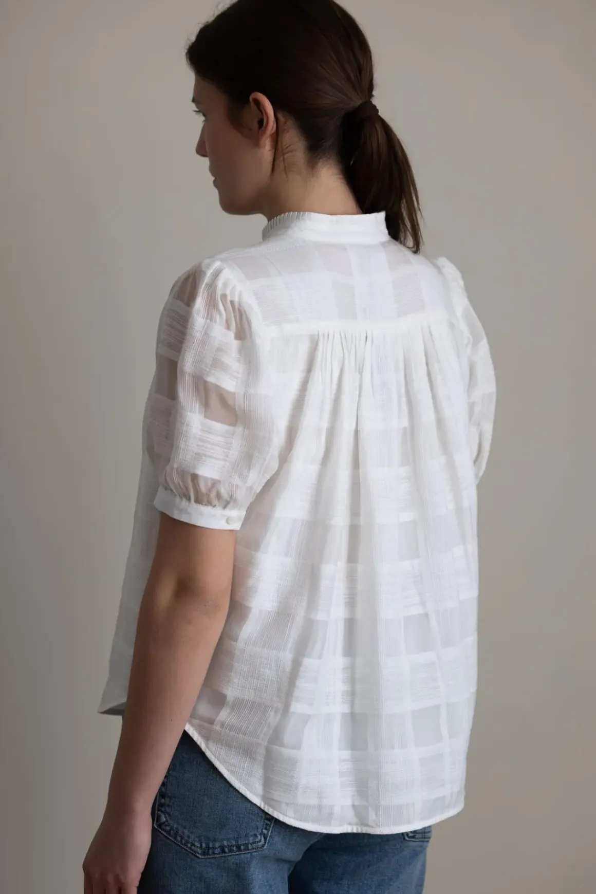 Nydelig bluse fra Rag u0026amp; Bone som gir nytt liv til den klassiske skjorten. Den er sydd i en lett bomullsblanding med et luftig rutemønster i semitransparent kvalitet som gir både tekstur og lyshet. Skjulte knapper i front, korte ermer med mansjett og en feminin, rynket krage gir plagget en fin balanse mellom avslappet og gjennomført. Like fin til jeans som til linbukser eller skjørt.