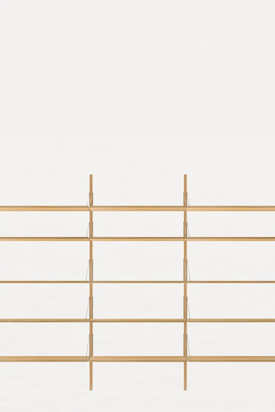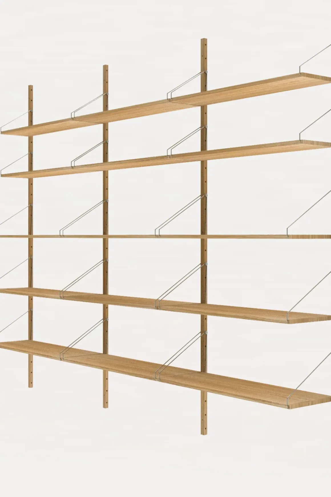 Velkjente Library Shelf komplett hyllesystem fra Frama i naturlig, oljet, heltre eik. Karakterisert av et modulært system og festet med solide stålskruer-og braketter på solide skinner i eik, kan hyllene enkelt plasseres og styles om på en rekke måter. Dette allsidige hyllesystemet egner seg til ethvert rom med sitt minimalistiske og stramme design, og kombinasjonen av rustfritt stål og lun, oljet eik passer perfekt inn i de skandinaviske hjem. Library Shelf er enkel å montere, og hver enkelt hylle kan holde ca. 15 kg (avhengig av veggmateriale og montering). Systemet er svært fleksibelt, og hver hylle kan flyttes rundt og tilpasses med tilleggsprodukter fra samme serie.