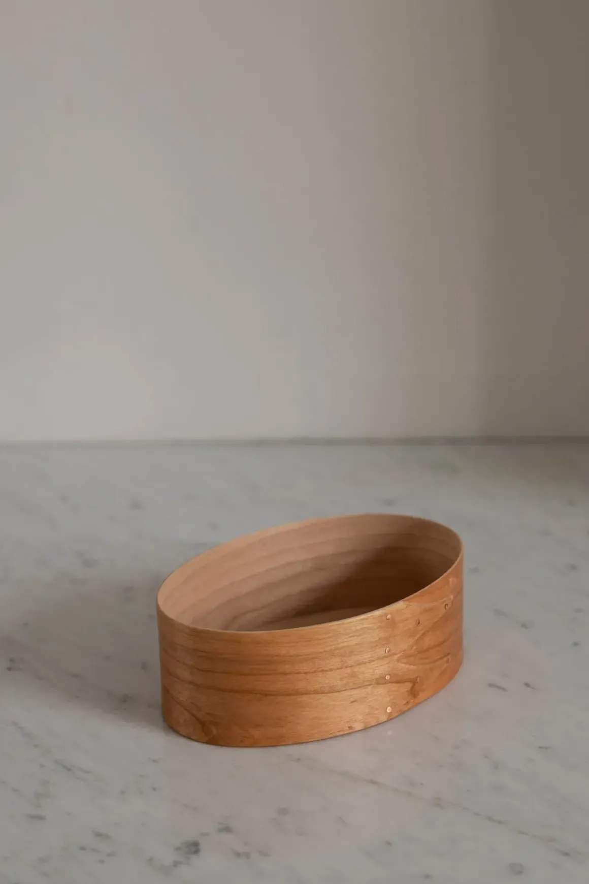 Vakker boks i kirsebærtre fra danske Shaker. De ovale Shaker-boksene er essensen av klassisk håndverk og tidløs design og er håndlaget på samme måte som de har gjort de siste 250 årene. Boksen er laget av kirsebærtre med kobbernåler og små trepinner, og er nøysomt utformet. Bruk den som dekor, oppbevaring eller en kombinasjon av begge. Boksene finnes i flere størrelser og som smykkeskrin.