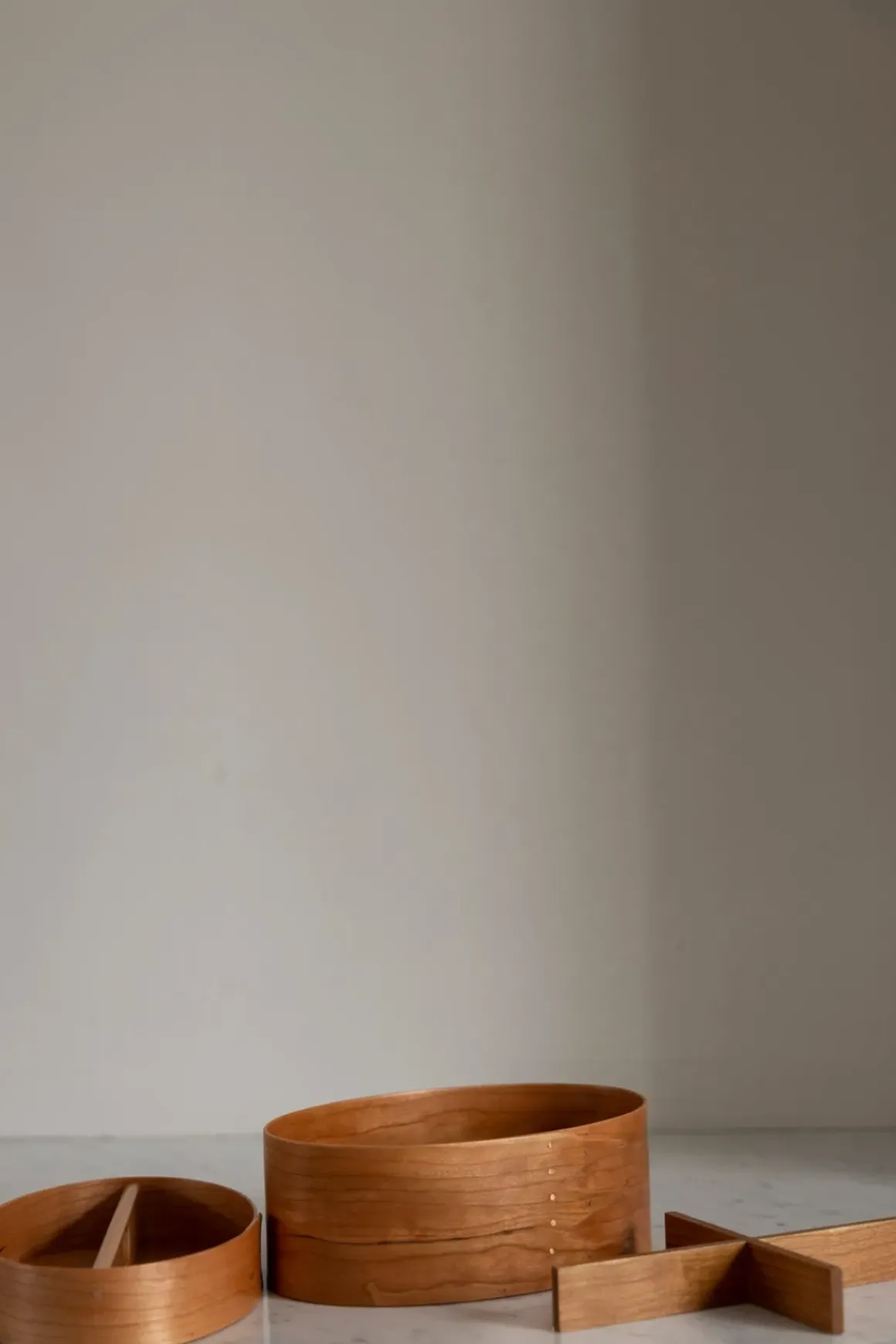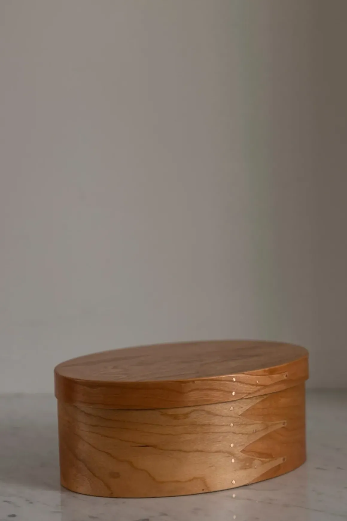 Vakker boks i kirsebærtre fra danske Shaker. De ovale Shaker-boksene er essensen av klassisk håndverk og tidløs design og er håndlaget på samme måte som de har gjort de siste 250 årene. Boksen er laget av kirsebærtre med kobbernåler og små trepinner, og er nøysomt utformet. Bruk den som dekor, oppbevaring eller en kombinasjon av begge. Boksene finnes i flere størrelser og som smykkeskrin.