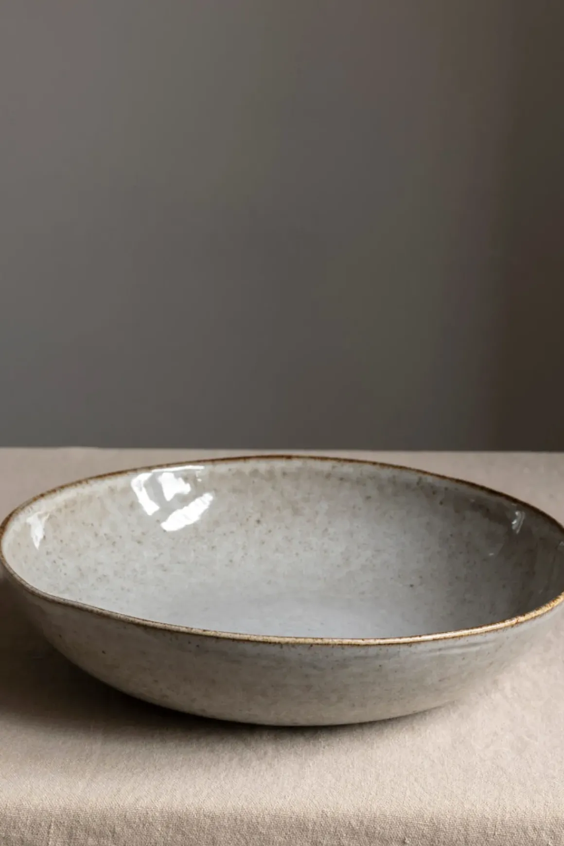 Stor skål i glasert steingods fra Tell Me More. Skålen er sterk, holdbar og den fine glasuren gir hver og en et unikt utseende som vil friske opp borddekningen din. Veldig fin alene, eller bland med annet servise i forskjellige teksturer og farger for et spennende og innbydende utseende. Siden hver skål er unik kan fargen og utseende variere litt fra bildet. Kan vaskes i maskin.