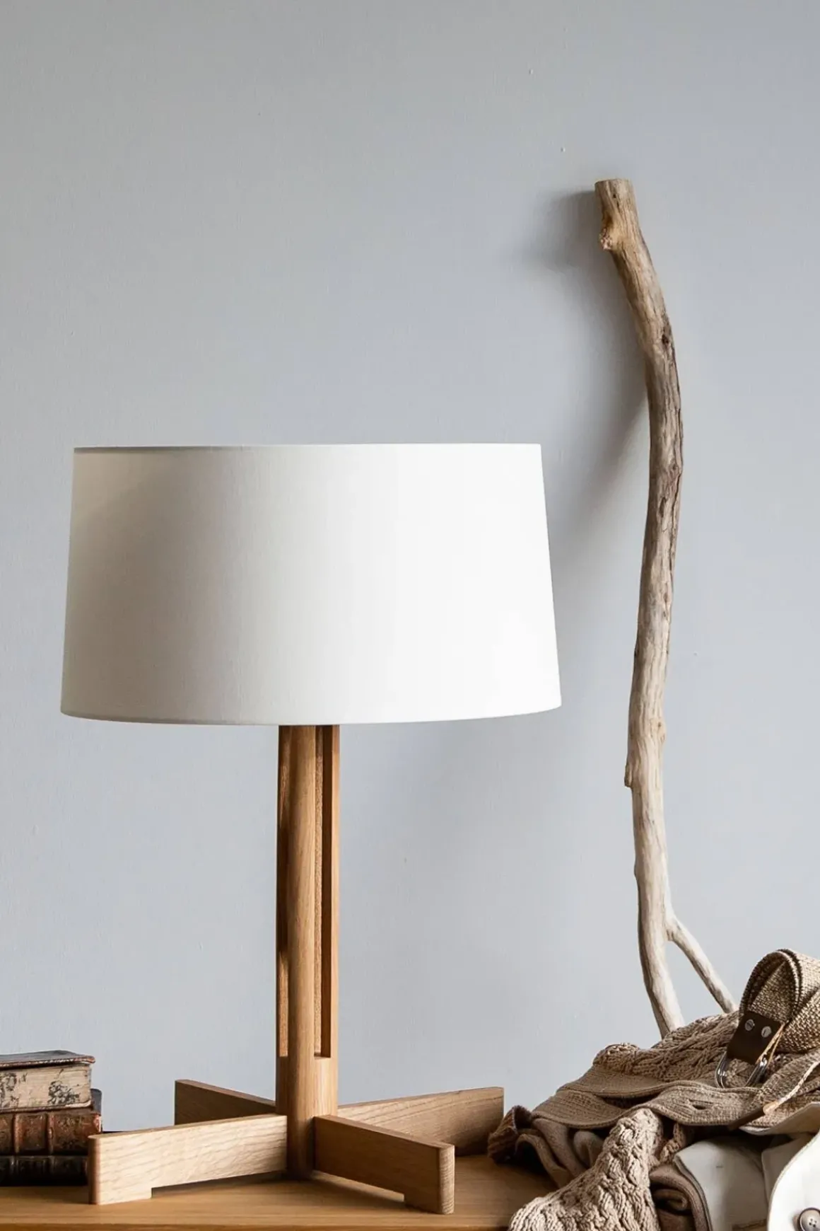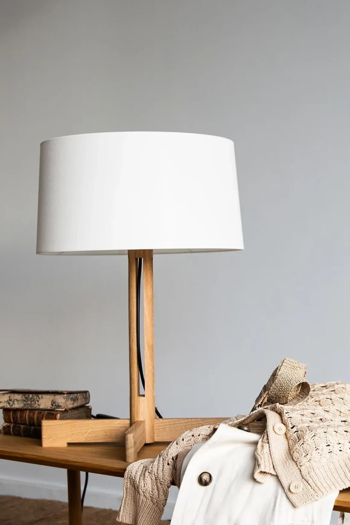 - Materiale: Base av eik, lampeskjerm av lin