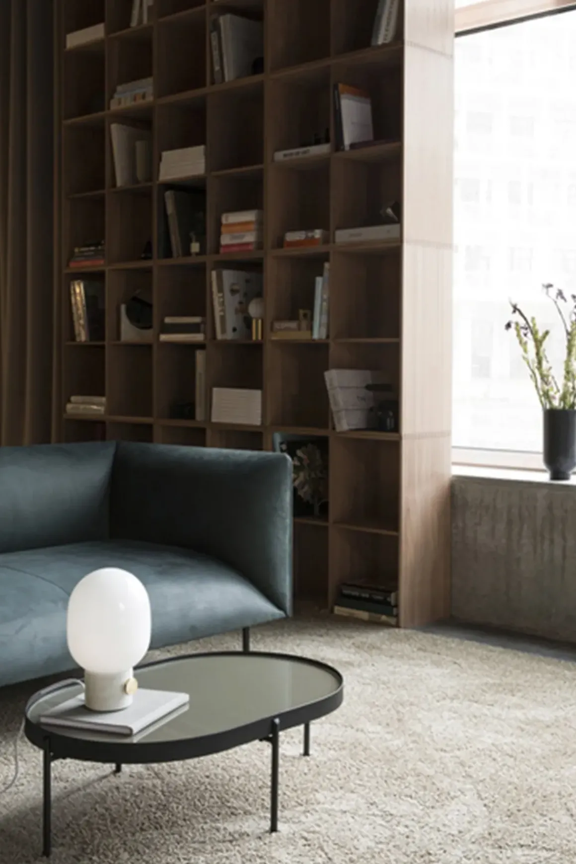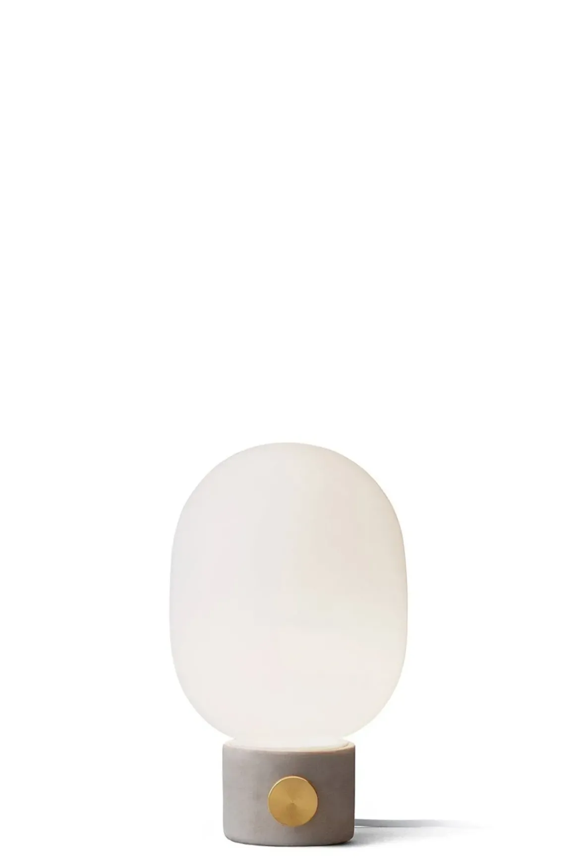 Stilfull og minimalistisk bordlampe designet av Jonas Wagell bestående av en glasskuppel i opalglass og base av sement. Lampen har en industriell bryter i messing med dimmer, mens den ovale kuppelen bidrar til et mykt lys som passer godt på både bord og skrivebord, på kommode, bokhylle og i vinduskarmen. Den har en 2 meter lang, hvit tekstilledning som følger med, lyspære må kjøpes utenom.