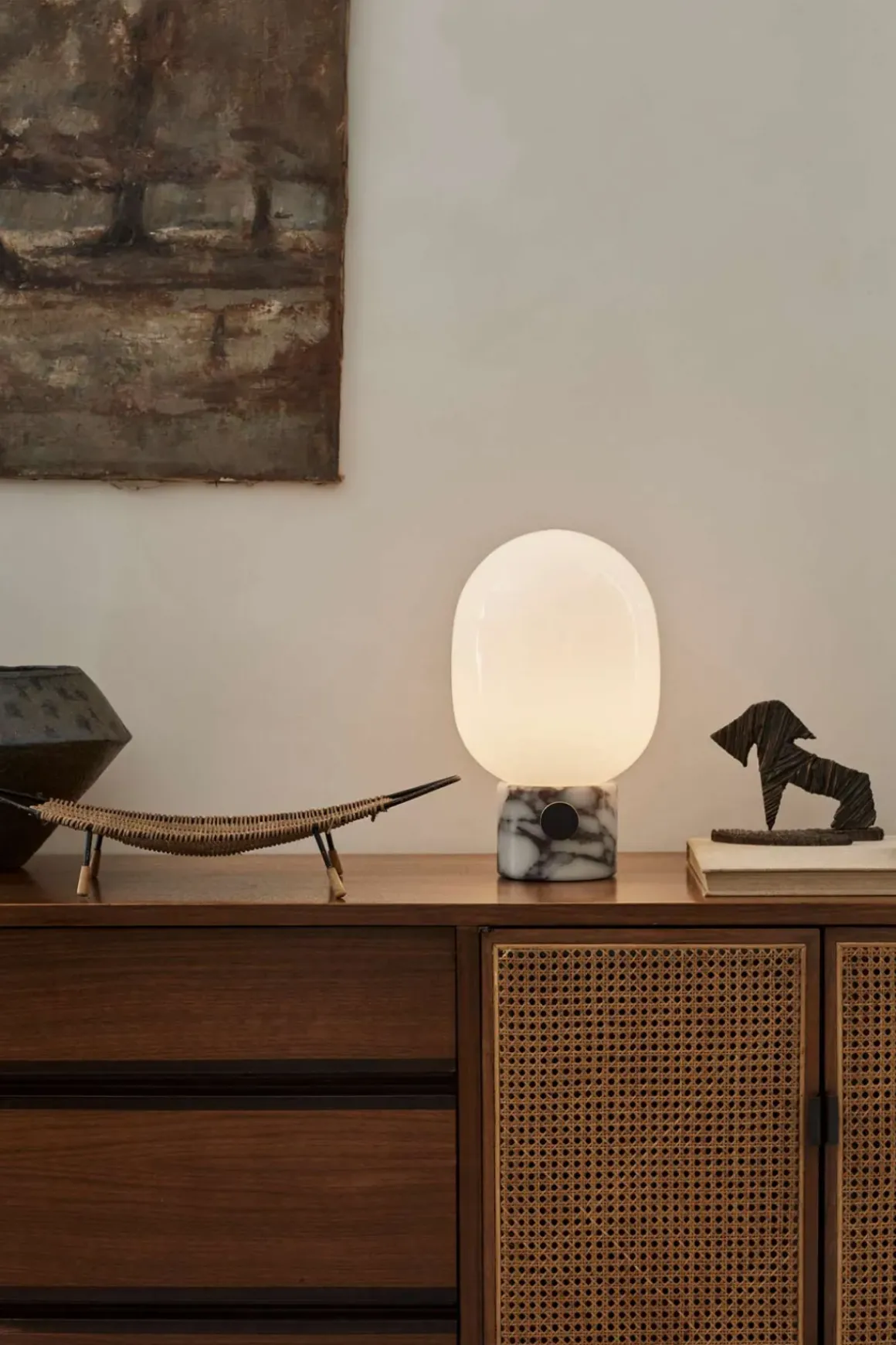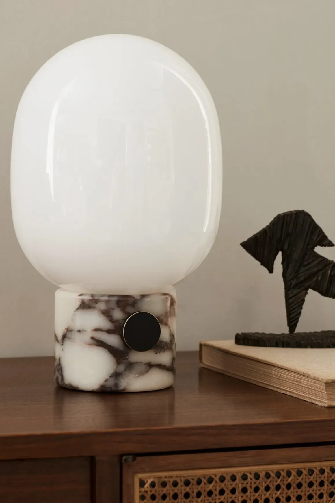 JWDA-bordlampe i ny marmor-drakt, designet av Jonas Wagell. Lampen består av en glasskuppel i opalglass og base av Calacatta Viola marmor. Den unike marmoren har en dyplilla farge som bukter seg rundt basen i unike formasjoner, og gir et organisk, særegent uttrykk til hver lampe. Bordlampen har en industriell bryter i sort metall med dimmer, mens den ovale kuppelen bidrar til et mykt lys som passer godt på både bord og skrivebord, på kommode, bokhylle og i vinduskarmen. Den har en 2 meter lang, hvit tekstilledning som følger med, lyspære må kjøpes utenom.