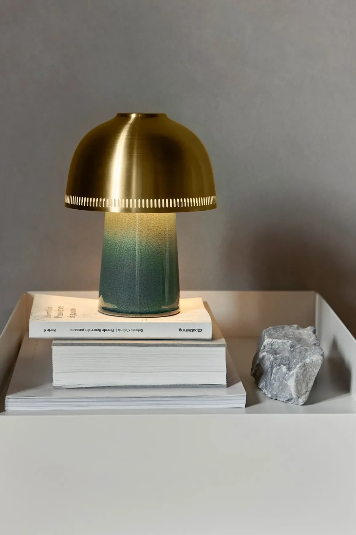 Raku er en oppladbar bordlampe fra u0026amp;Tradition. Raku er designet av Sebastian Herkner og er oppkalt etter den tradisjonelle japanske keramikkteknikken, og er en liten, kompakt lampe med betydelig tilstedeværelse. Lampen henter inspirasjon fra den eldgamle kunstformen og har en håndskulpturert, keramisk sokkel med en spettet, organisk glasur som varierer litt fra lampe til lampe. Lampeskjermen er laget av bronsert aluminium som harmonerer perfekt med basen. Lampen lyser opp til elleve timer når den er fulladet, og den lades enkelt opp med en magnetisk USB-kabel eller et ladebrett, og har dimmer med 3 nivåer slik at du kan stille inn lyset akkurat slik du vil. Raku kan stå hvor som helst i hele huset og brukes på nattbordet, sidebord i stua, eller i bokhyllen. Ønsker du litt stemningsfullt lys ute på kvelden, kan du ta den med ut på terrassen eller balkongen også. Raku finnes også i en annen variant med beigegrå base og lampeskjerm i bronsert aluminium.