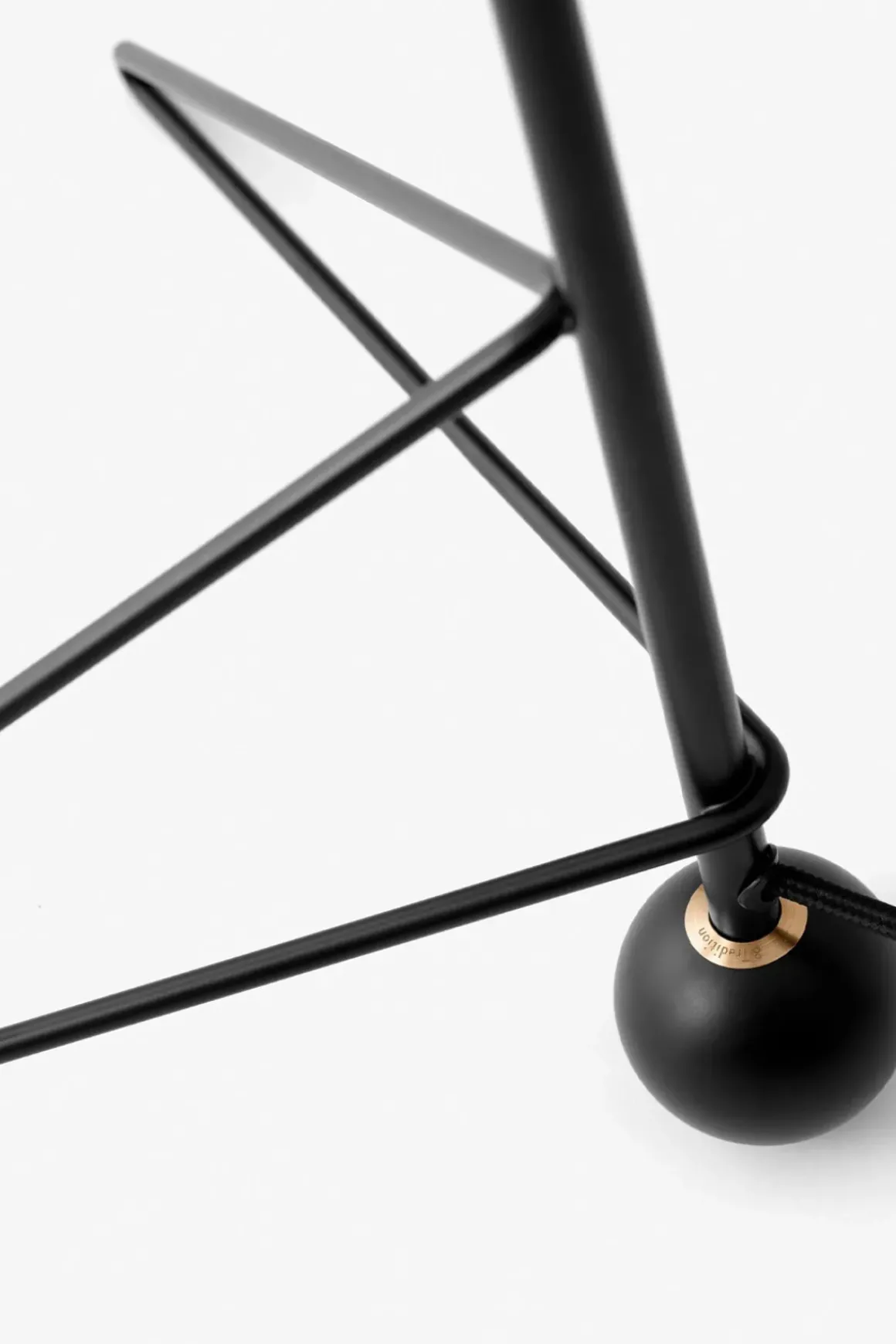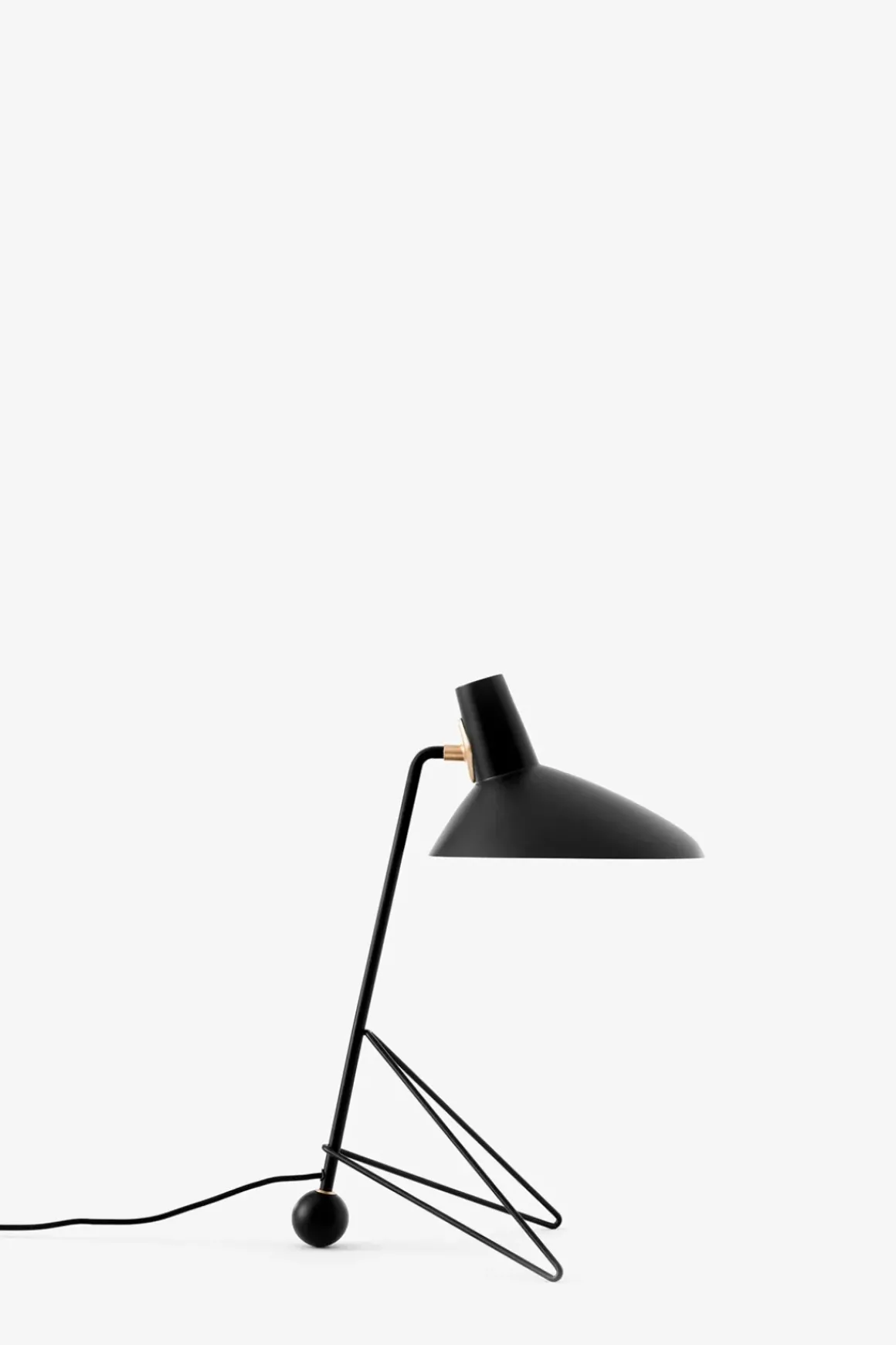 Tripod bordlampe i klassisk sort fra danske u0026amp;Tradition, designet av den København-baserte duoen Hvidt u0026amp; Mølgaard. Etter suksessen med gulvlampen har de utvidet Tripod-serien med bordlampe med samme tidløse design. Tripod gjenspeiler den rene minimalismen til Hvidt u0026amp; Mølgaard som er ansett som gamle mestere i dansk design, og produktene deres gir ofte et skulpturelt element til rommene de står i. Lampeskjermen er spunnet av ett enkelt stykke aluminium, mens basen er laget av bøyde stålrør og sveiset sammen. Detaljer i messing og 2 meter lang sort stoffledning med av/på-bryter som er 60 cm fra selve lampen. Lampen blir deretter lakkert med en satengmatt finish og kommer i tre farger: svart, rødbrun og mosegrønt.