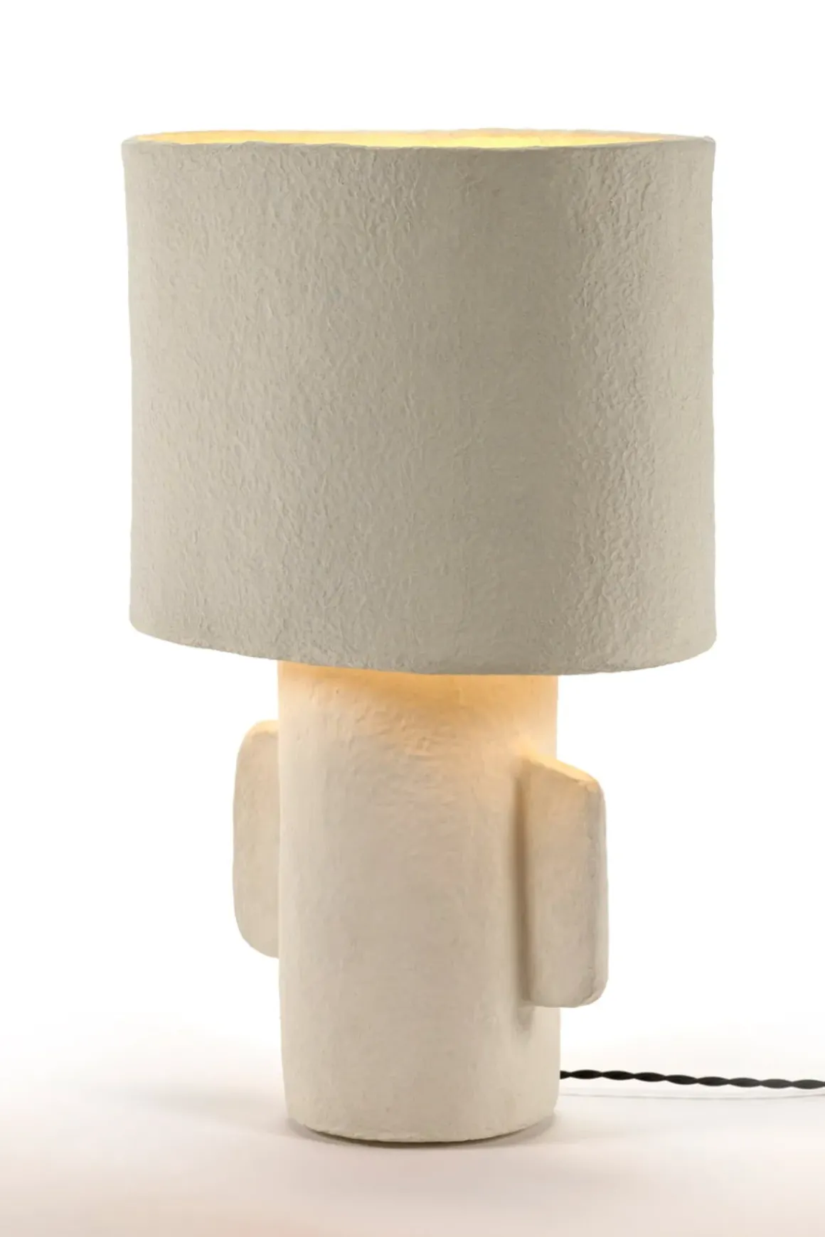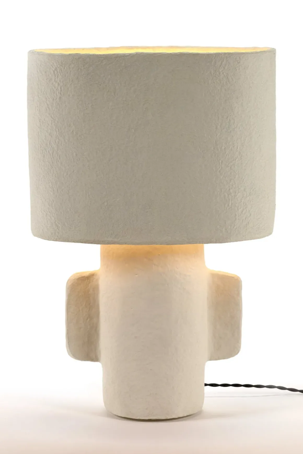 Bordlampe fra Earth-kolleksjonen til Marie Michielssen for belgiske Serax. Earth er en serie bestående av blomsterpotter og vaser i tillegg til denne bordlampen. Alt har primitive former hvor materialet får tale for seg, med et visuelt språk som beveger seg stadig nærmere det skulpturelle. Lampen er laget av pappmasjé som gir den et unikt og taktilt uttrykk slik at den forblir estetisk interessant selv når den ikke er slått på. Bruk den som nattbordslampe eller på et sidebord i stua. Lampen finnes også i en mindre variant.
