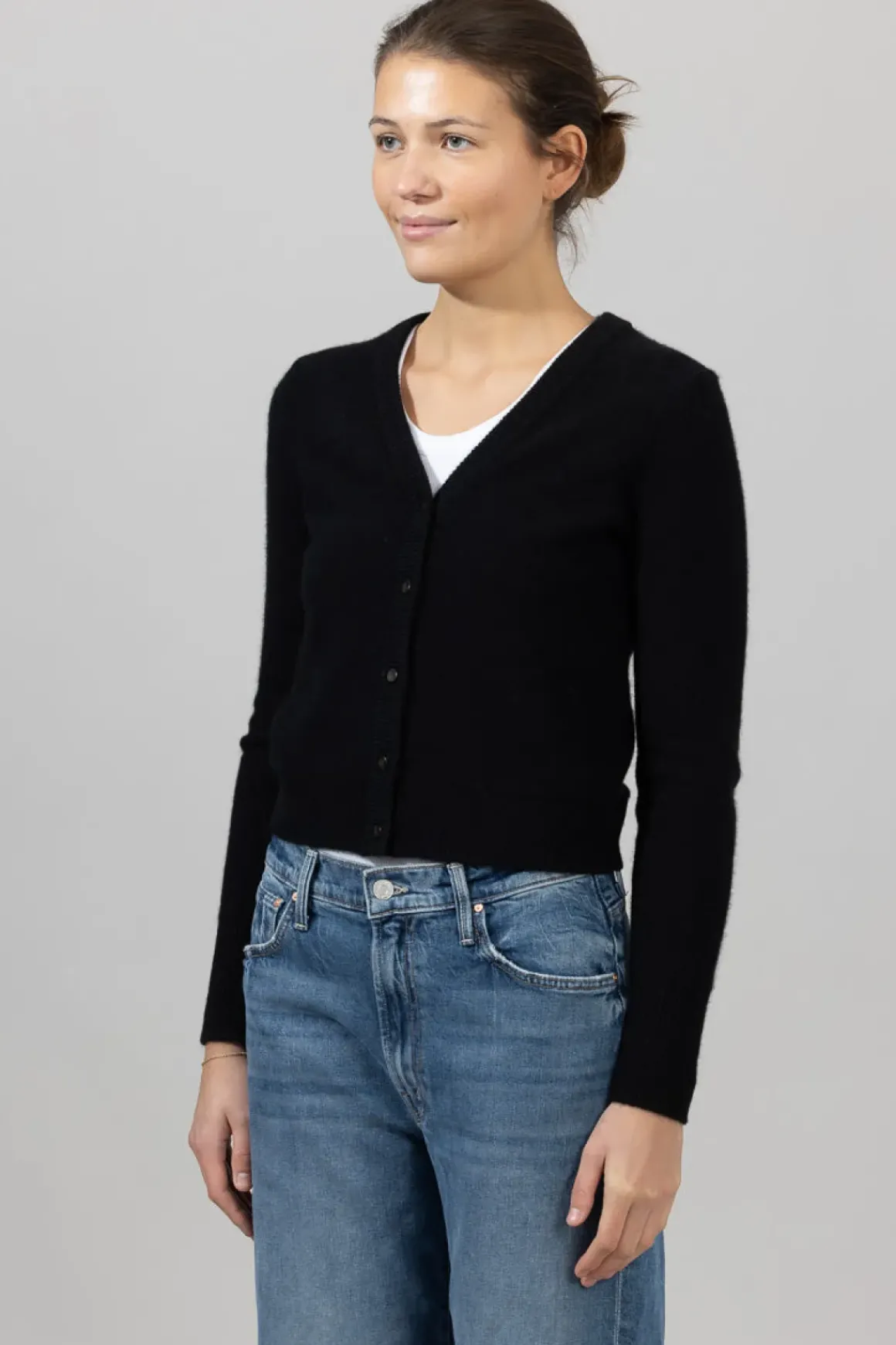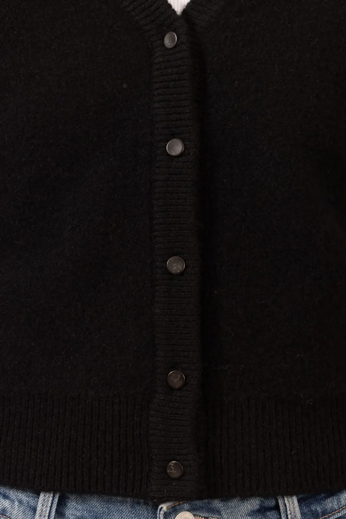 Boiled Button Black fra Vince er en nydelig cardigan i kasjmir. Cardiganen er en tidløs, enkel sort variant som passer til alt. Den er like fin å style med jeans, som den er over en kjole. Du kan også style den med sorte dressbukser, enten lukket slik at man ser de fine knappedetaljene, eller åpen med en tynn bluse eller topp under. Denne allsidige cardiganen gir et sofistikert og gjennomført preg til ethvert antrekk, uansett anledning.