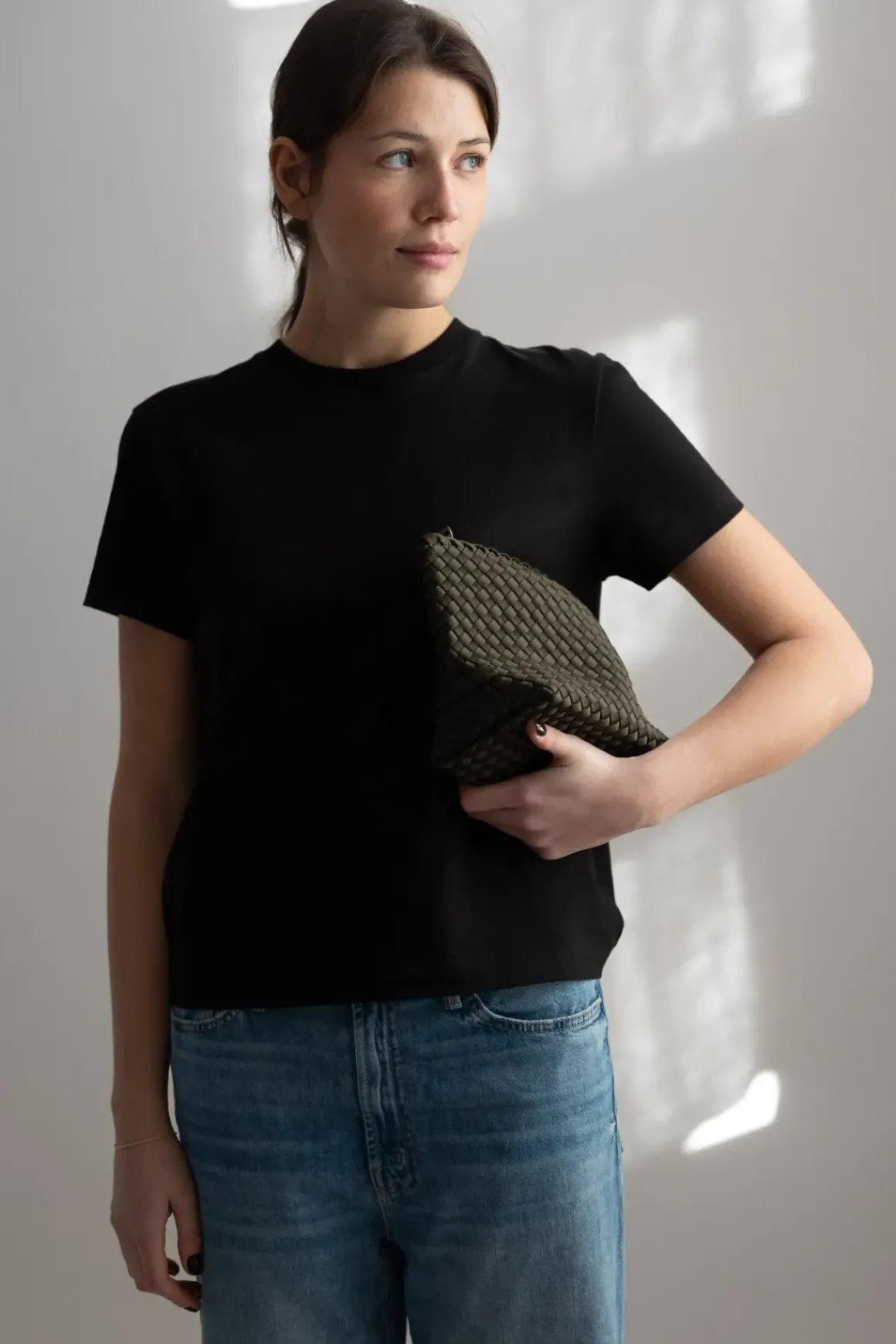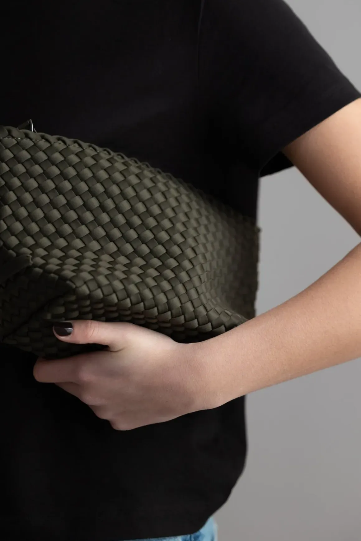 Klassisk clutch i fargen Olive/ grønn i håndvevd neopren. Denne geniale mappen er vanntett og perfekt til å ha sminke, nøkler eller lommebok i, når du har en åpen veske. Kan også brukes som en toalettmappe.