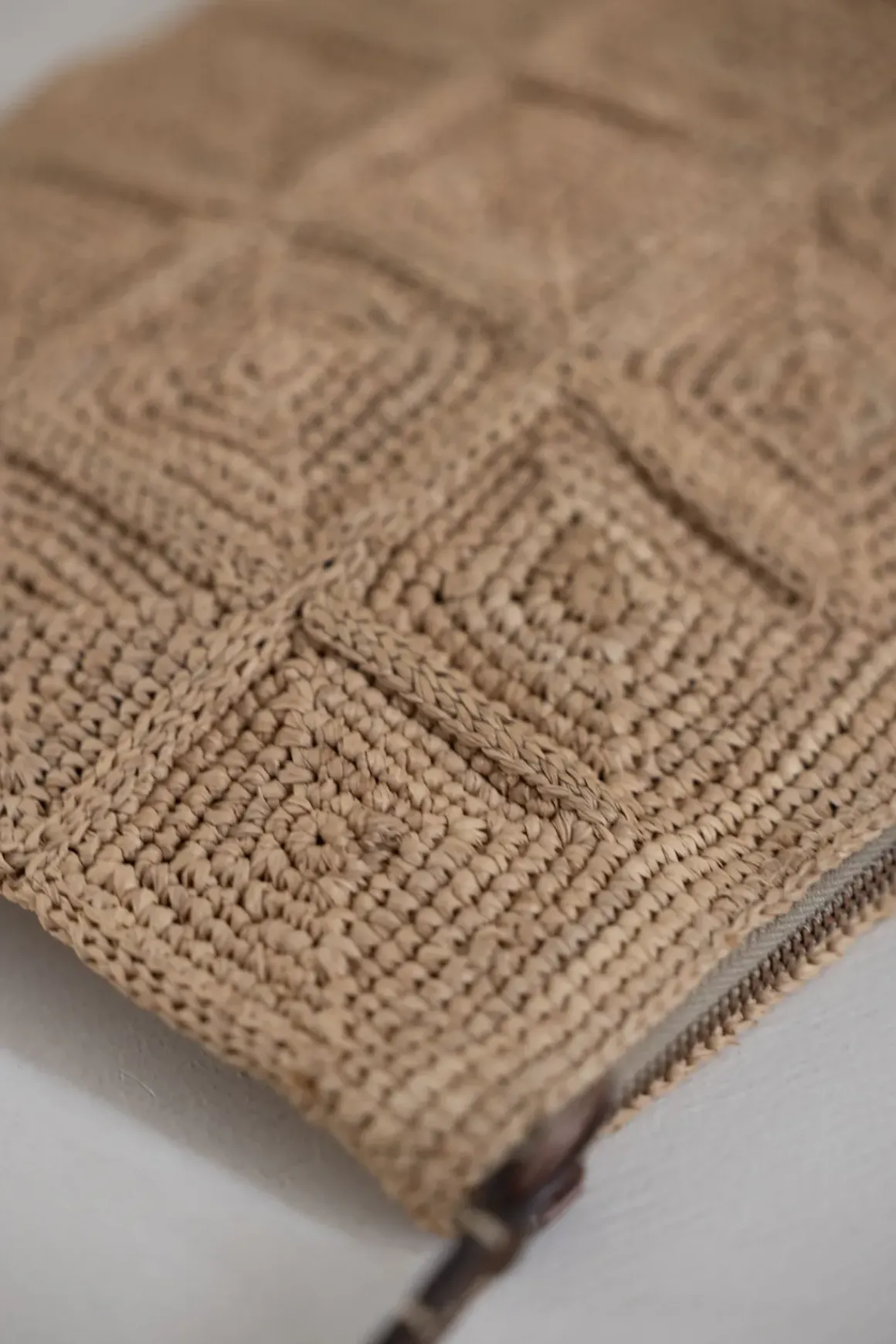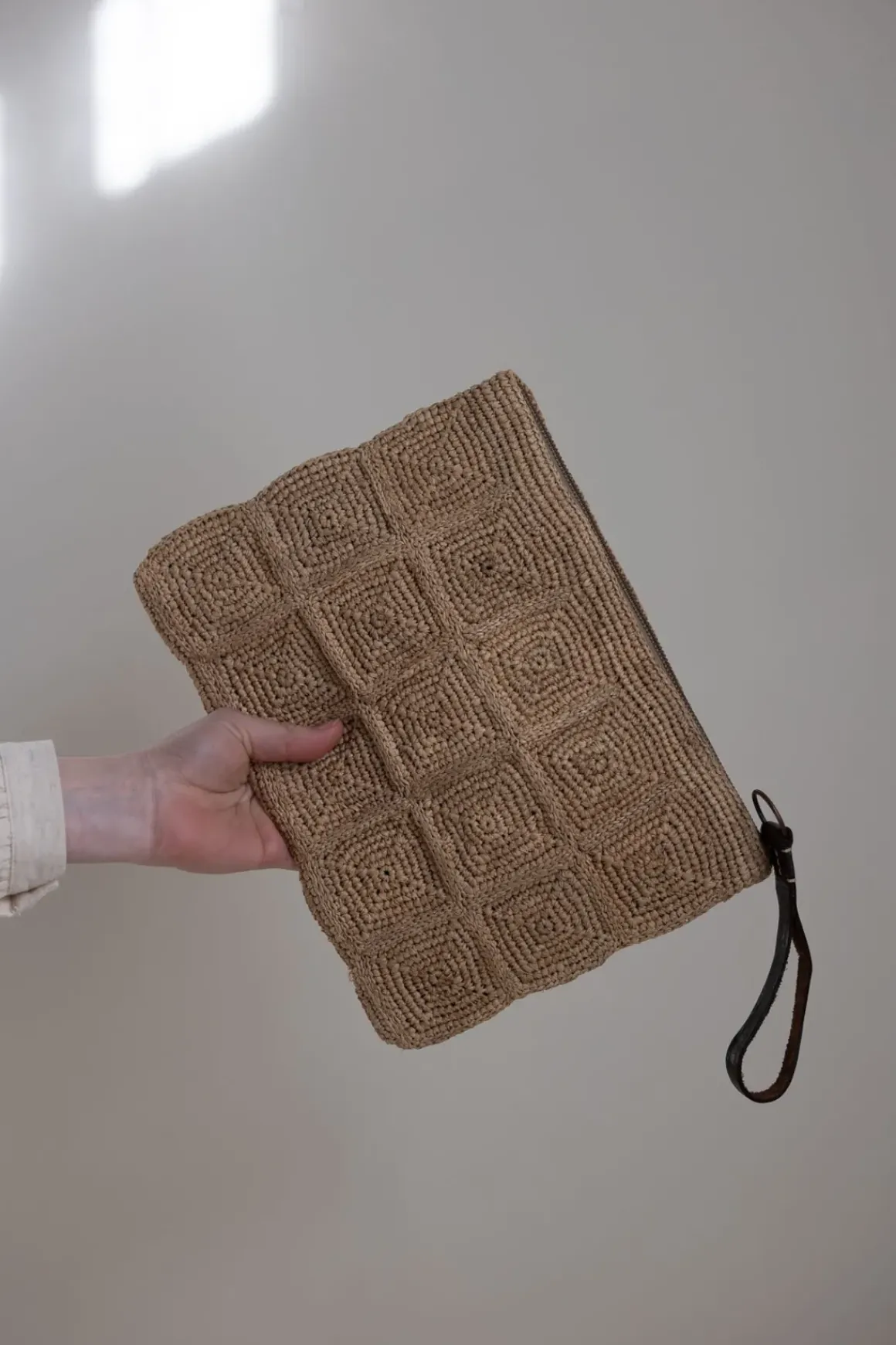 Tanala-clutchen fra Ibeliv er håndlaget i naturraffia og kjennetegnes av sitt unike, rutemønstrede heklearbeid. Navnet betyr «kameleon» på malagassisk – et passende navn for en veske som tilpasser seg både strandliv, hverdagsbruk og fest. Med en praktisk størrelse rommer den det viktigste, og bærestroppen i vegetabilsk garvet sebulær gjør det enkelt å ha den med seg – enten rundt håndleddet eller under armen. Tanala er et lite smykke i garderoben som setter prikken over i-en på både bohemske sommerantrekk og penere anledninger. Hver clutch er nøye heklet for hånd på Madagaskar, og små variasjoner gjør hver veske helt unik. Den er fôret med økologisk bomull og lukkes med en diskret glidelås som holder innholdet trygt på plass.
