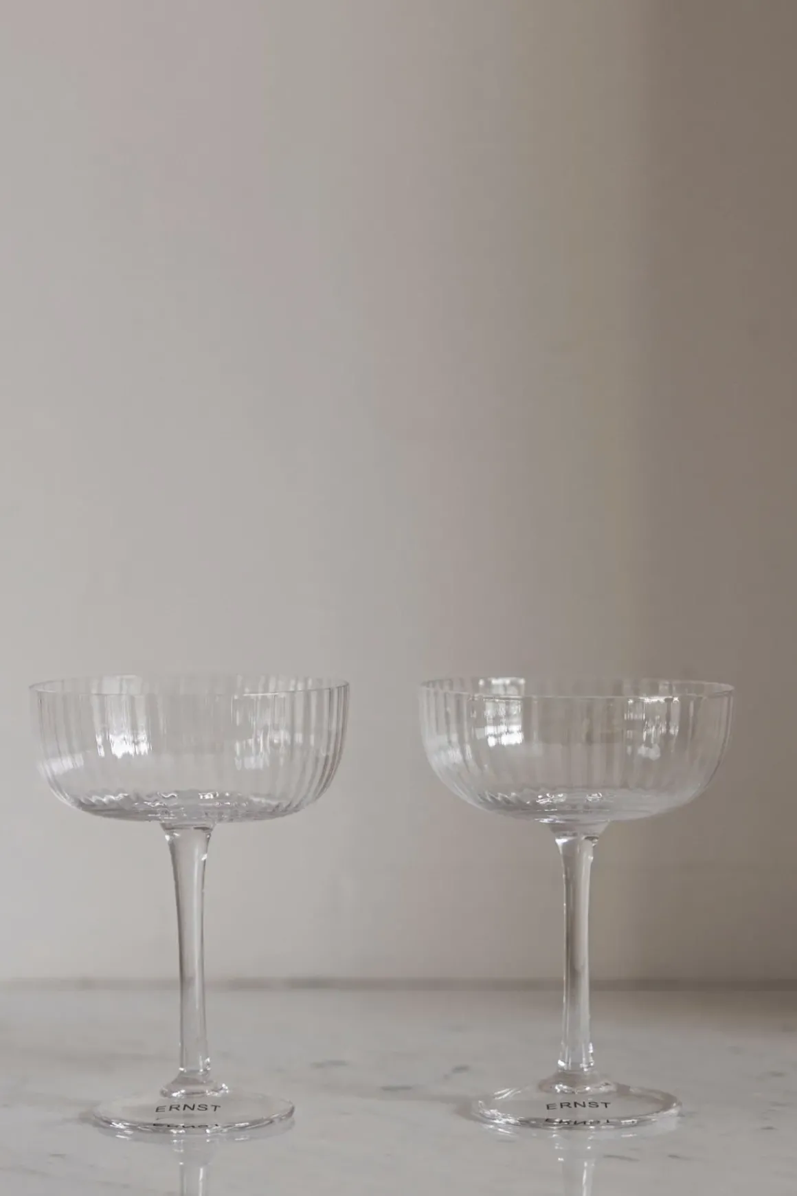 2pk med cocktailglass fra det svenske merket Ernst. Lag en forfriskende cocktail eller nyt et glass sprudlende champagne i disse art-deco inspirerte glassene i riflet glass. Kompletter settet med matchende drikkeglass og karaffel fra samme merke.