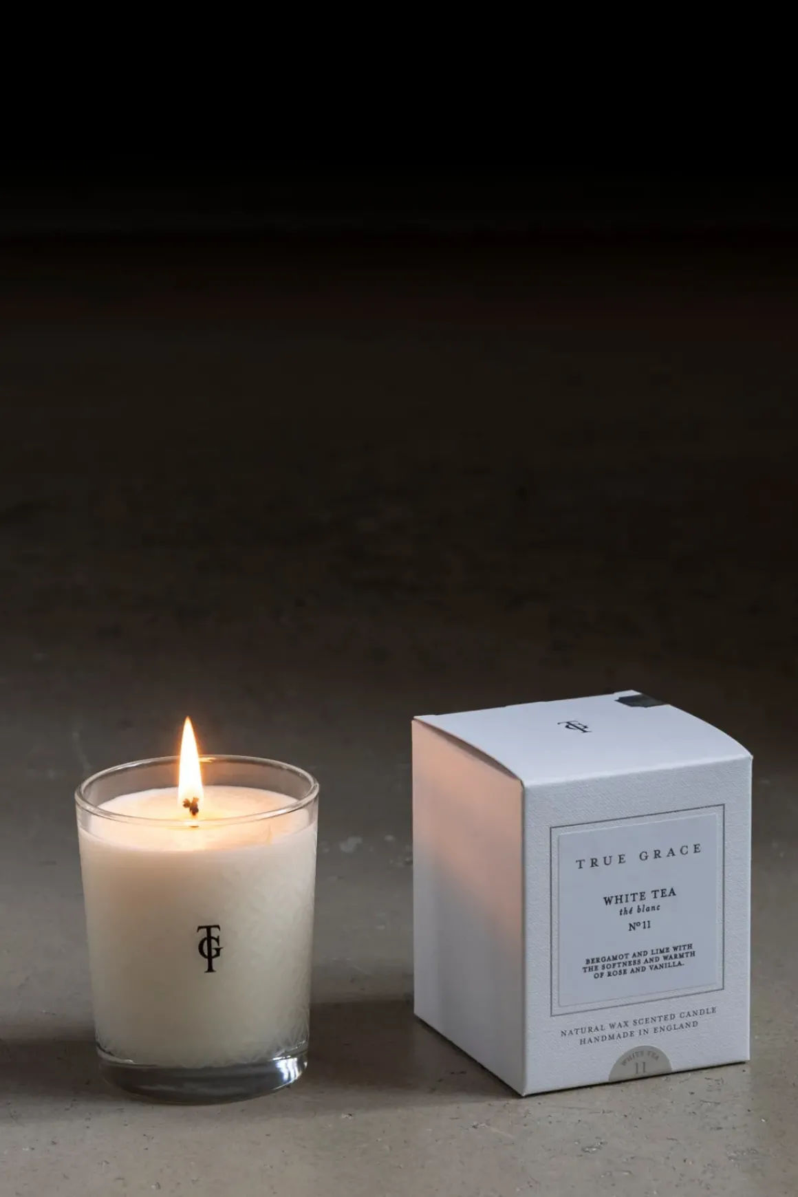 Klassisk, håndlaget duftlys fra engelske True Grace. White Tea er inspirert av livet på landet og er en del av deres «Village»-serie. Duftlyset er 100% naturlig og laget av en unik blanding av fornybar vegetabilsk voks og naturlig voks, med veke i ren bomull. Duftlyset kommer i en vakker glasskrukke med luksuriøs emballasje. Dette blomsterduftende lyset har noter av vanilje, te, musk og rose. Siden lysene kun er laget på naturlig voks, gir de ikke hodepine slik andre (rimeligere) varianter har en tendens til å gjøre. Lysene brenner i hele 40 timer. Vårt tips er å brenne lyset kun til duften har satt seg i rommet, slukk deretter flammen, så varer lyset enda lenger. Husk å trimme veken etter bruk slik at den ikke er lenger enn 0,5 cm, så unngår man sot inni glasset. True Grace har vært på Bolina i en årrekke og er en favoritt blant oss og våre kunder.