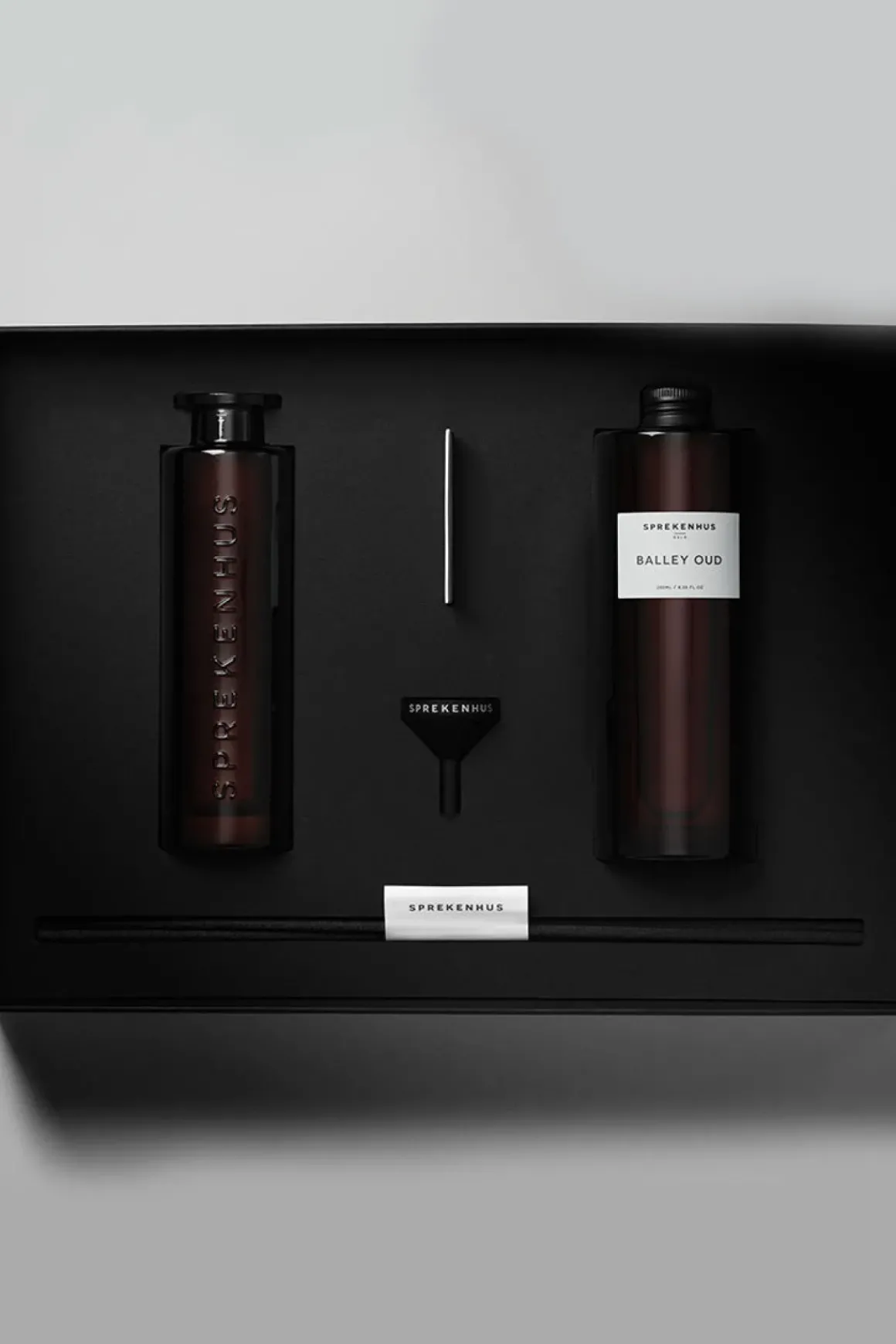 Duftpinner fra norske Sprekenhus. Settet inkluderer en refillbar glassflaske, duftpinner og en påfyllingsflaske med duftolje. Duften Balley Oud er en hyllest til de som verdsetter unike dufter. Den er inspirert av ørkensandens skiftende glød under solens lys, og formidler oud-treets mystiske og tidløse karakter. Med en rik blanding av røkelse og bær tolker Balley Oud dybden og mystikken i oud på en fengslende måte, og etterlater en duft som både er varig og fortryllende.