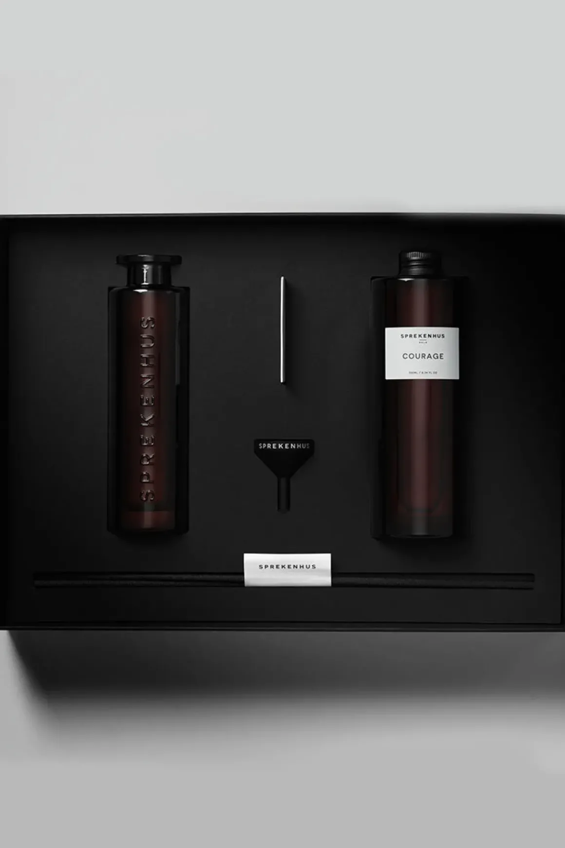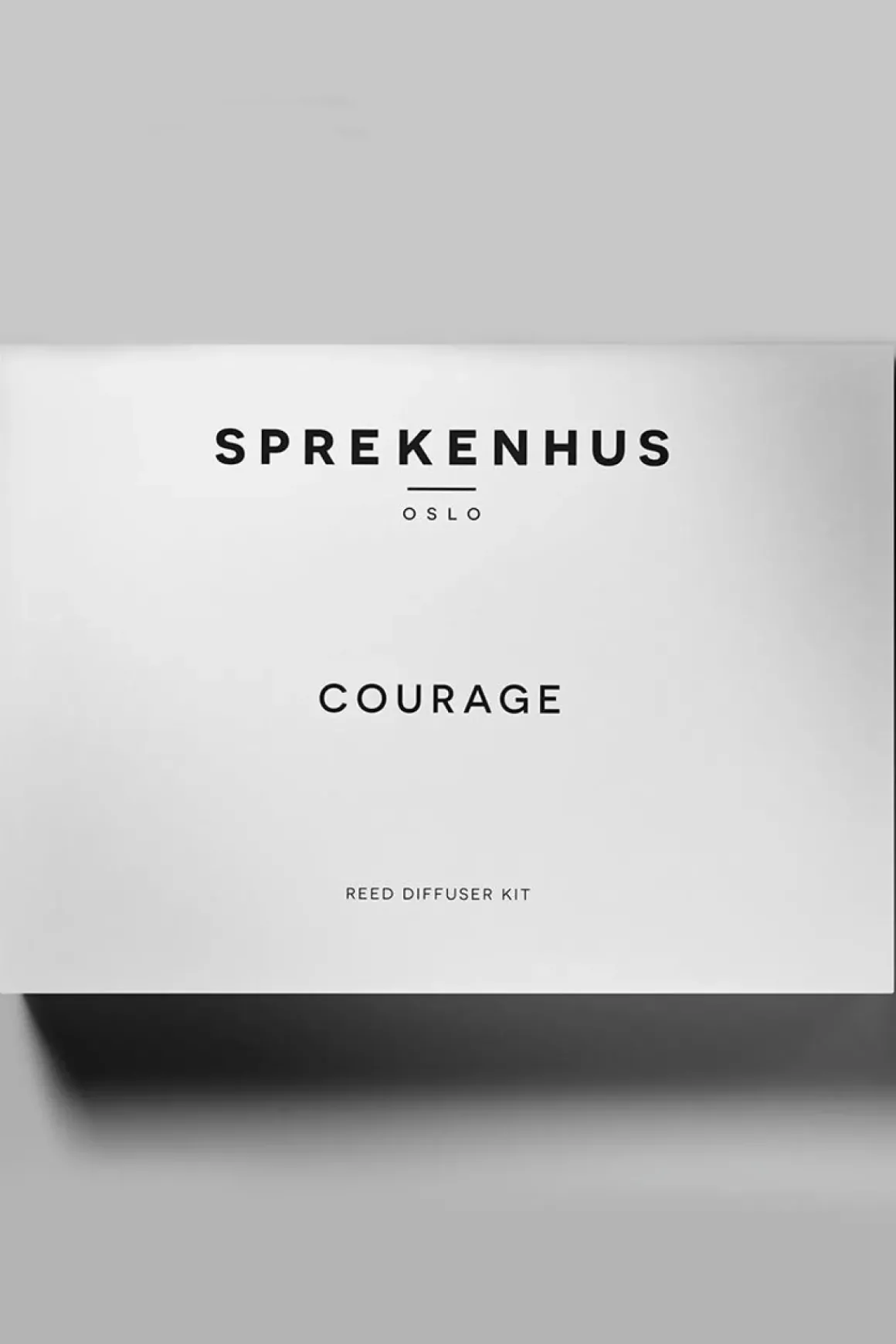Duftpinner fra norske Sprekenhus. Settet inkluderer en refillbar glassflaske, duftpinner og en påfyllingsflaske med duftolje. Courage er en duft som hyller essensen av mot med en balansert kombinasjon av fruktige, søte og varme noter. Den åpner med en fyldig blanding av patchouli, vannmelon og bringebær, som gir en dristig og energisk karakter. Hjertet av duften utvikler seg med varme nyanser av rav og musk, før den avsluttes med en dyp og forførende base av vanilje, karamell og lakris. En duft som inviterer til å utforske styrke og lidenskap.