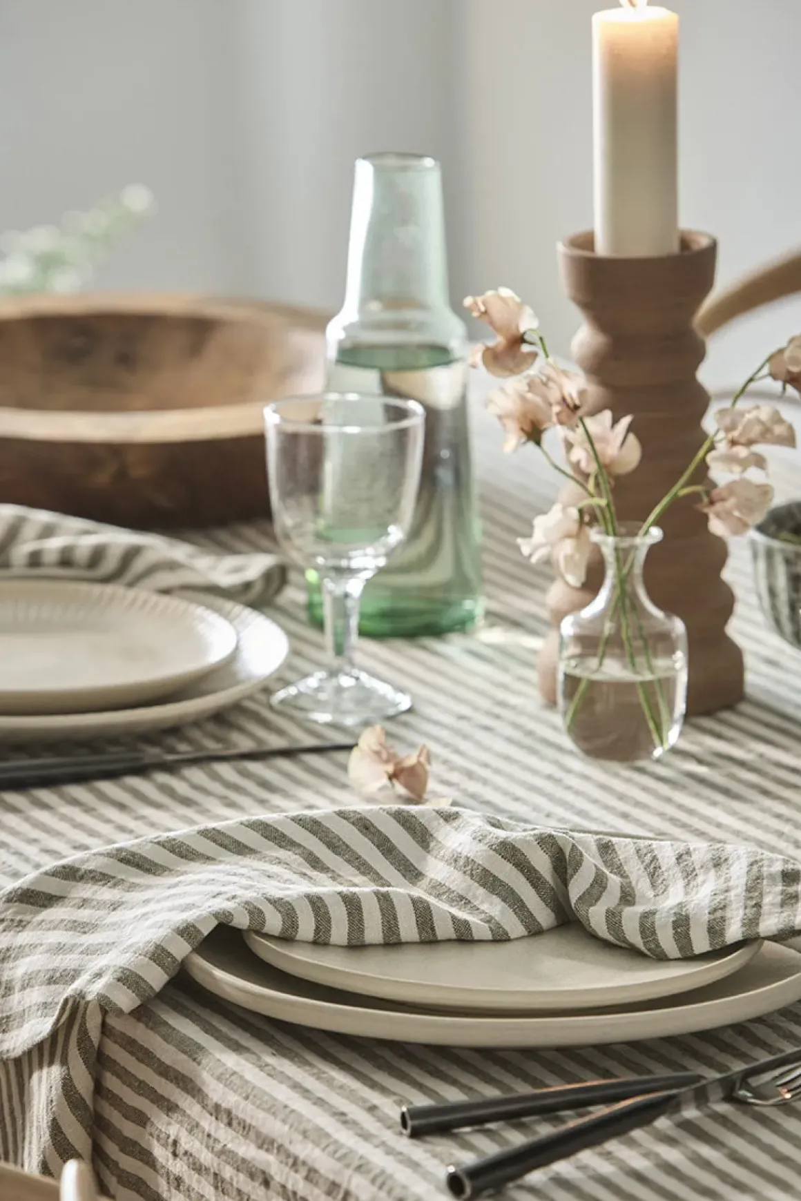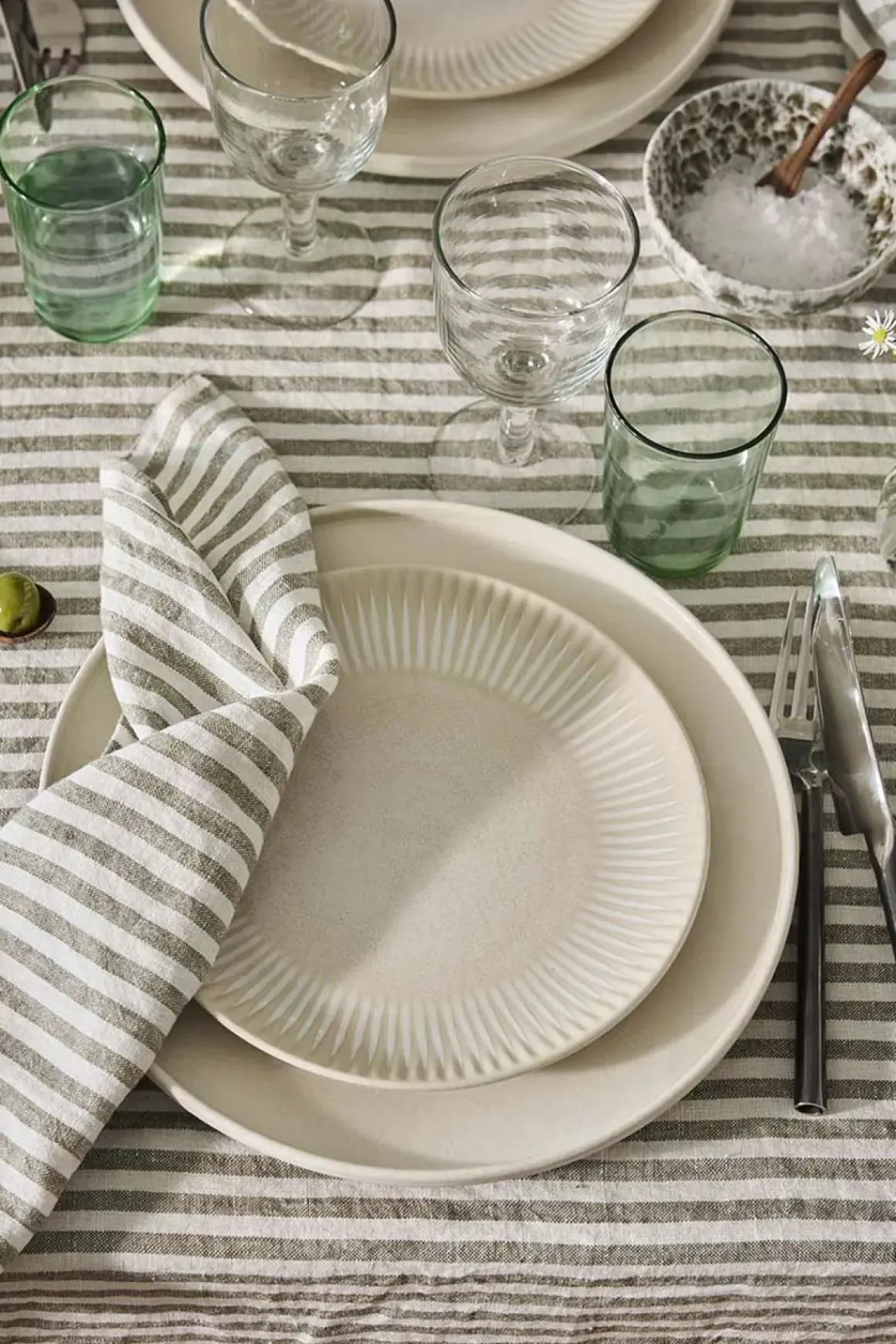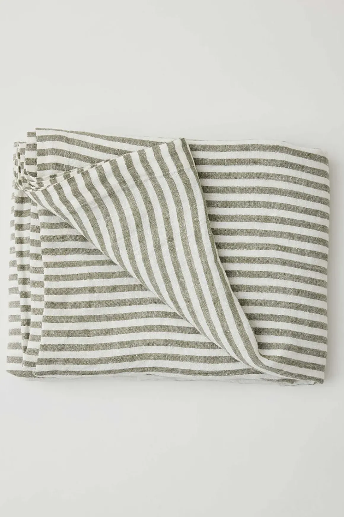 Linduken Leon fra Tell Me More er håndvevd i 100% lin med en dekorativ vevkant som gir et rustikt og tidløst uttrykk. Den grove linstrukturen og de smale stripene i en dempet olivengrønn tone mot den lyse basen skaper en vakker kontrast. Garnet er håndfarget og soltørket, noe som gir naturlige fargevariasjoner og gjør hver duk unik. Perfekt til både hverdagsmåltider og festlige anledninger.