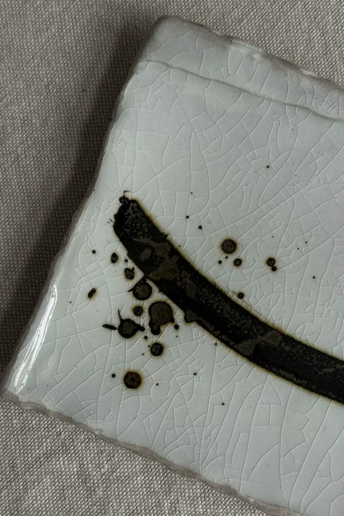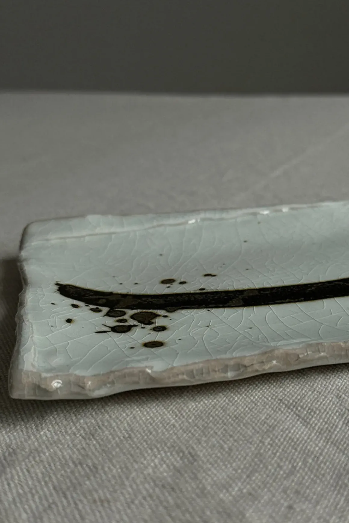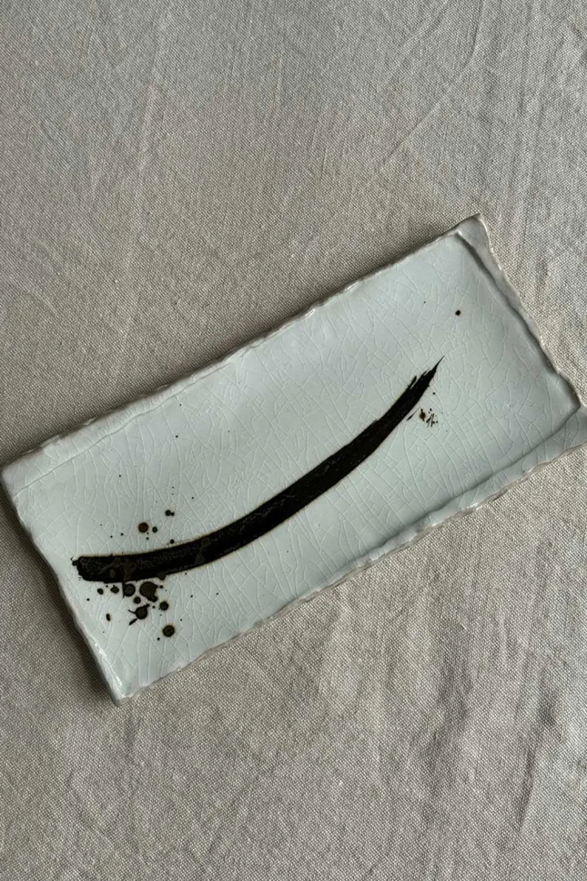 Sushifat i keramikk som kombinerer et moderne uttrykk med tradisjonell håndverksteknikk. Den rektangulære formen og det minimalistiske designet med en håndmalt detalj gir fatet en unik karakter. Overflaten har en subtil, glasert tekstur med fine krakeleringer som tilfører dybde og særpreg. Perfekt til servering av sushi, sashimi eller småretter, samtidig som det fungerer som et dekorativt element på bordet.