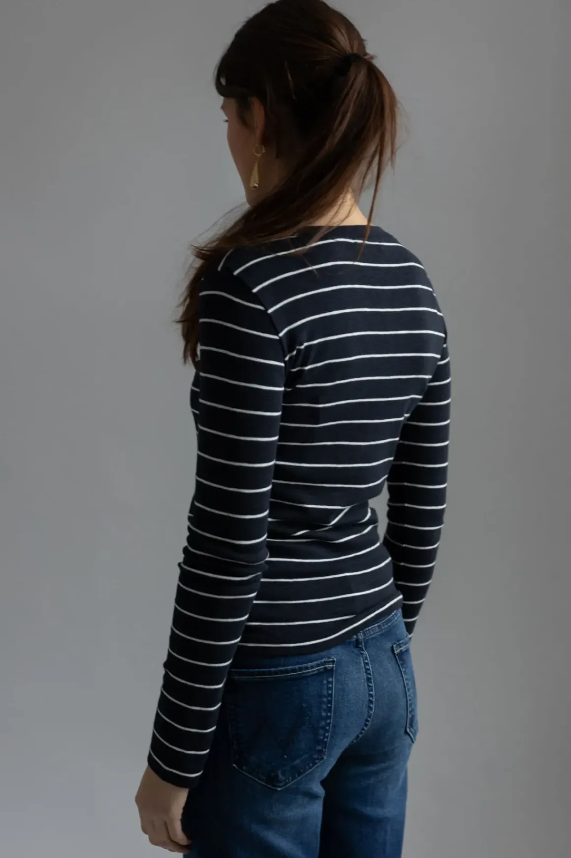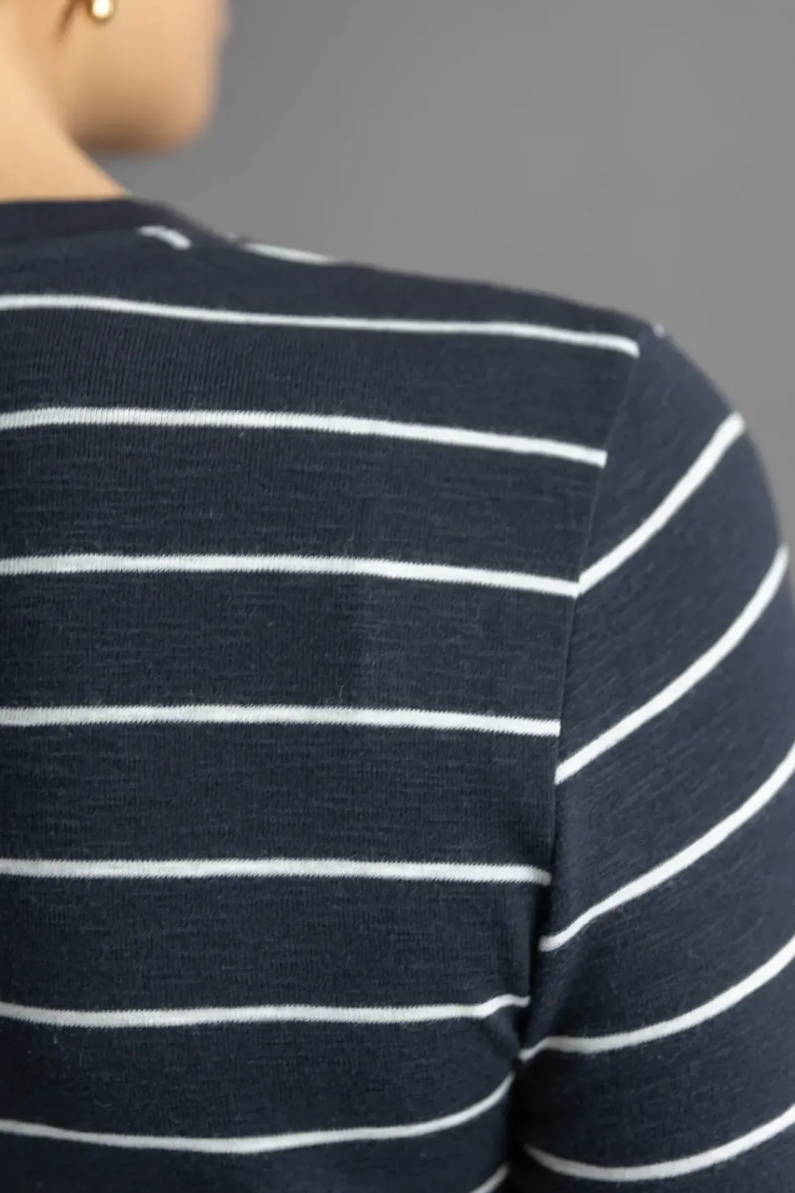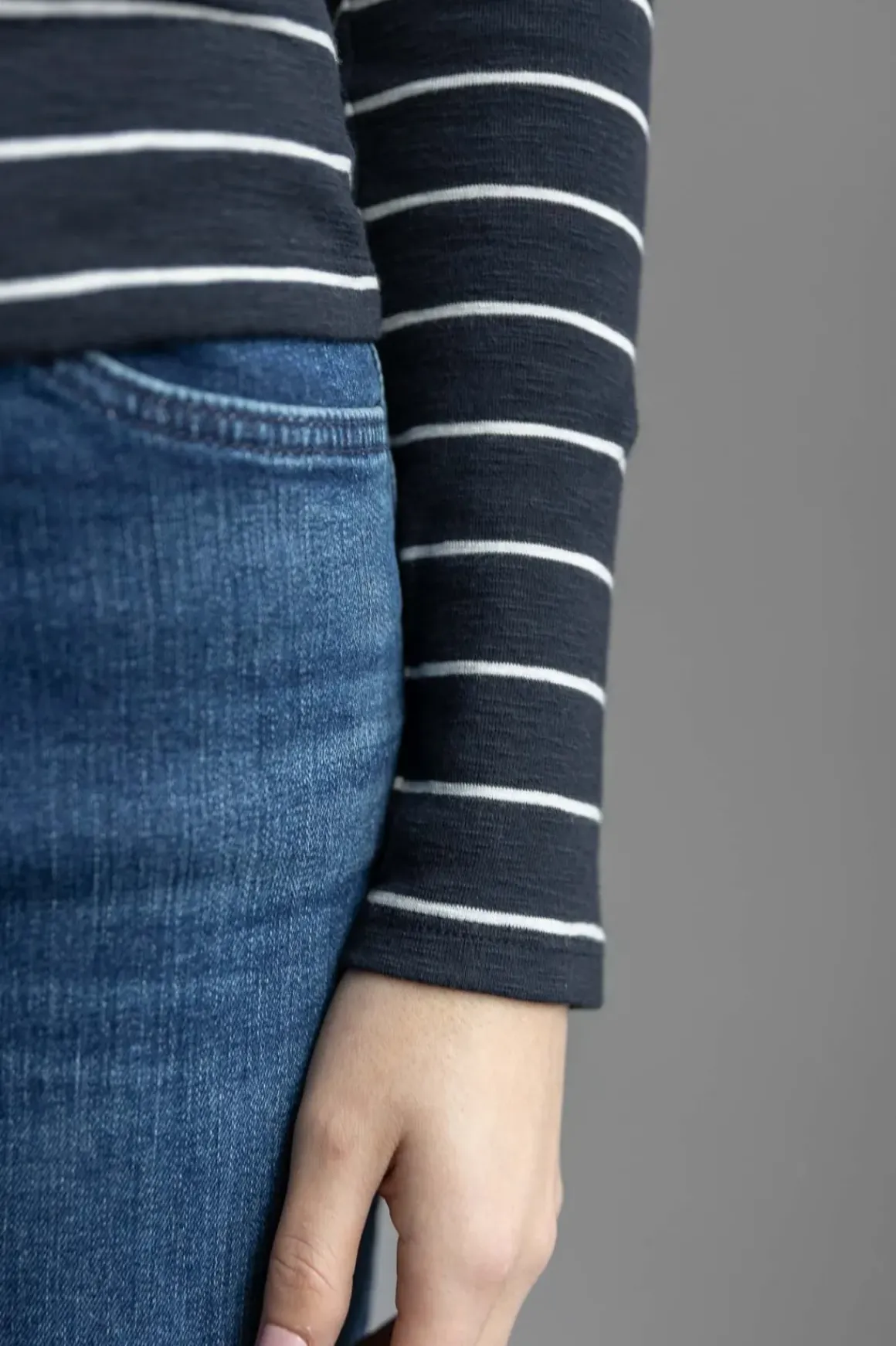 Stripet genser fra Vince i en herlig kombinasjon av 60% bomull og 40% modal. Den lette kvaliteten gjør den til en perfekt base som passer til alt, enten du bruker den alene eller som lag-på-lag. En klassisk favoritt i garderoben du alltid kan vende tilbake til.