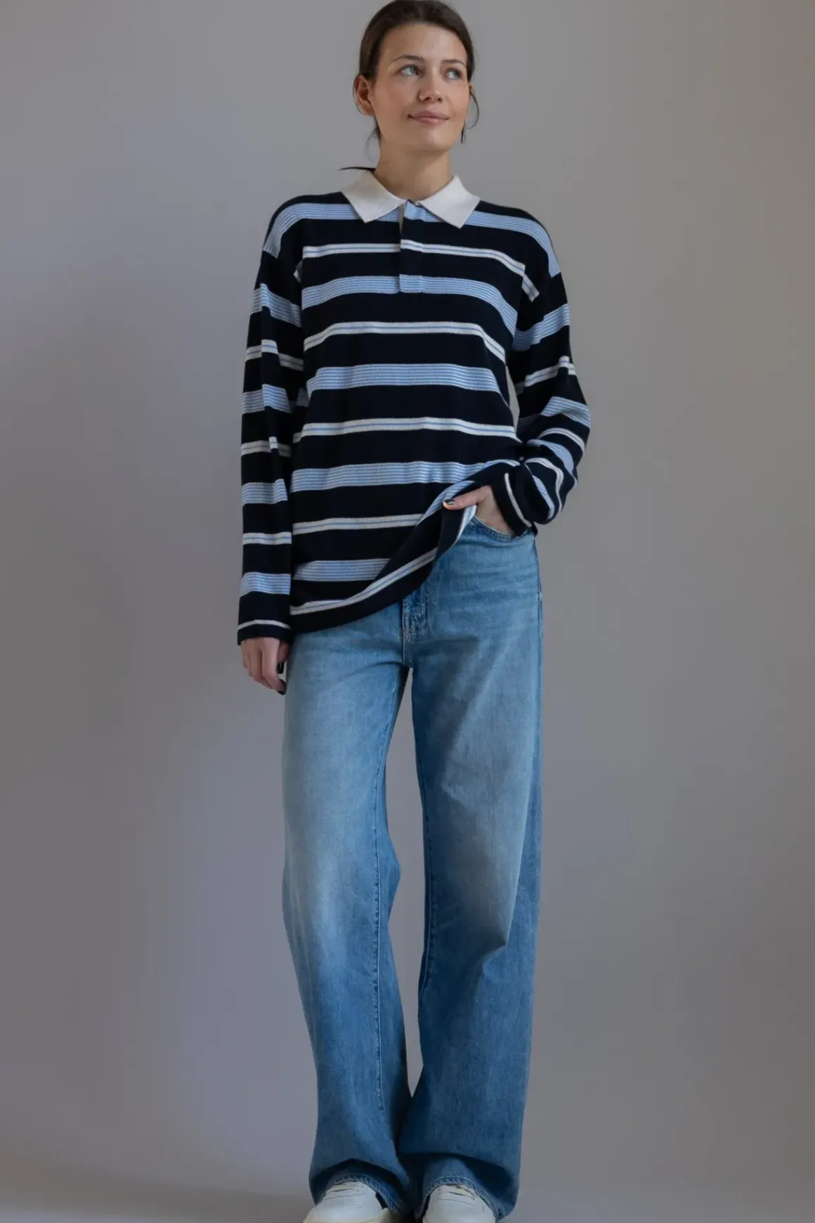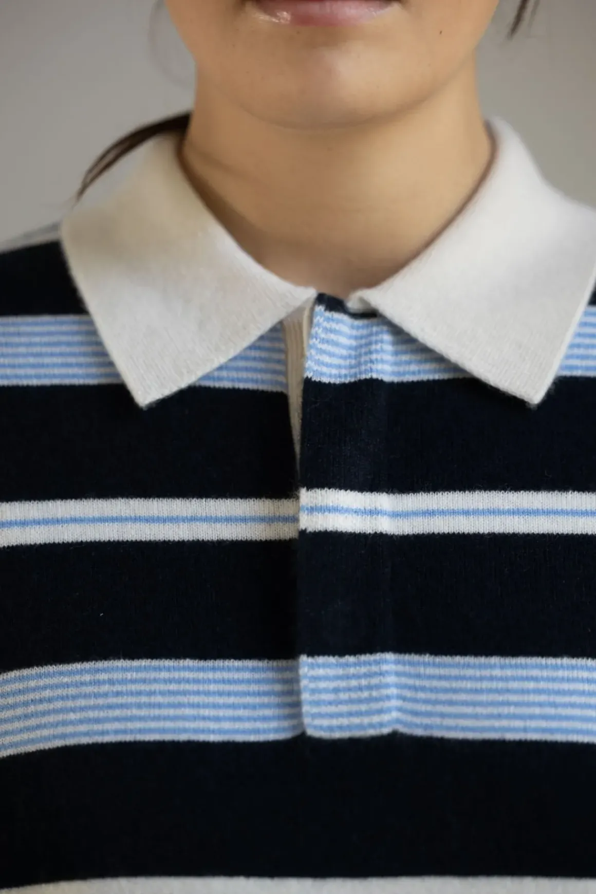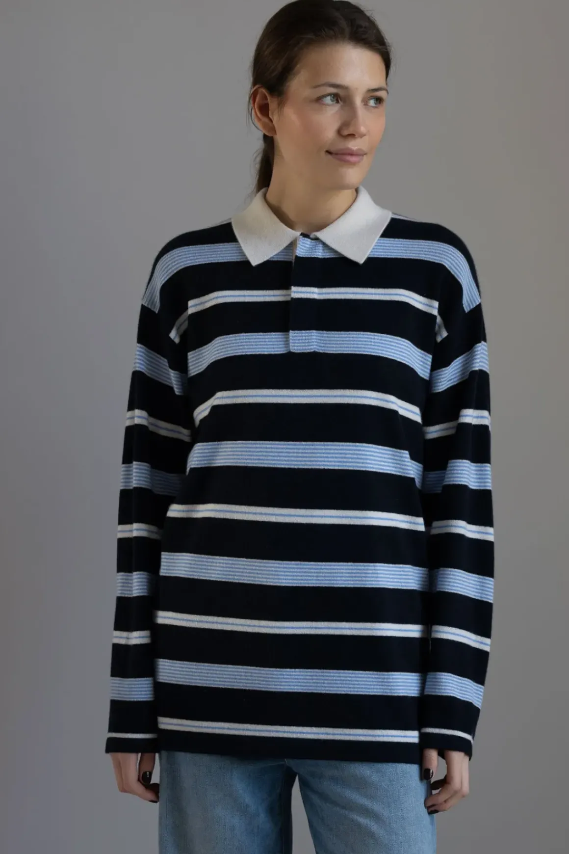 Klassisk rugby-genser fra Guest in Residence har raskt blitt et kjennetegn for merket, med inspirasjon hentet fra den klassiske rugbytrøyen. De ikoniske stripene gir et retro uttrykk, mens den romslige passformen gir den en avslappet følelse. Rugby-genseren er supermyk og føles luksuriøs mot huden. Genseren har en krage med skjult tre-knapps lukking og små sidesplitter nederst. Laget av kasjmir av førsteklasses kvalitet, er dette en genser du alltid vil føle deg vel i. Like kul til fest og morro som til hverdags.