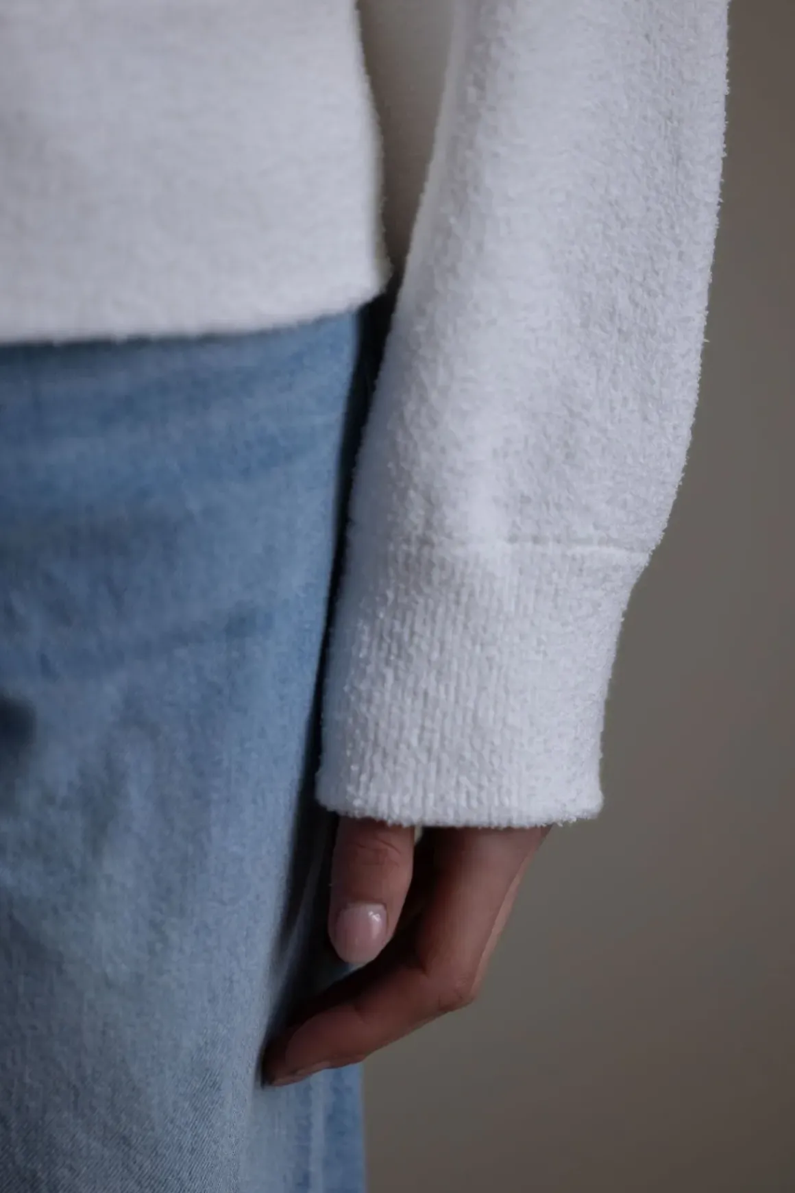 Genser fra Vince med avslappet, sweatshirtsinspirert silhuett og en myk, boucléstrikket kvalitet. Den er dobbeltstrikket i en bomullsblanding som gir en lett strukturert, frottélignende følelse – både myk og holdbar. Genseren er konstruert uten skuldersømmer for et renere uttrykk, og har ribbestrikkede kanter som holder fasongen. Et moderne baseplagg med subtil tekstur.