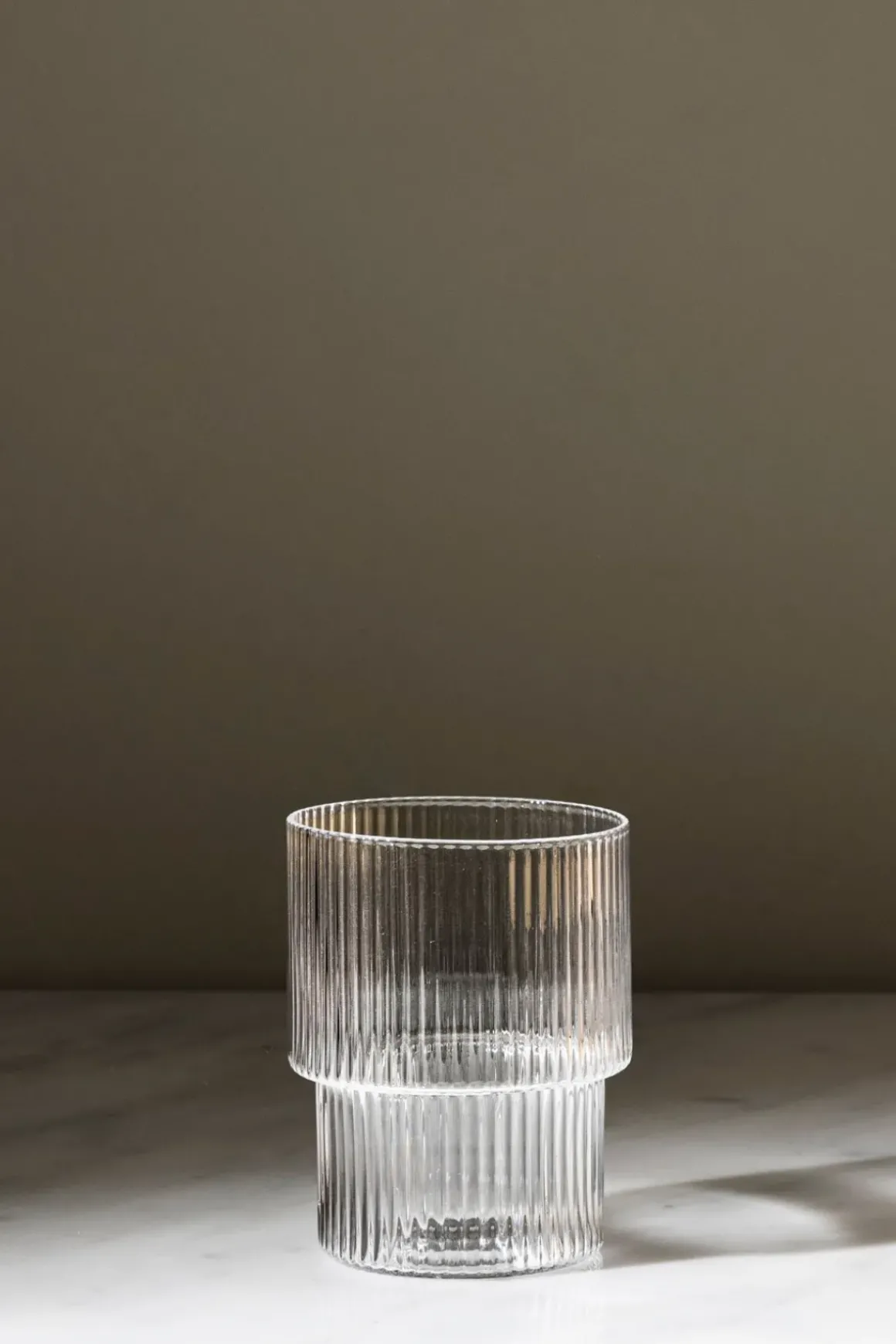 Munnblåst vannglass i serien Ripple fra Ferm Living. De har latt seg inspirere av 20-tallet i denne serien. De vertikale ripplene gir et sterkt og sofistikert utseende, og de varierte geometriske stettene gjør glassene ekstra spesielle. Server med matchende karaffel til frokost, lunsj eller middag. Kan brukes både som vann og drinkglass.