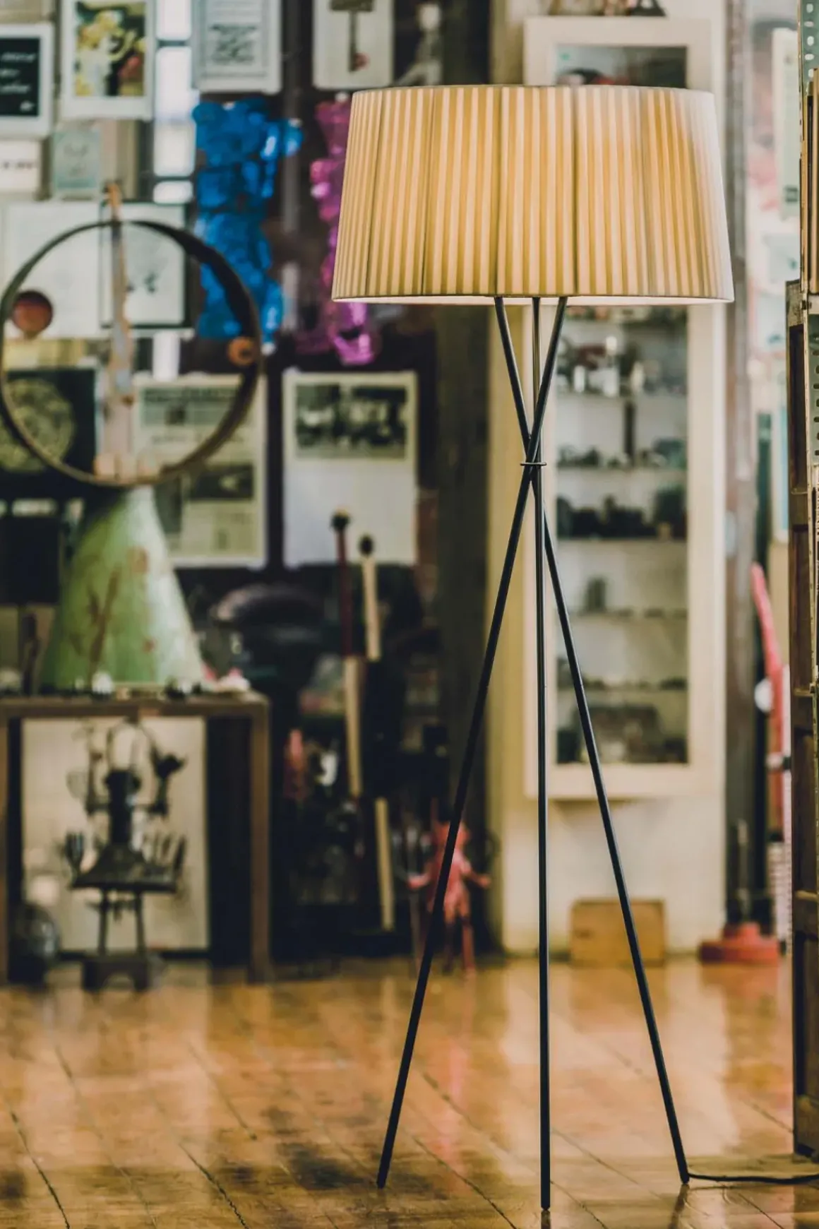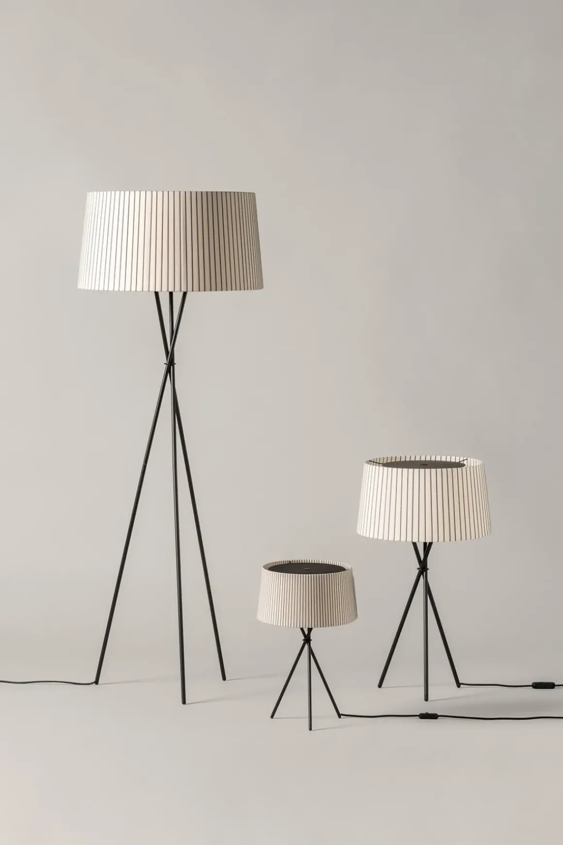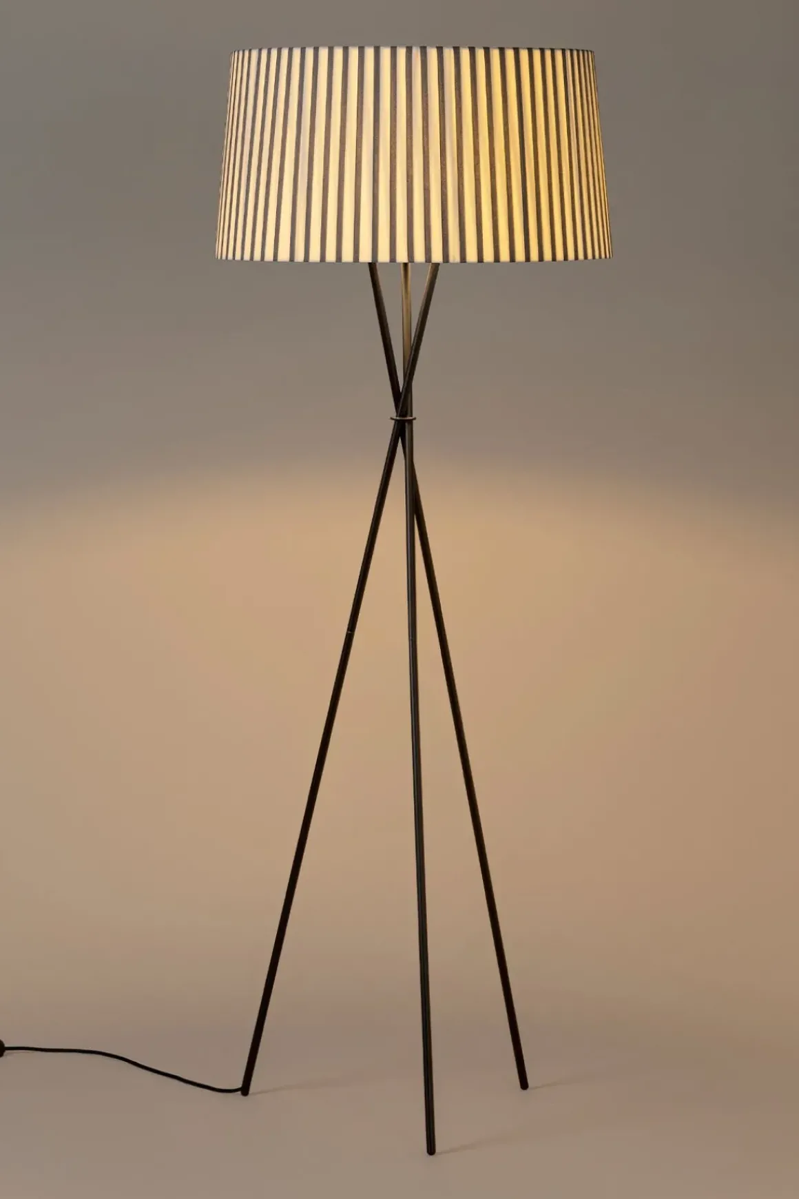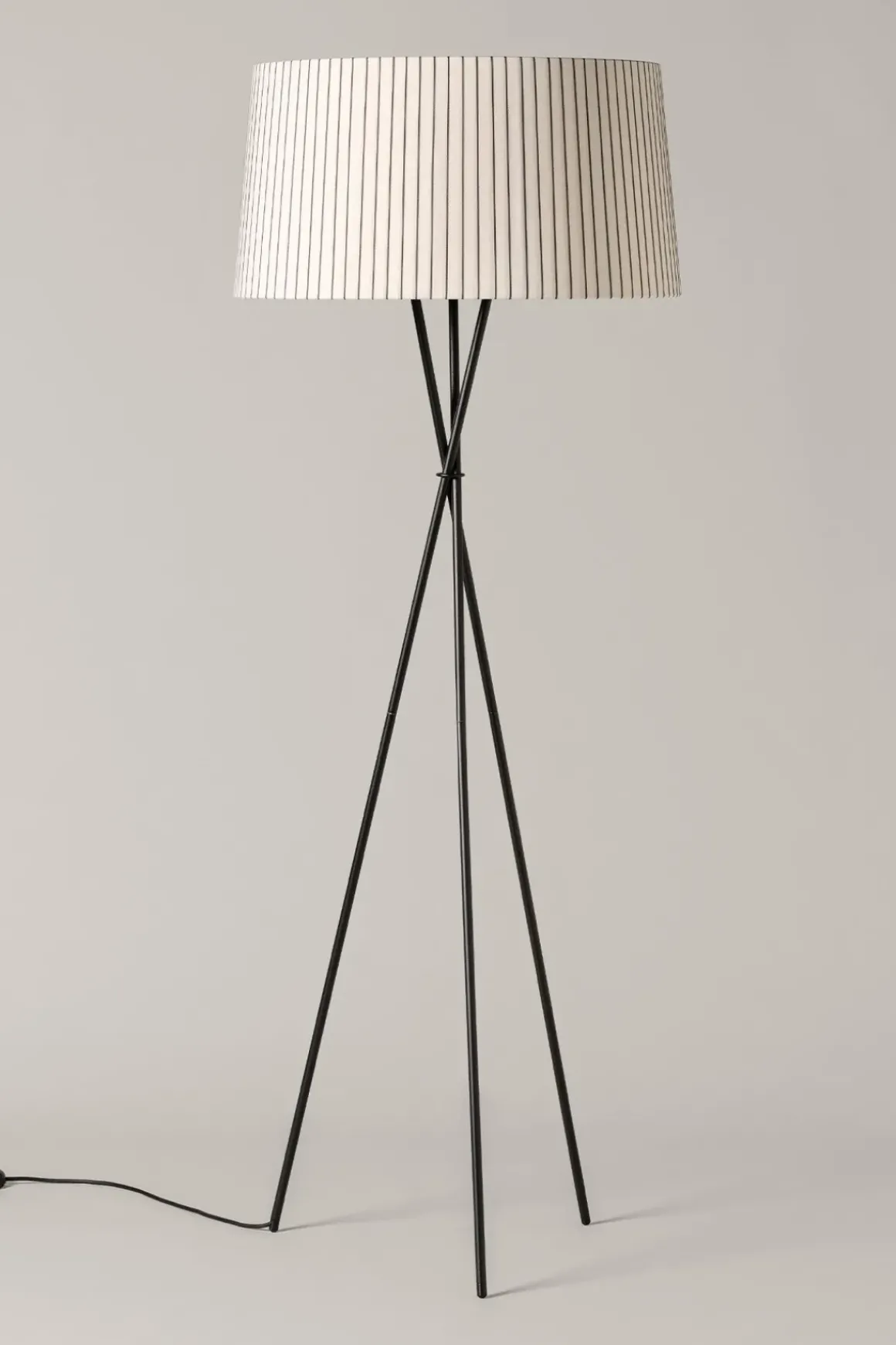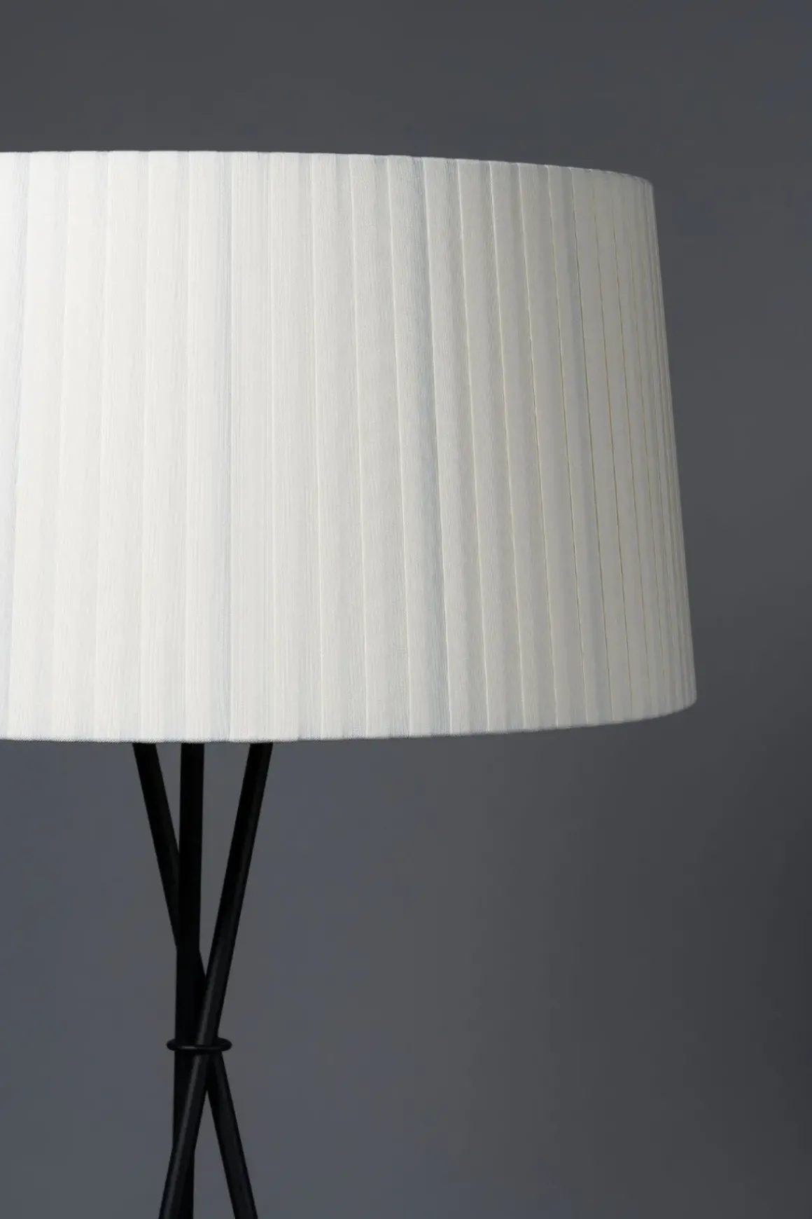 Tripode gulvlampe fra Santa u0026amp; Cole. Lampen har en sort metallbase med en stor, sirkulær lampeskjerm, som er laget av bomullsbånd i en dus naturfarge og gir et mykt og behagelig lys. Lampen har dimbar bryter som gjør at du kan justere lysstyrken slik du ønsker. Passer perfekt i lesekroken eller stuen. Lampen kommer i flere farger.
