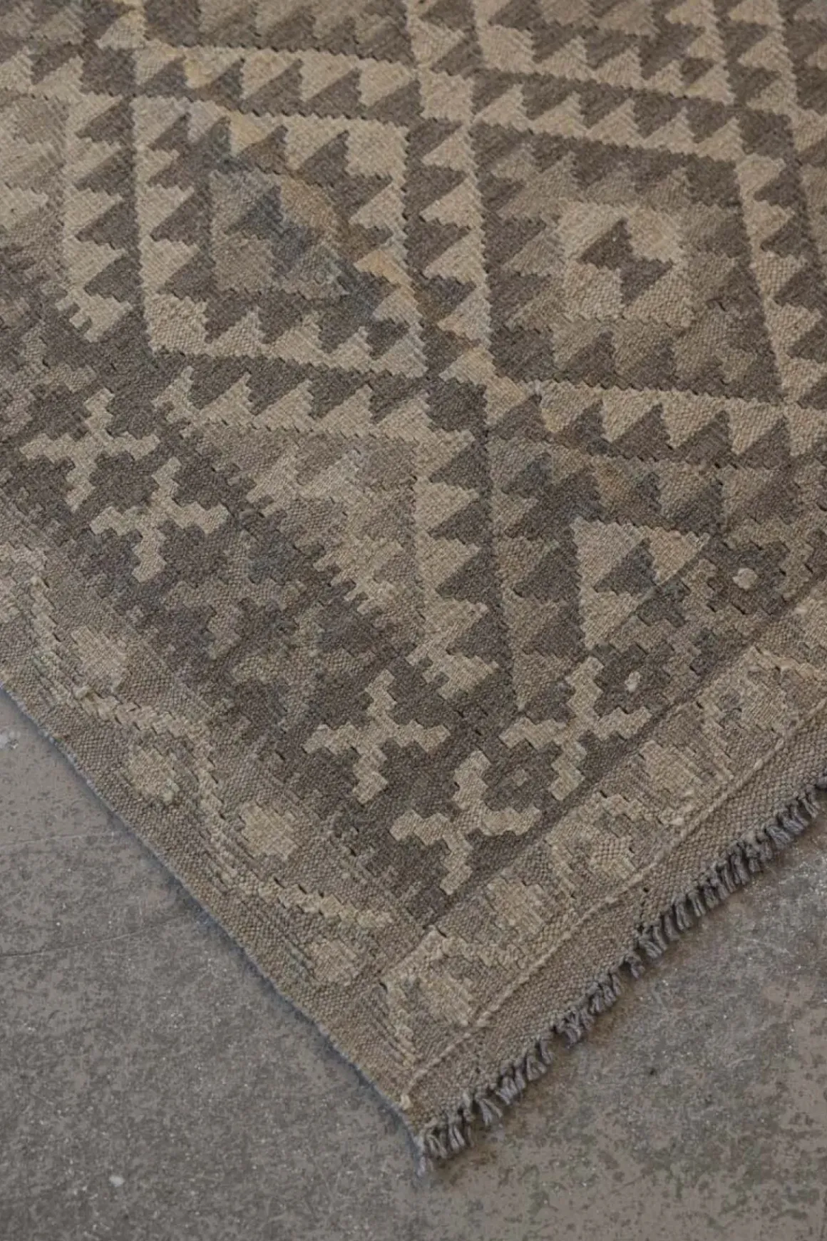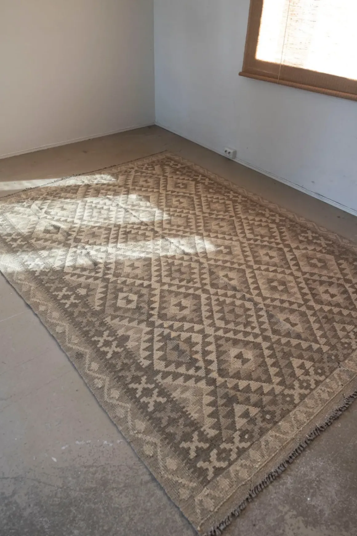 Unikt håndknyttet kelimteppe i grå-beige nyanser fra Massimo. Gulvteppet er laget i Afghansk ull av svært høy kvalitet. Denne robuste ullen er et naturlig selvrensende materiale som krever svært lite vedlikehold. Fargene i kelimteppene fra Massimo er helt naturlige og har et vasket utrykk, noe som gjør at vanlig bruk og slitasje vil synes i liten grad. Teppet kan kalles et stykke tekstilkunst og er et one-of-a-kind produkt håndlaget i Pakistan. De naturlige fargenyansene passer inn i ethvert hjem og er perfekt for den nordiske stilen.