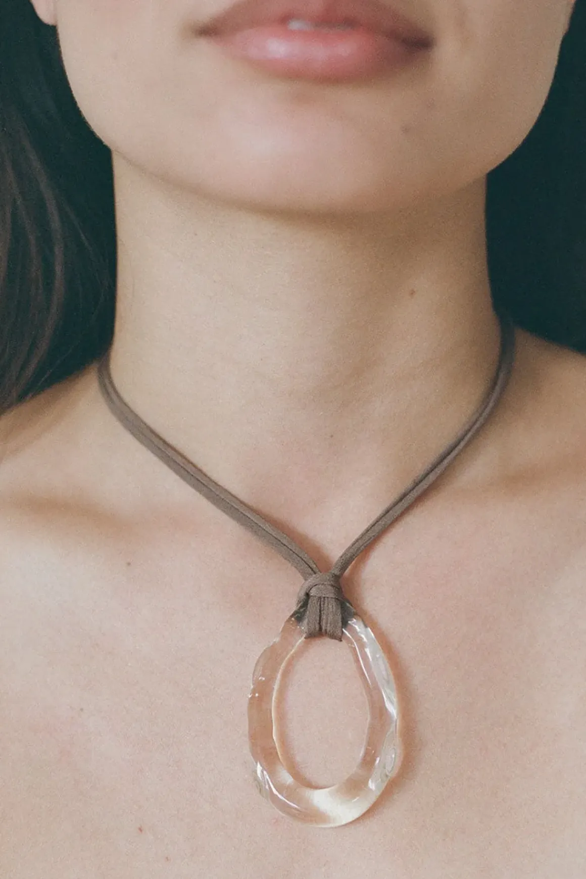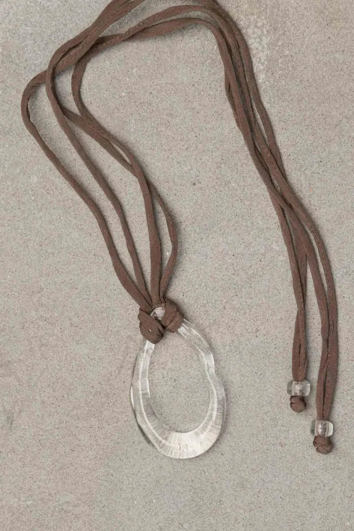 Galatea Terra er et halskjede med et anheng i klart, munnblåst glass, festet til en dobbel silkereim i en varm brun nyanse. Reimen, laget av lokalt innhentet og farget silke, kan knytes for justerbar lengde og bæres som en choker eller i lengre stil. Håndlaget med små variasjoner, har hvert smykke sitt eget unike og personlige preg. Glasset bør behandles med forsiktighet for å bevare sin naturlige skjønnhet.