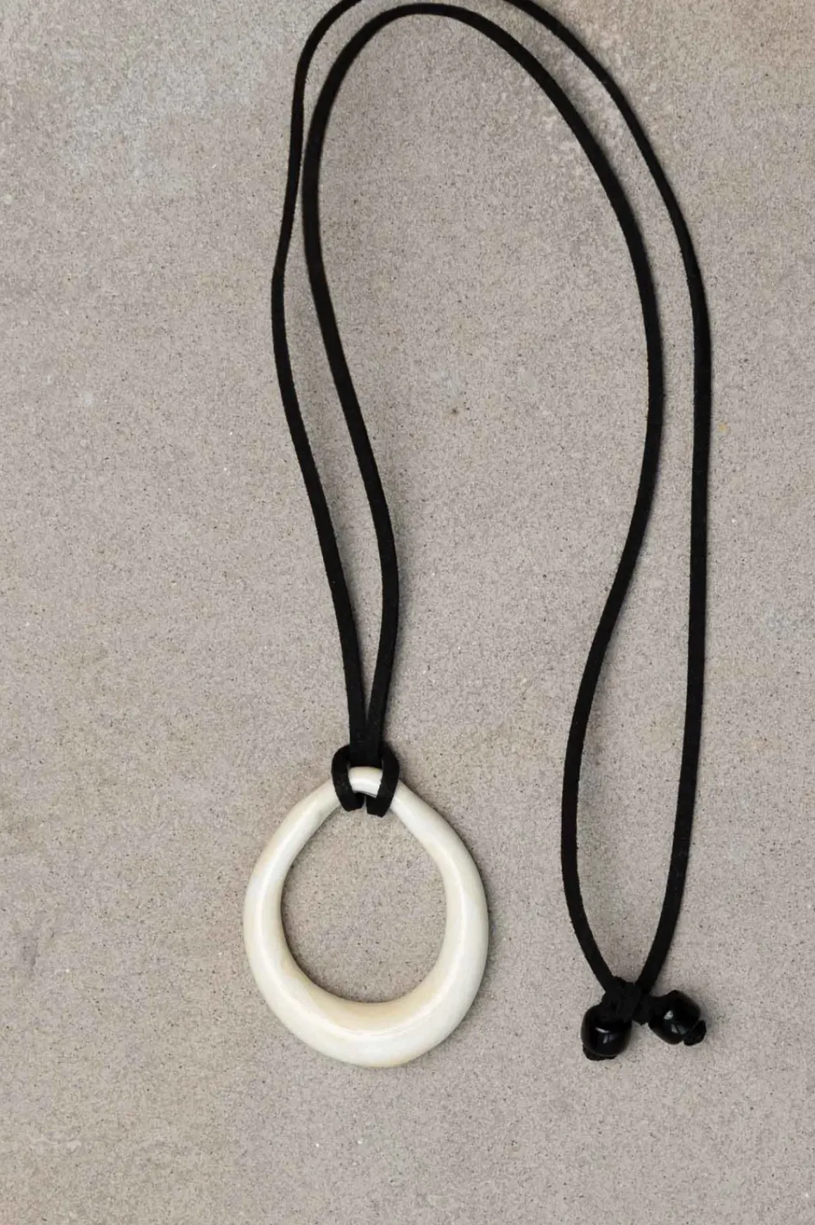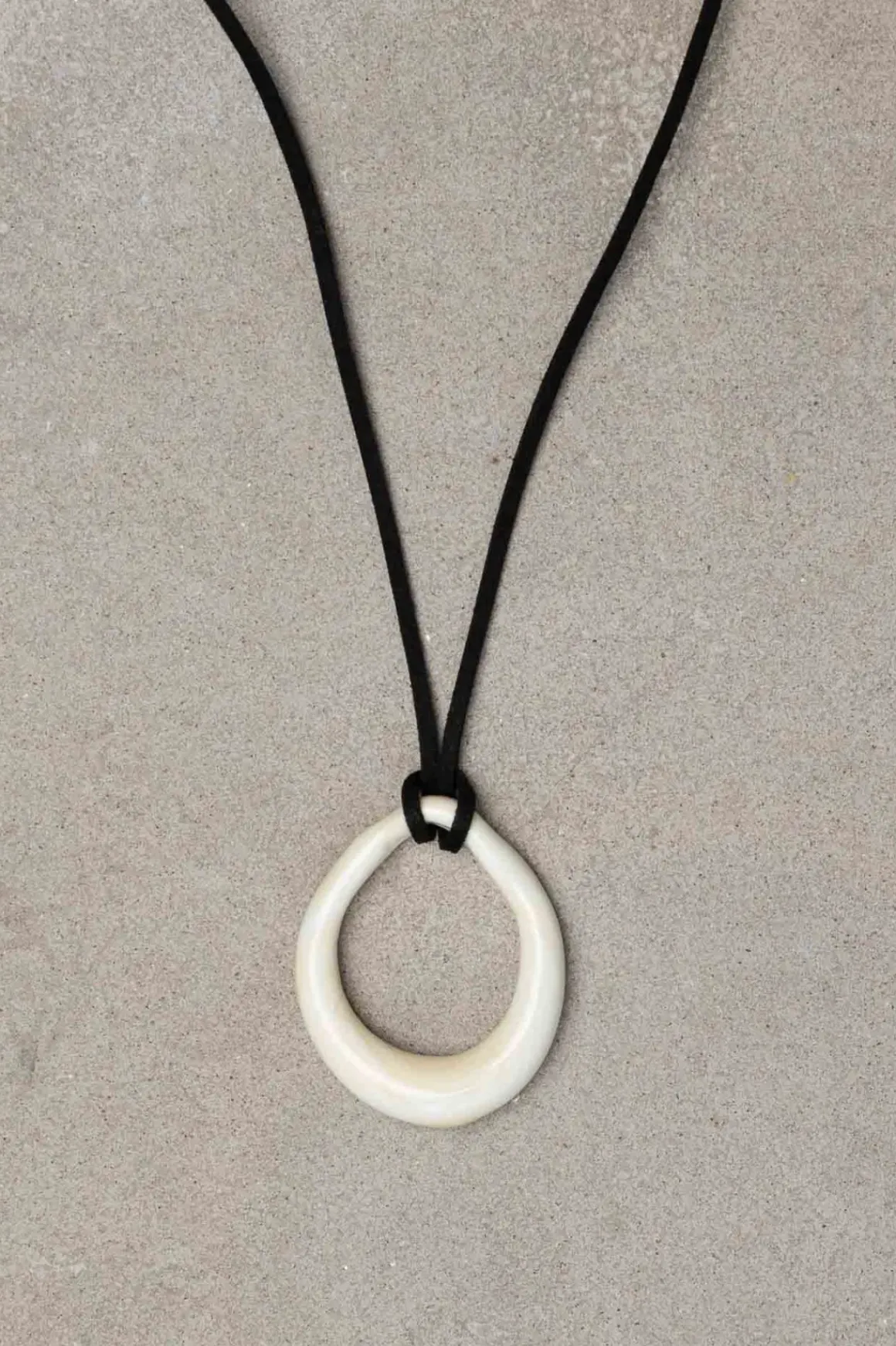 Et vakkert halskjede med anheng i munnblåst venetiansk glass i en myk elfenbenshvit nyanse. Den sorte semskede remmen kan knytes og justeres slik at det kan bæres både langt eller tett som en choker. Hvert smykke er nøye håndlaget, og små variasjoner i formen gir hvert anheng sitt unike uttrykk. Et tidløst smykke som kombinerer tradisjonelt håndverk med et moderne preg.