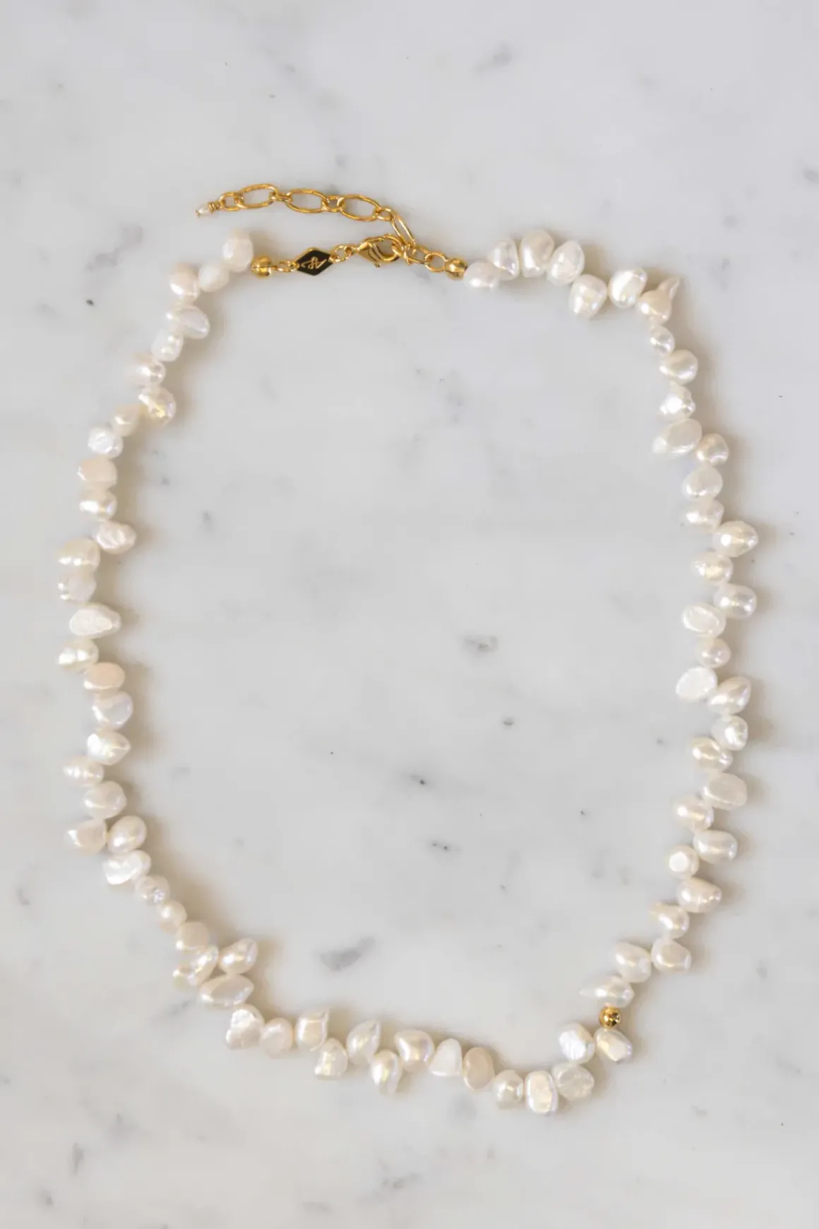 Pearly Drop halskjede fra Anni Lu og Joyride kolleksjonen. Med en overflod av delikate glass-og ferskvannsperler, er halskjedet både klassisk, men samtidig lekent. Laget i messing med 18 karat gullbelegg med vakre glassperler og ferskvannsperler.