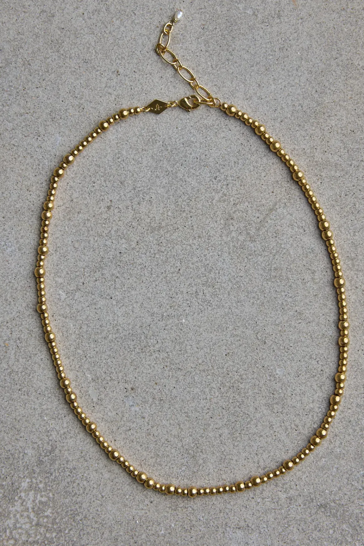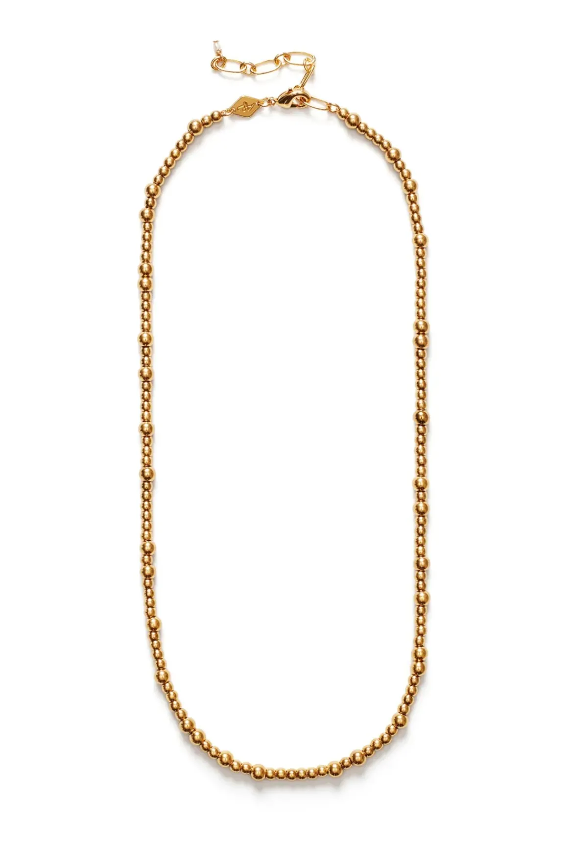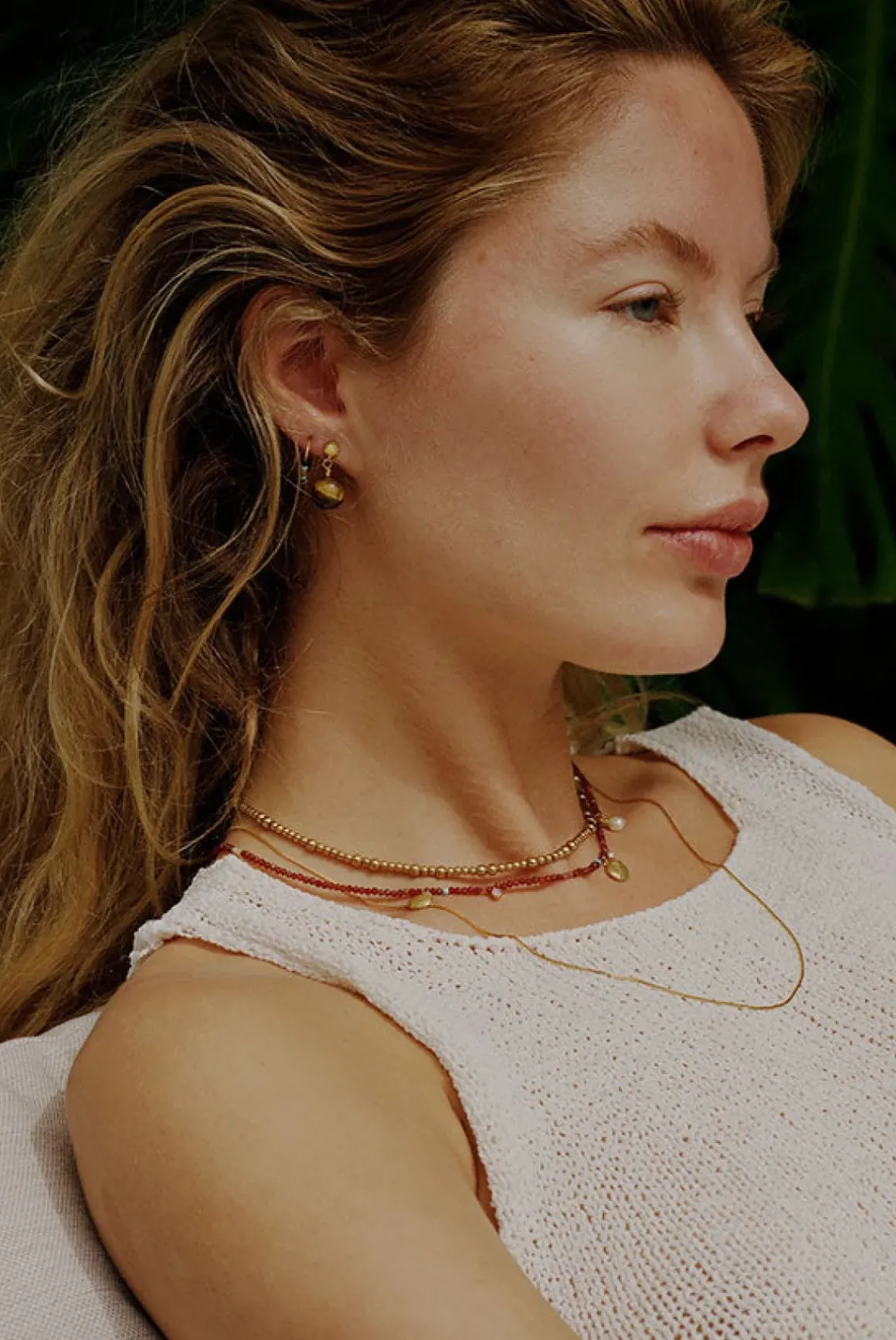 Slim Goldie fra Anni Lu. Halskjedet er en del av Anni Lu’s nyeste kolleksjon Club Mirage, og er et enkelt og stilrent smykke som gir et varmt og subtilt uttrykk. Inspirert av 70-tallets avslappede luksus, er halskjedet laget av små, gyldne perler som gir en subtil, men likevel iøynefallende effekt. Club Mirage fanger den bohemske friheten fra denne perioden og gir den et oppdatert preg. Slim Goldie er et smykke som kan brukes til enhver anledning og passer perfekt for deg som liker et nedtonet og rent uttrykk.