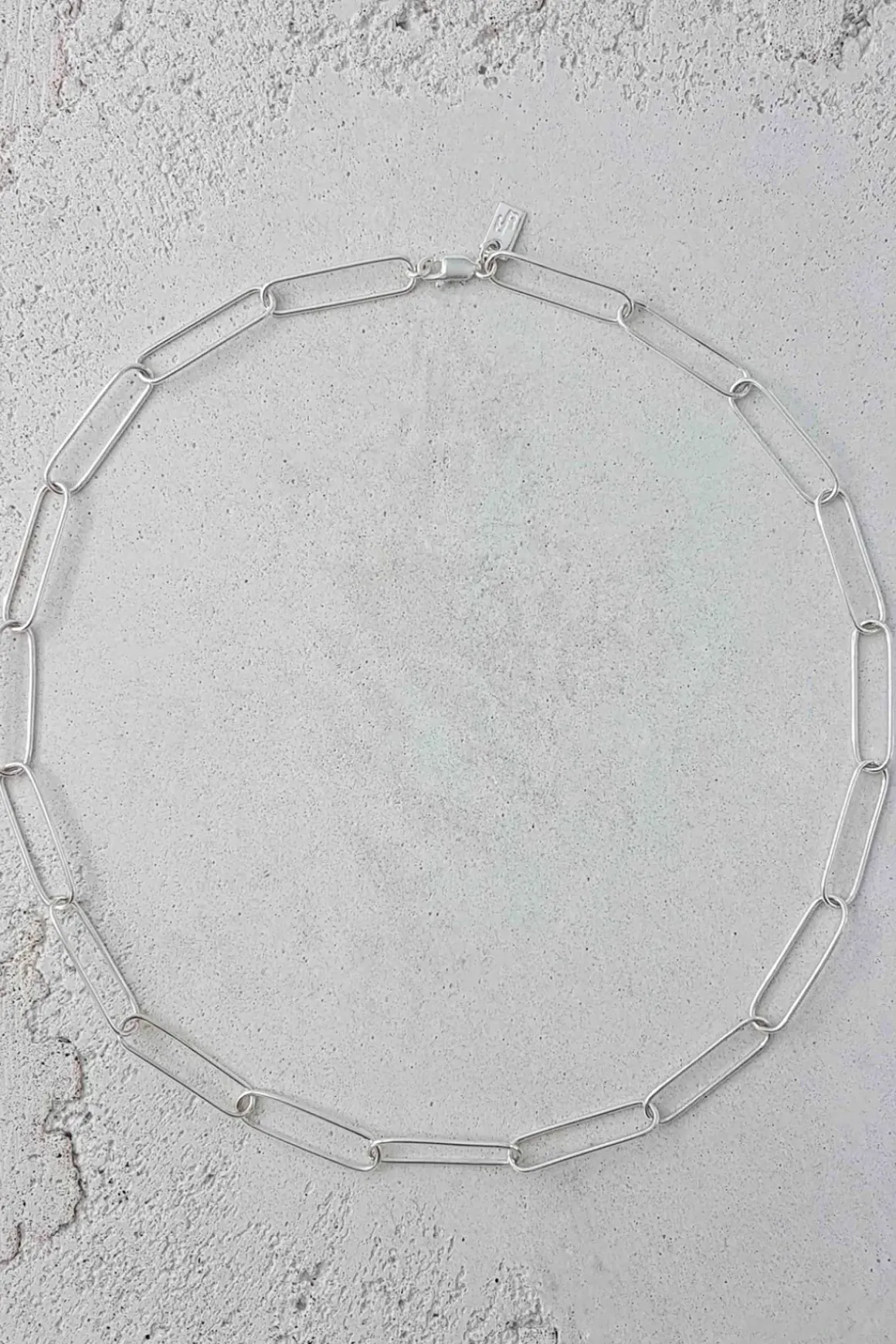 Woolamai-halskjede med løse lenker i sterlingsølv fra Romanin. Smykket er inspirert av de avrundede geometriske formene til de bølgede steinene ved Cape Woolamai, Victoria i Australia. Det minimalistiske designet gjør halskjede både perfekt alene eller kombinert med smykker i andre ulike stiler.