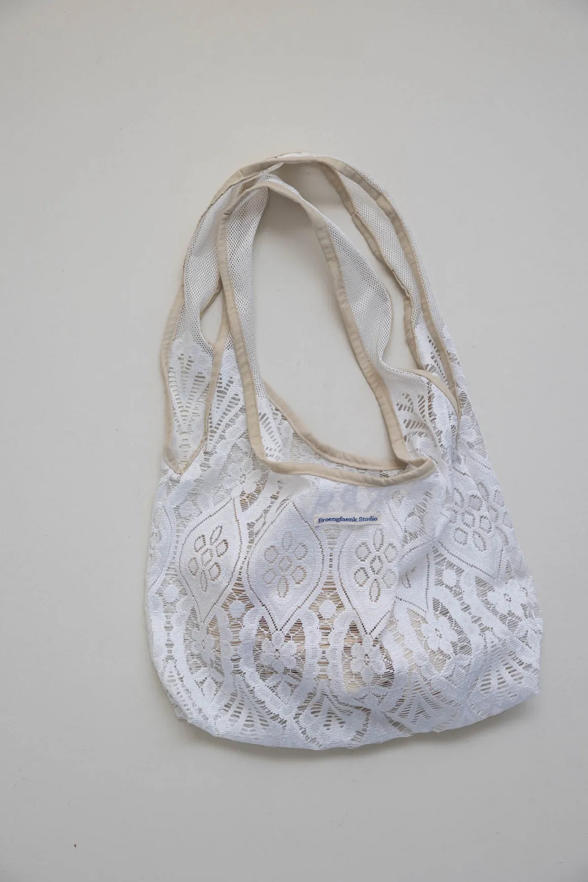 Unikt handlenett fra danske Broeng Fænk Studio laget av gjenbrukte vintage tekstiler som gardiner og duker, med håndsydde detaljer og plantefarget kantebånd. Nettet er lett og dekorativt, perfekt til små ærend eller som ekstra veske, men tåler ikke tung last. Blonder har fått ny aktualitet – og dette nettet kombinerer stilen med bærekraftig produksjon og nostalgisk sjarm. Det følger med en praktisk bomullspose som kan brukes inni nettet.