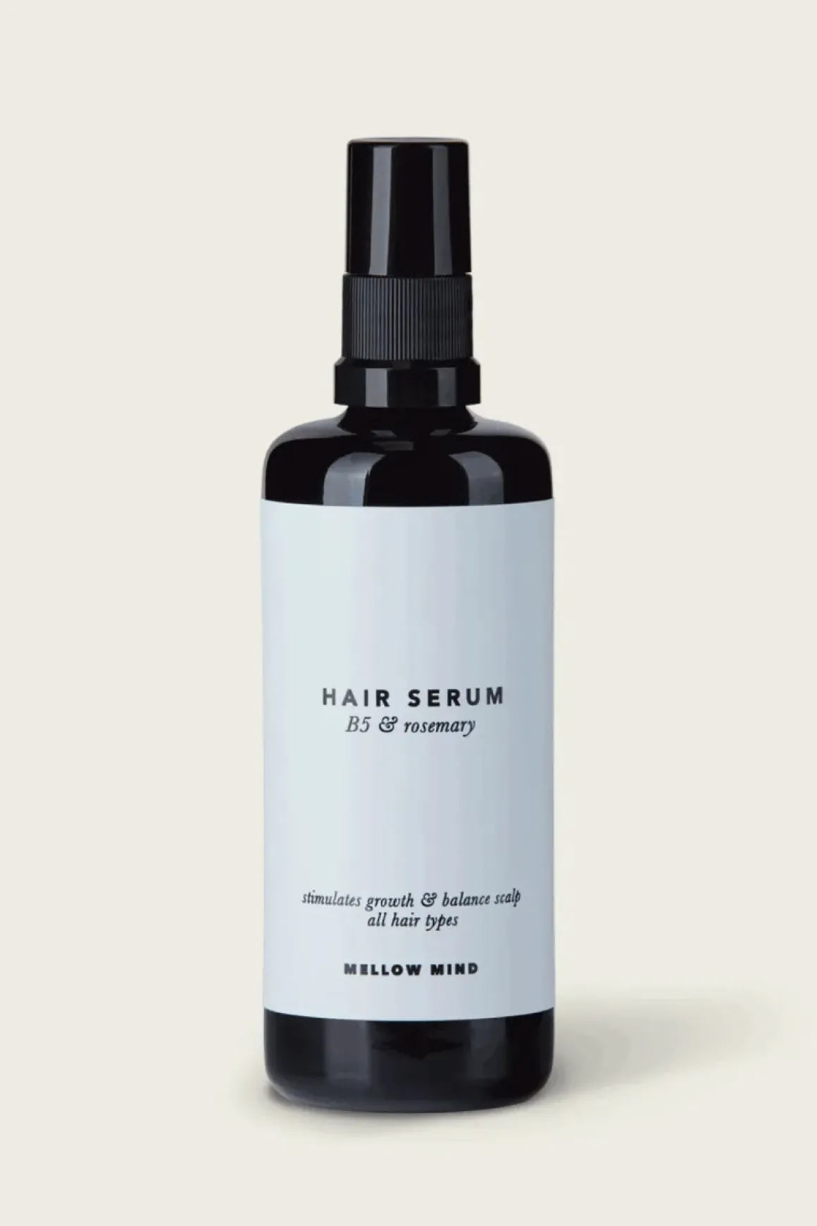Mellow Minds Hårserum med B5 og rosmarinvann er et lettflytende serum med aktive ingredienser som øker hårveksten, fukter og skaper balanse i hodebunnen. Det veganske serumet inneholder velduftende rosmarinvann, som med sine antibakterielle egenskaper balanserer hodebunnens naturlige oljeproduksjon og stimulerer hårveksten. Serumet er utviklet for alle hårtyper og inneholder vitamin B5 og hyaluronsyre, som virker fuktighetsbevarende, antistatisk og beskyttende, samtidig som det gjør håret mykt og skinnende. Produktet er et leave-in produkt og skal ikke skylles ut. Ved daglig bruk etterlates hodebunnen din godt vedlikeholdt og gir de beste forutsetningene for sunt hår.