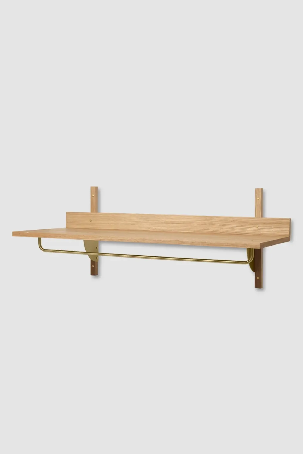 - Materiale: Hylle: Naturlig eikefiner med MDF-kjerne | Profiler: Naturlig massiv eik | Braketter og stang: Messing