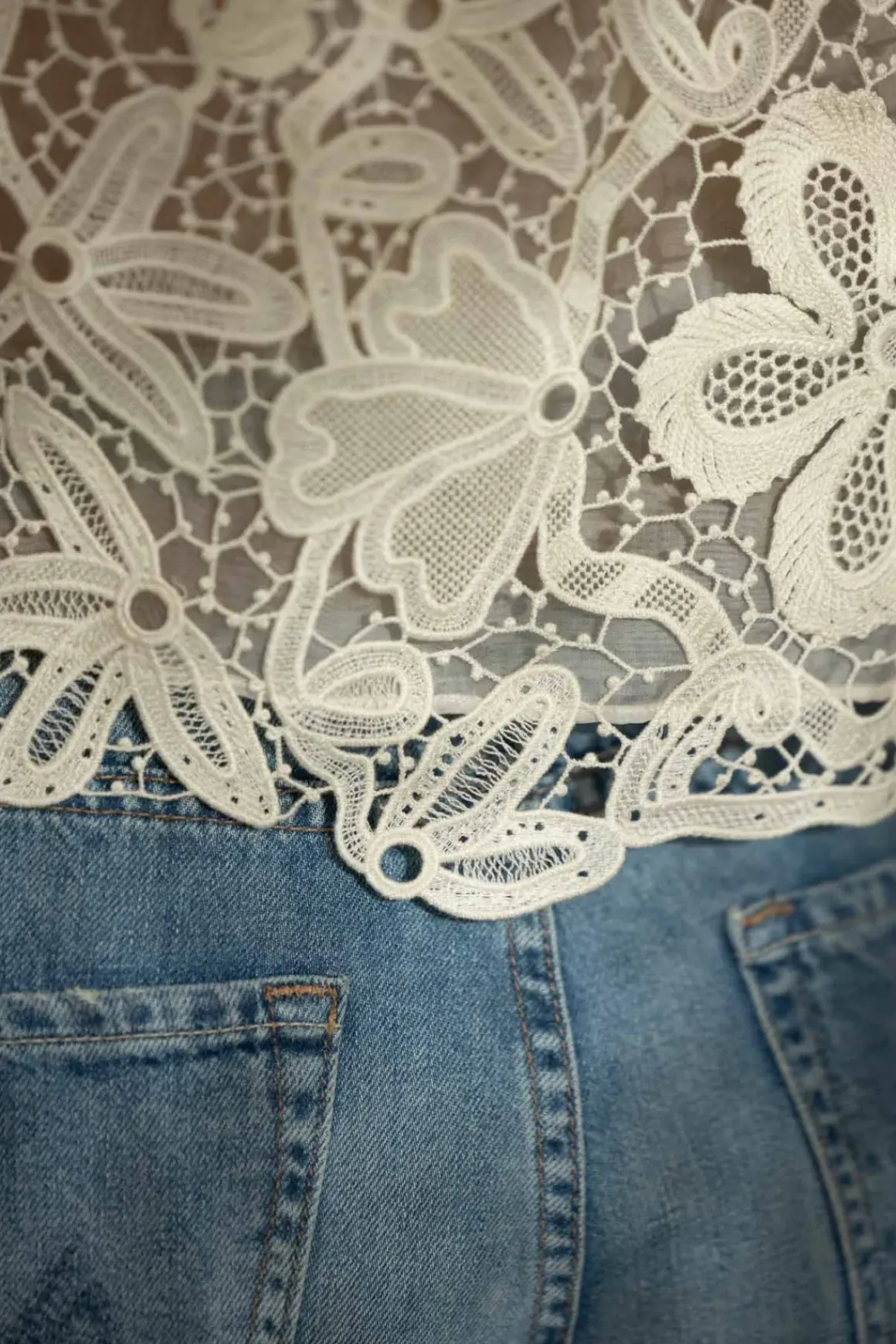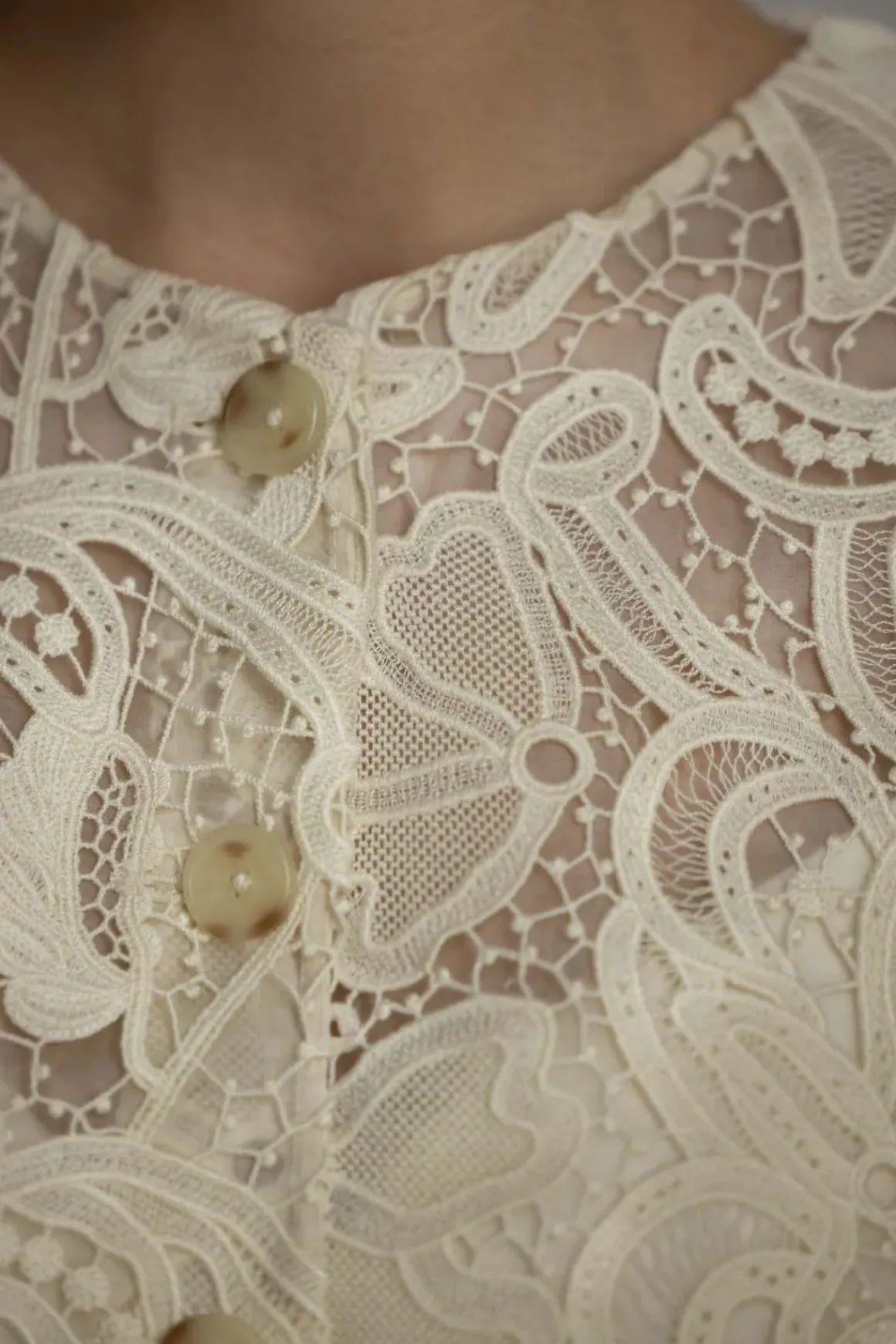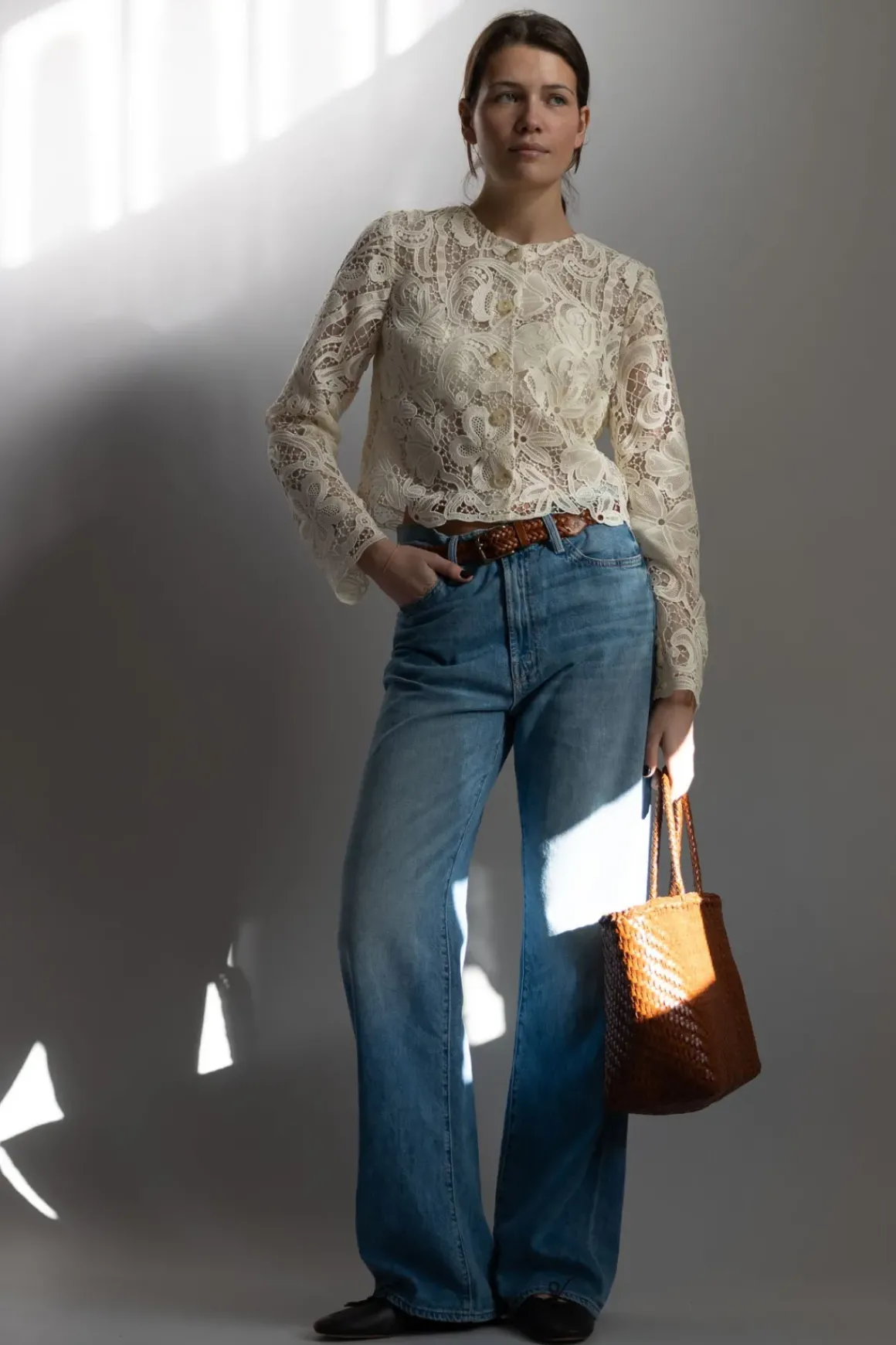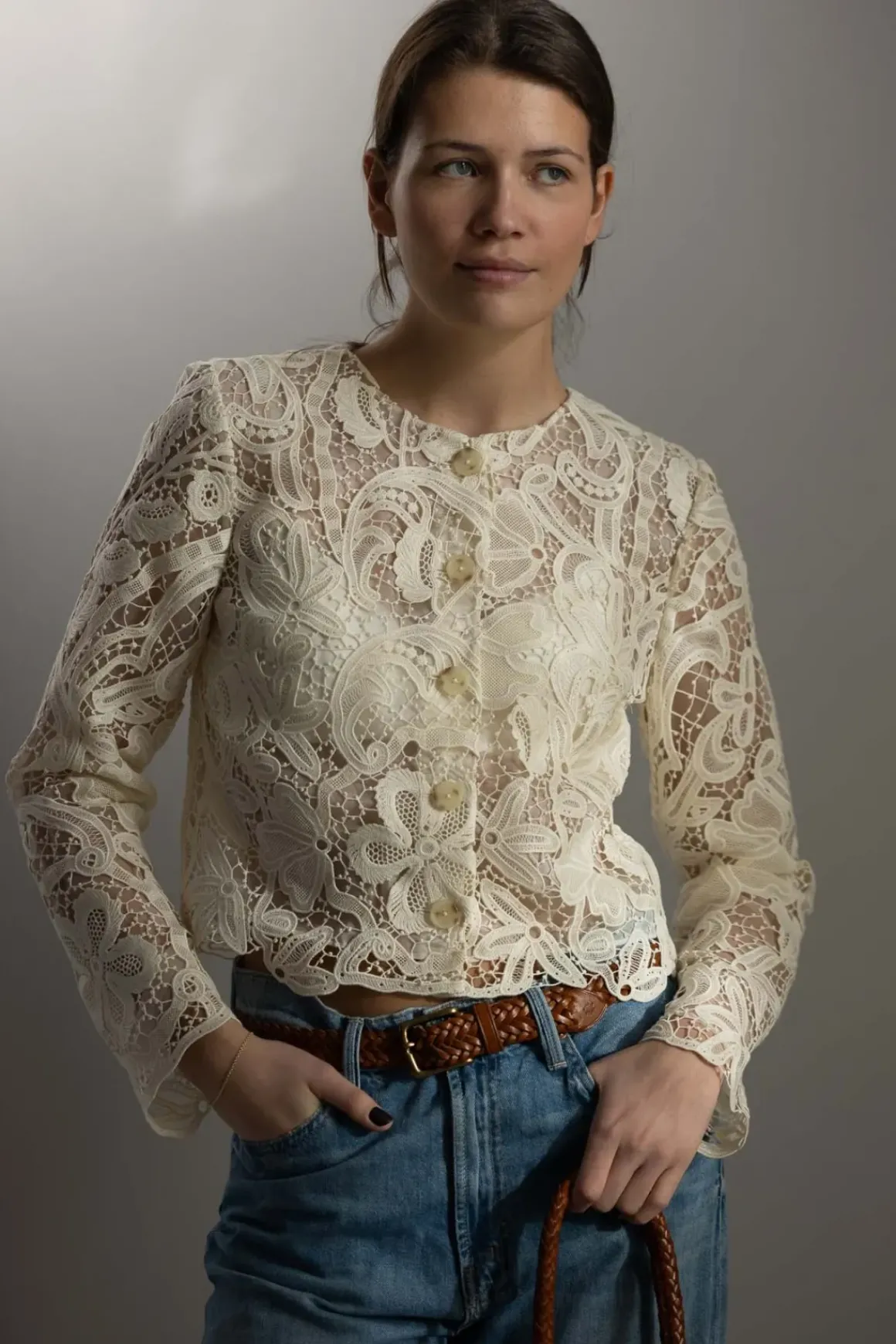 Claire-jakken i fargen Pristine fra Ulla Johnson har en klassisk silhuett og er laget i intrikat botanisk blondestoff, inspirert av et antikt tekstil. Den kommer i en kremhvit nyanse og har en krageløs halslinning samt en tidløs, kort passform. Jakken er fôret i bole og ermer. Kan lukkes med tortoise knapper langs fronten. Kan brukes som overdel/bluse og jakke.