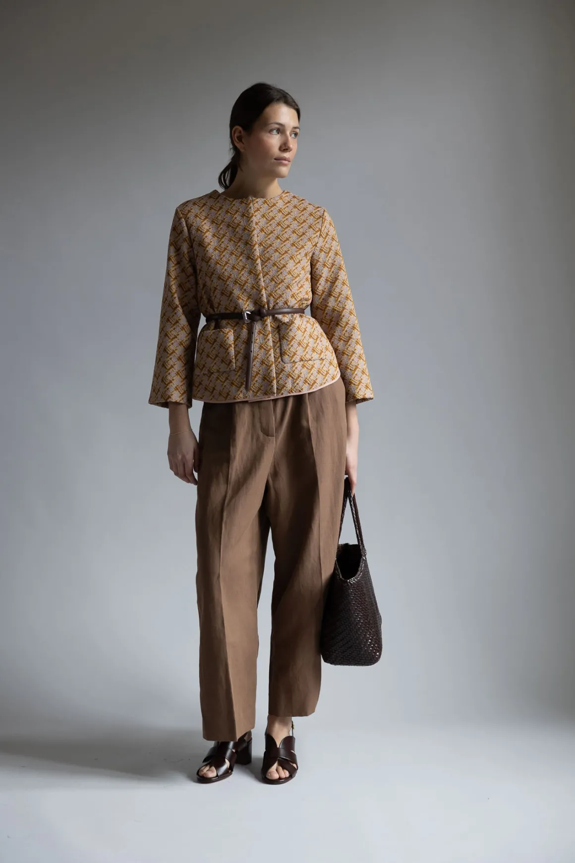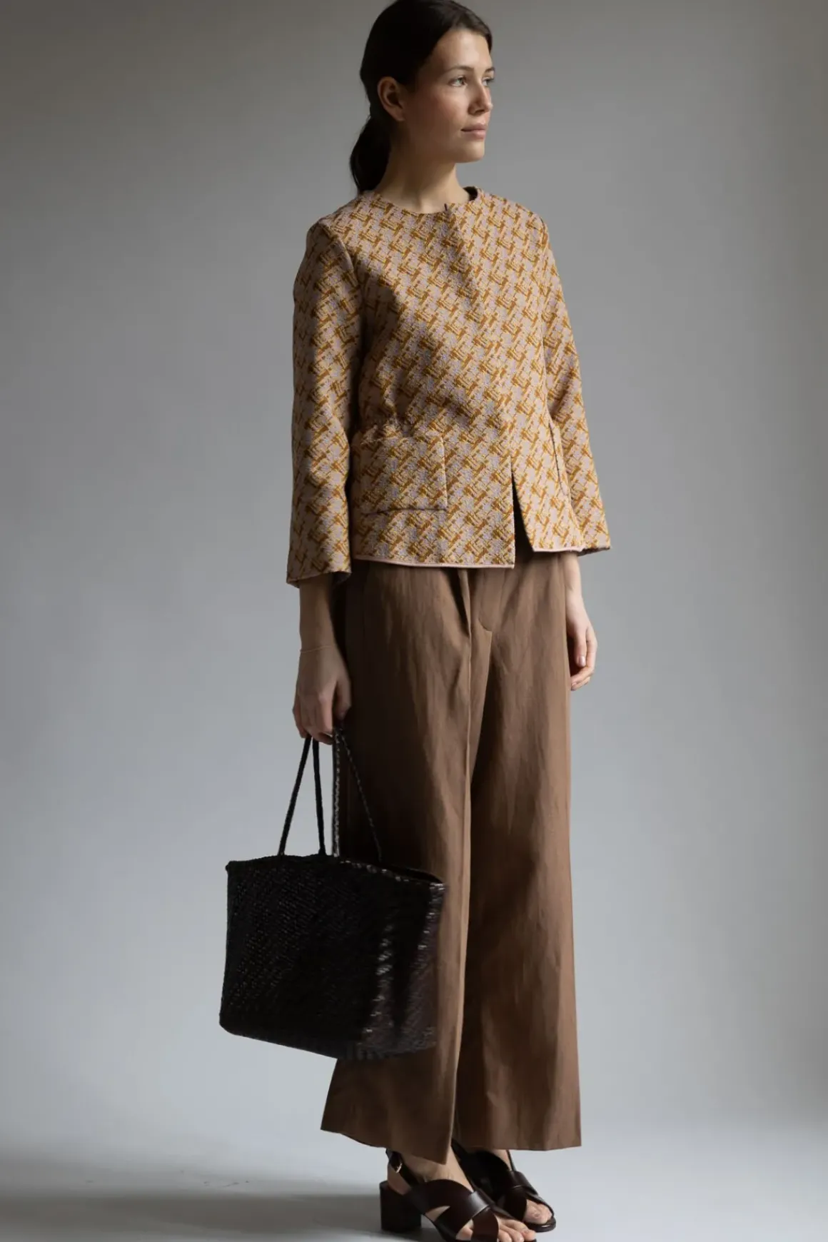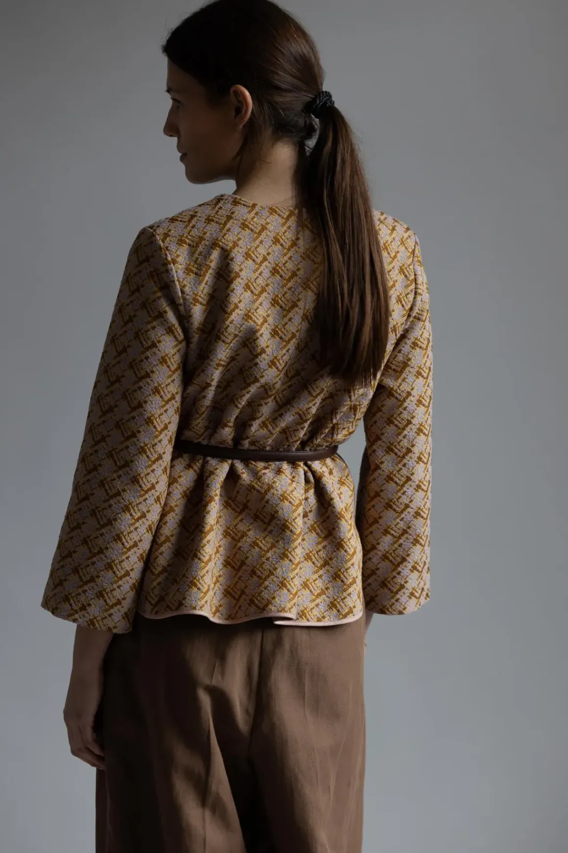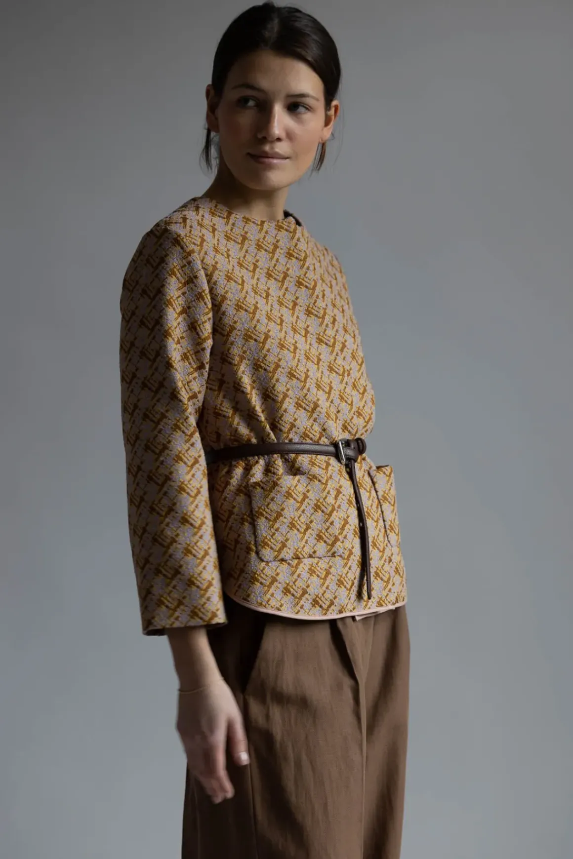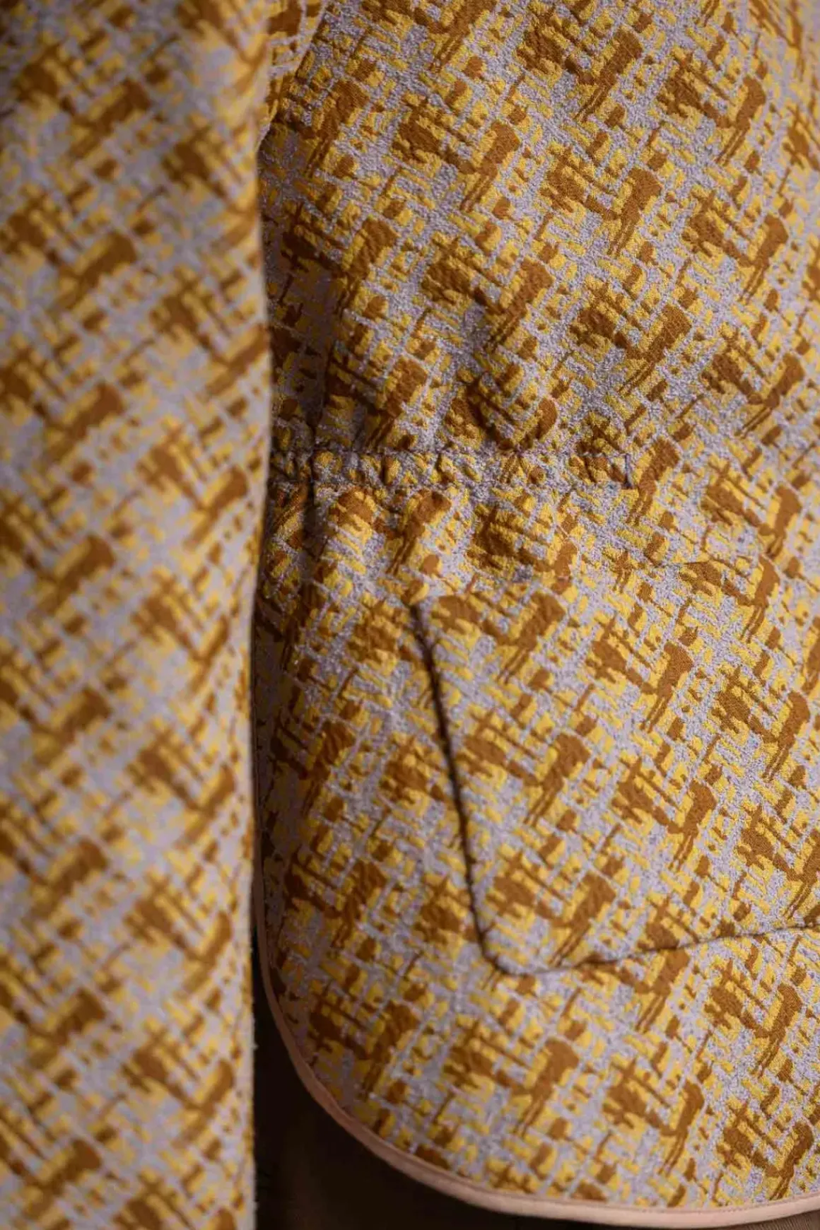 Jakke fra Odeeh med et unikt grafisk mønster i varme gule og brune toner. Den flatterende A-linjeformen med innsving skaper en fin silhuett, mens den runde halsen og de rette ermene gir et rent og moderne uttrykk. En allsidig jakke som løfter ethvert antrekk – bruk den over en kjole, eller style den med bukser eller skjørt for en kul og gjennomført look.