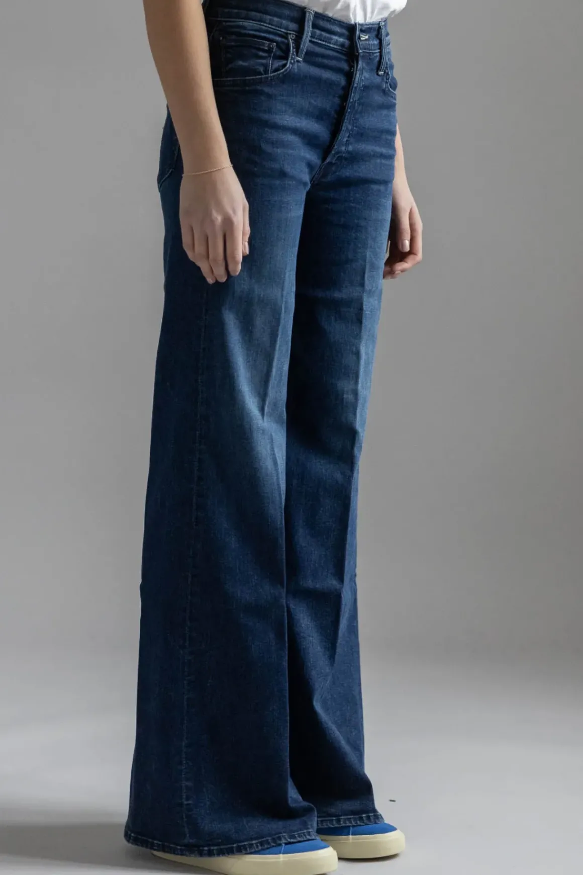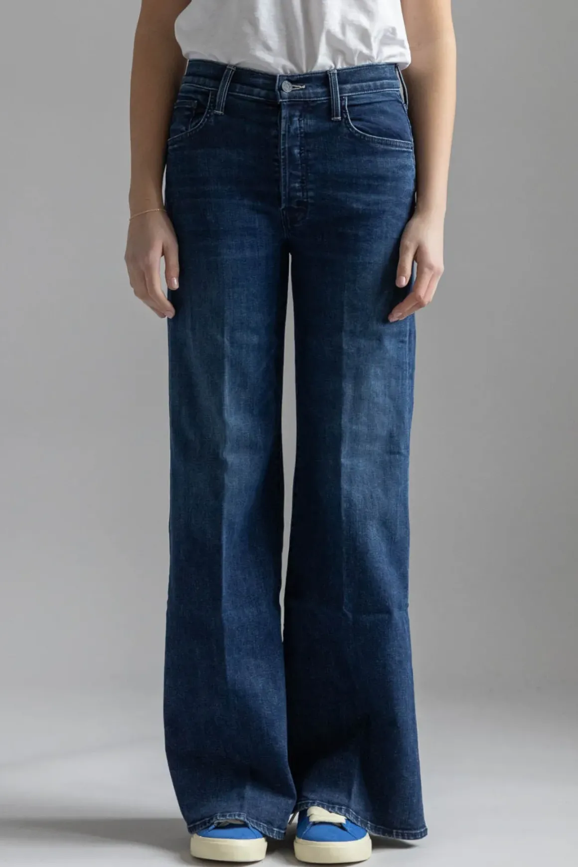 The Tomcat Roller Sneak fra Mother er en jeans med høyt liv og vide ben som skrår ut fra hoften og nedover. Jeansen har knapper i gylfen, en mørk blå vask med lett falming og subtile whiskering-detaljer ved knærne, noe som gir den et avslappet uttrykk. Laget i stretchy denim for ekstra komfort, er dette en hverdagsjeans som enkelt kan styles opp eller ned.