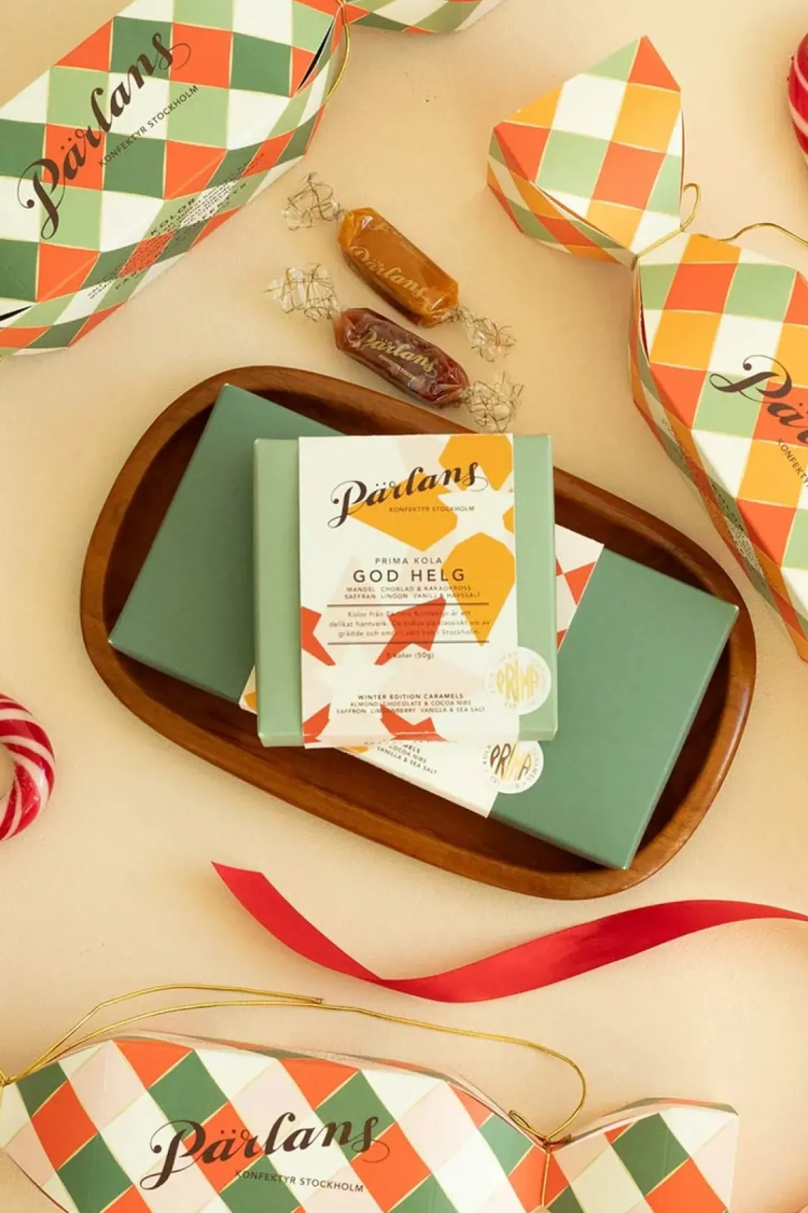 Karameller fra Pärlans Konfektyr, pent pakket i cellofan og samlet i en søt eske. Hver karamell kokes på fersk fløte, ekte smør og sukker av beste kvalitet, slik det alltid har blitt gjort på tradisjonelt vis. Årets vinterutgave byr på en spennende blanding av julens smaker og kjente klassikere: tyttebær, sjokolade, sjokolade med kakaonibs, mandel, safran og vanilje med havsalt. En deilig samling smaker som sprer varme og glede når vinteren nærmer seg.