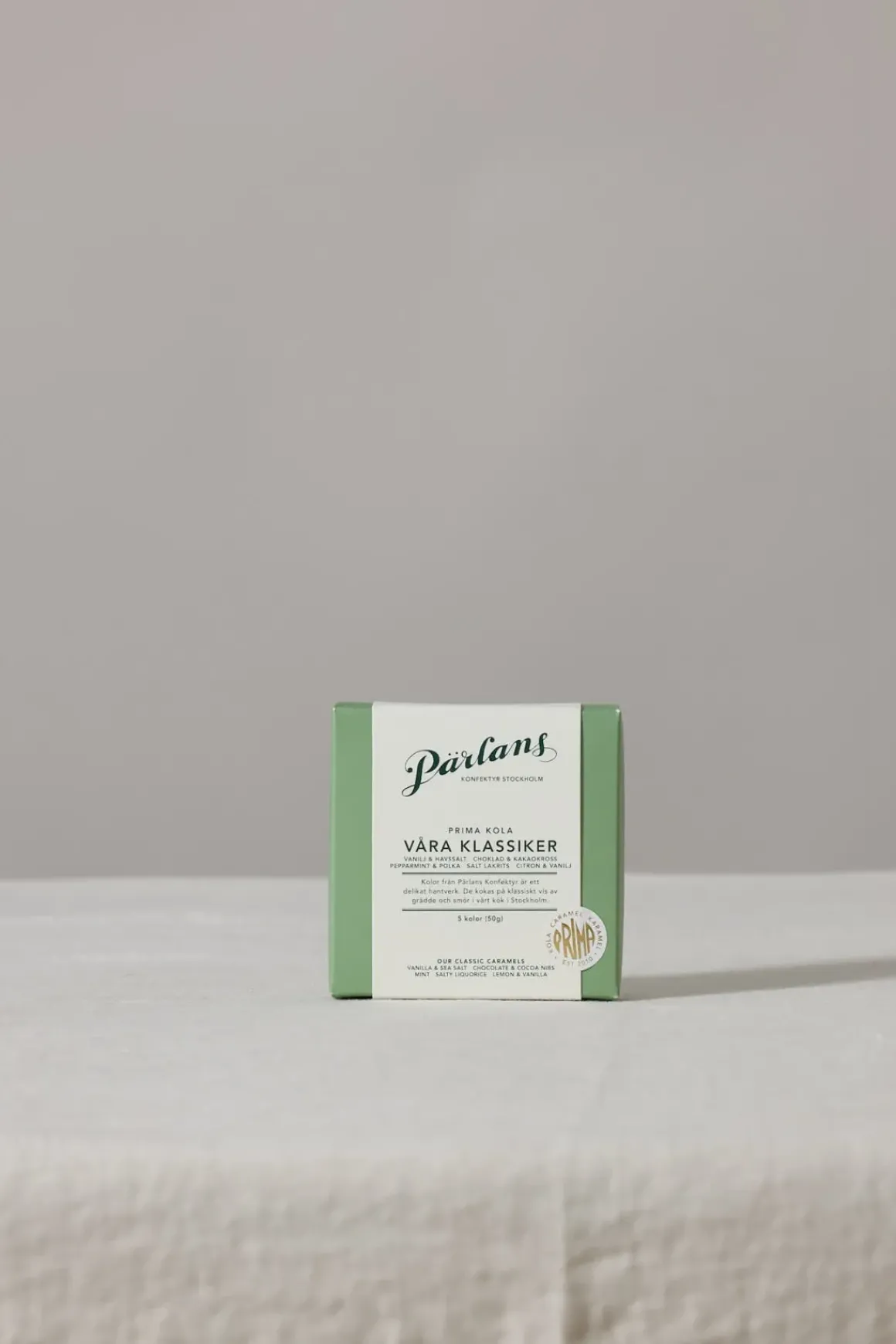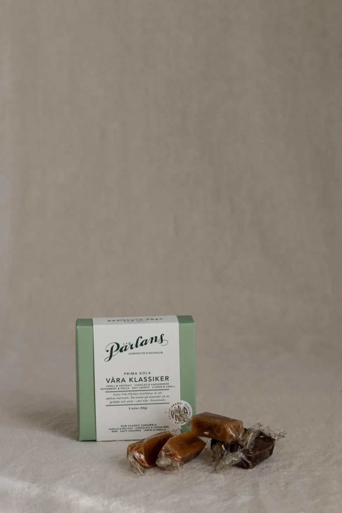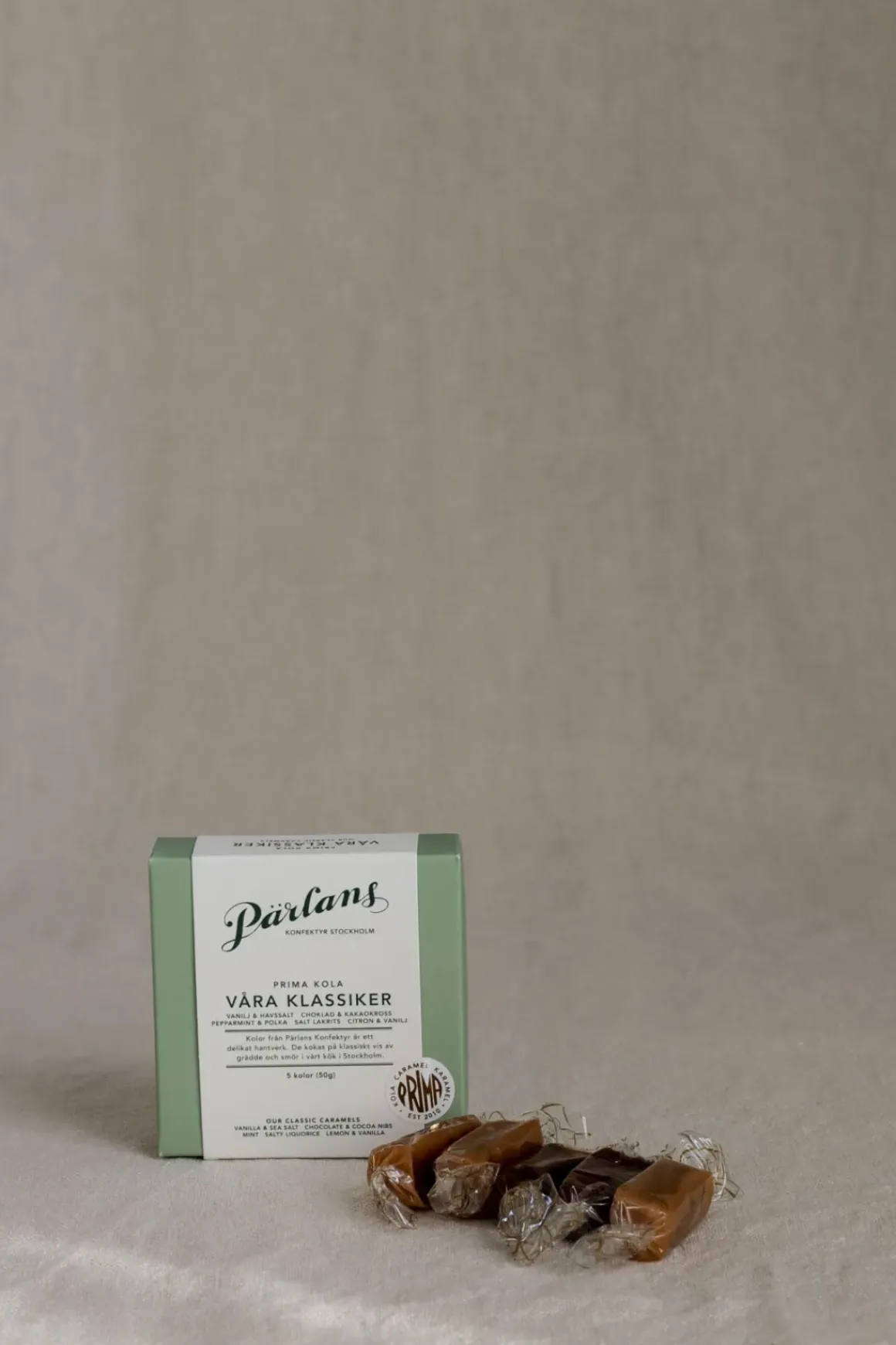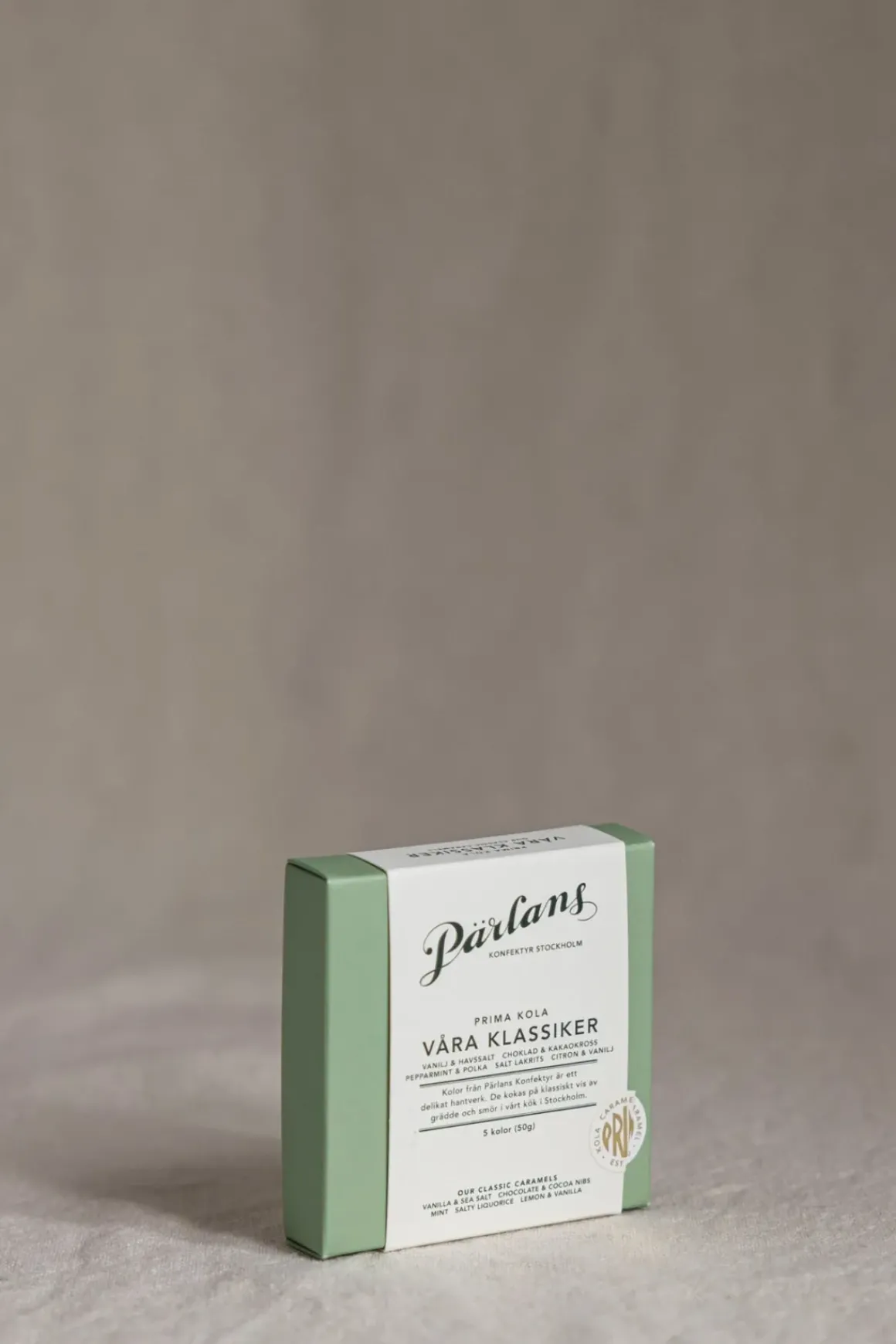 Våre Klassikere inneholder de 5 mest populære karamellene fra Pärlans Konfektyr, pakket inn i cellofan, pent pakket i en boks, til deg eller noen du er glad i. Esken inneholder en av hver av: Vanilje u0026amp; Havsalt, Salt Lakris, Sjokolade u0026amp; Kakaobiter, Sitron u0026amp; Vanilje og Pepermynte u0026amp; Polka.
