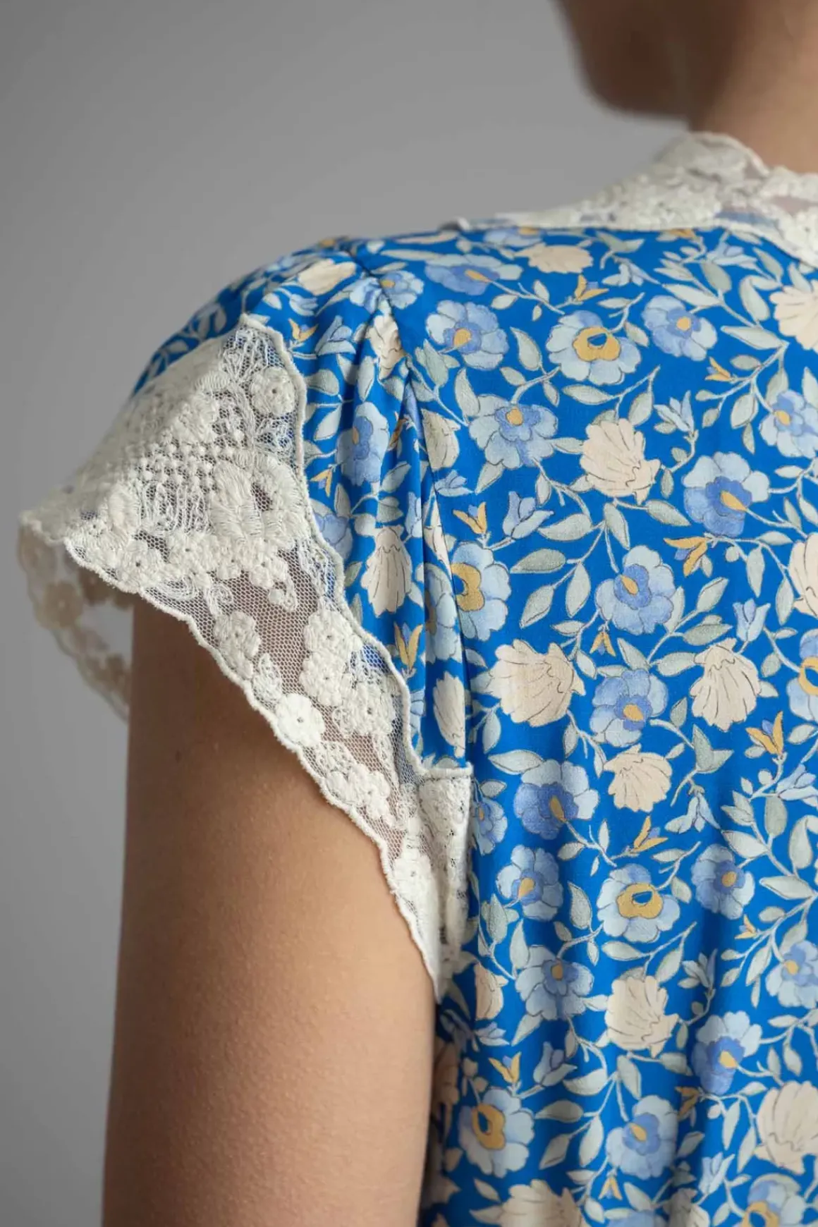 Den delikate og romantiske Amari Dress Shell Pansy Indigo fra Rixo er en tidløs kjole som kombinerer feminin silhuett med vintageinspirerte detaljer. Det lette viskosematerialet faller vakkert over kroppen, mens den insvingede midjen og knyting foran brystet gir en flatterende passform som fremhever figuren. Med innsnitt ved brystet og en skjult glidelås på siden, sitter kjolen perfekt og skaper en sofistikert look. De delikate blondene på V-halsen og ermene tilfører en romantisk touch, som gjør denne kjolen ideell både for spesielle anledninger og hverdagsøyeblikk.