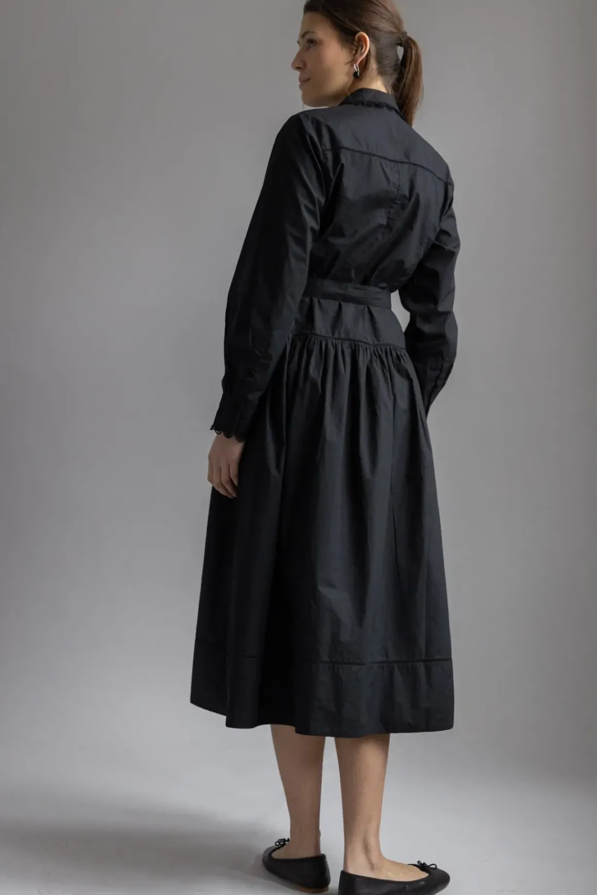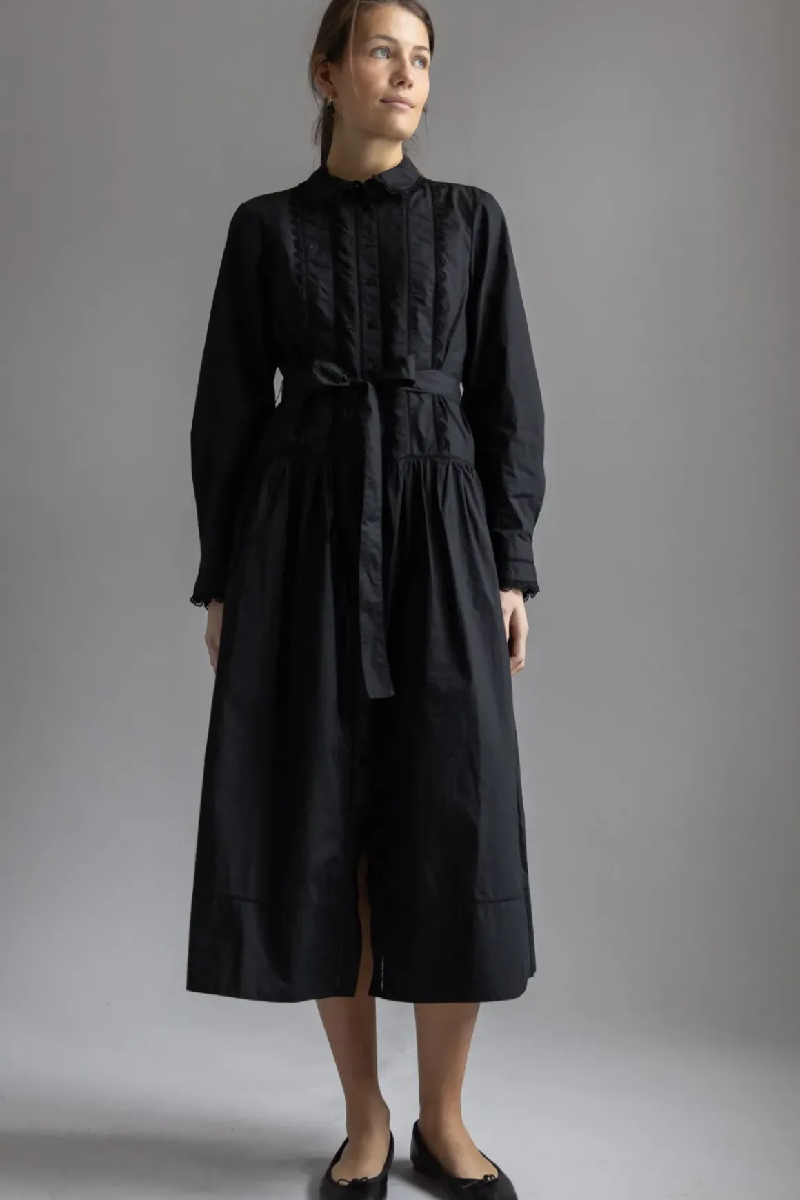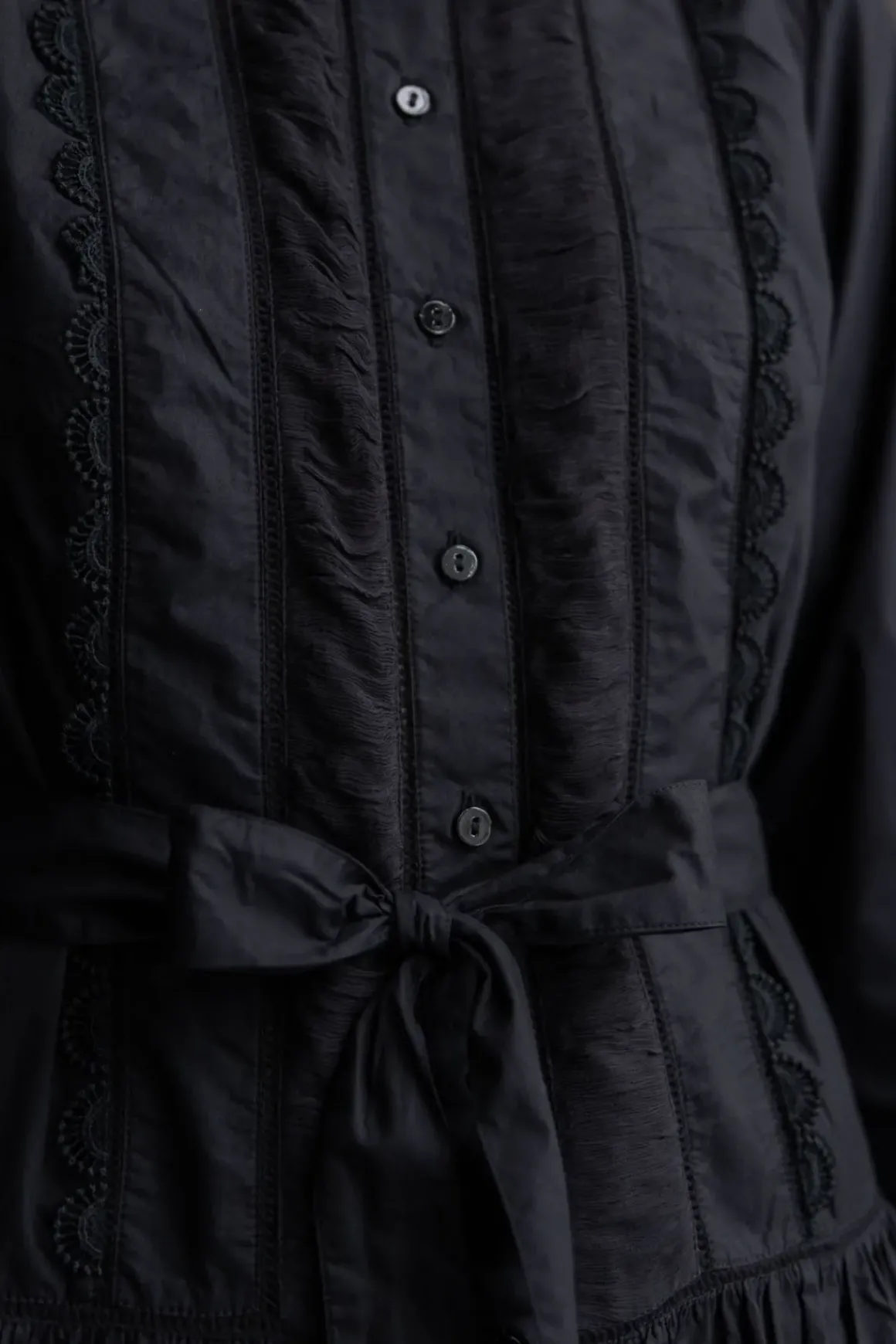 Ariane Noir-kjolen er en klassisk sort penkjole som passer til alle anledninger. Kjolen er laget av bomull med dekorstoff i rayon og har en feminin fasong med knyting i ryggen som fremhever midjen. Knapperekken går hele veien ned, og kjolen er utstyrt med to praktiske lommer. Sømdetaljer nederst på ermene og vakre blondedetaljer tilfører ekstra eleganse, mens kragen gir et klassisk preg til designet.