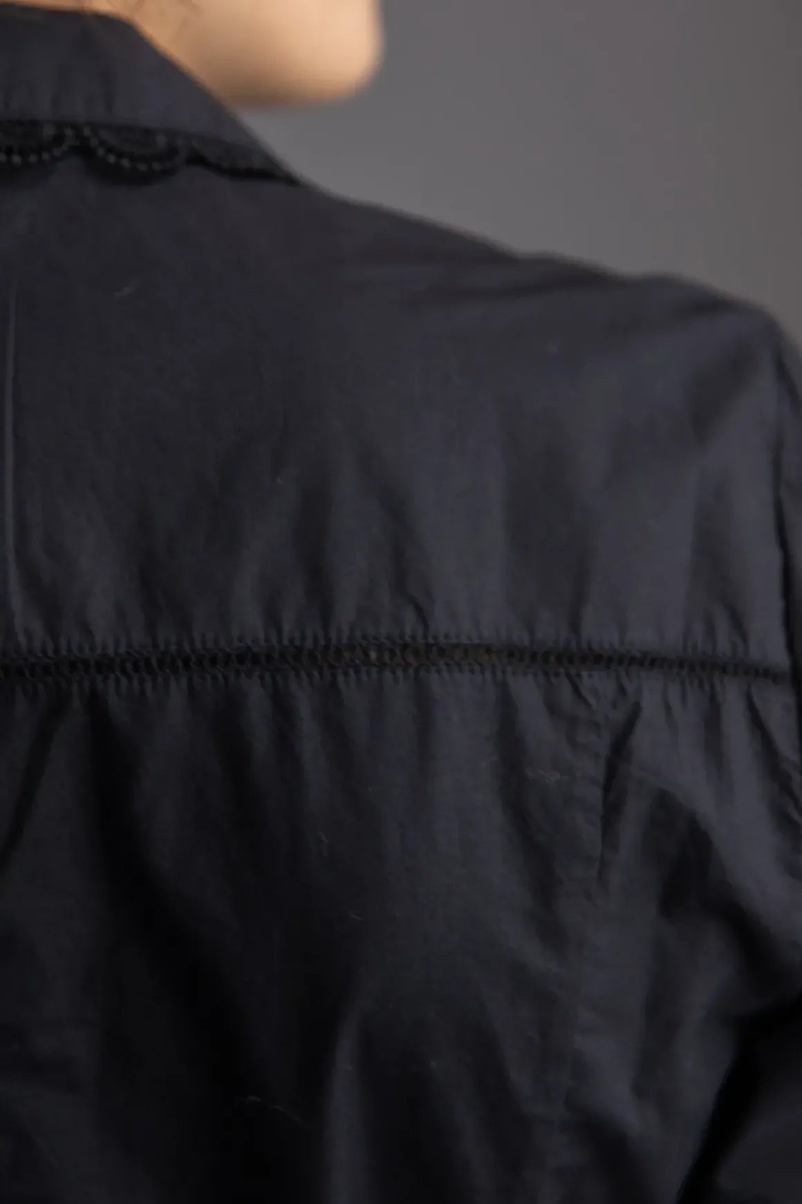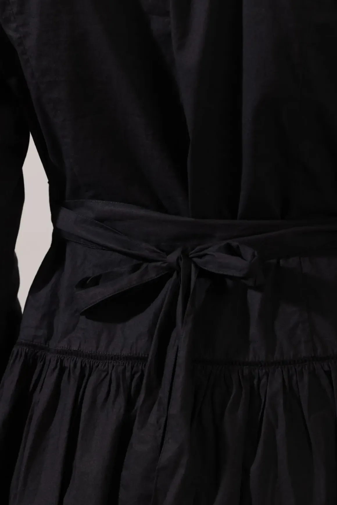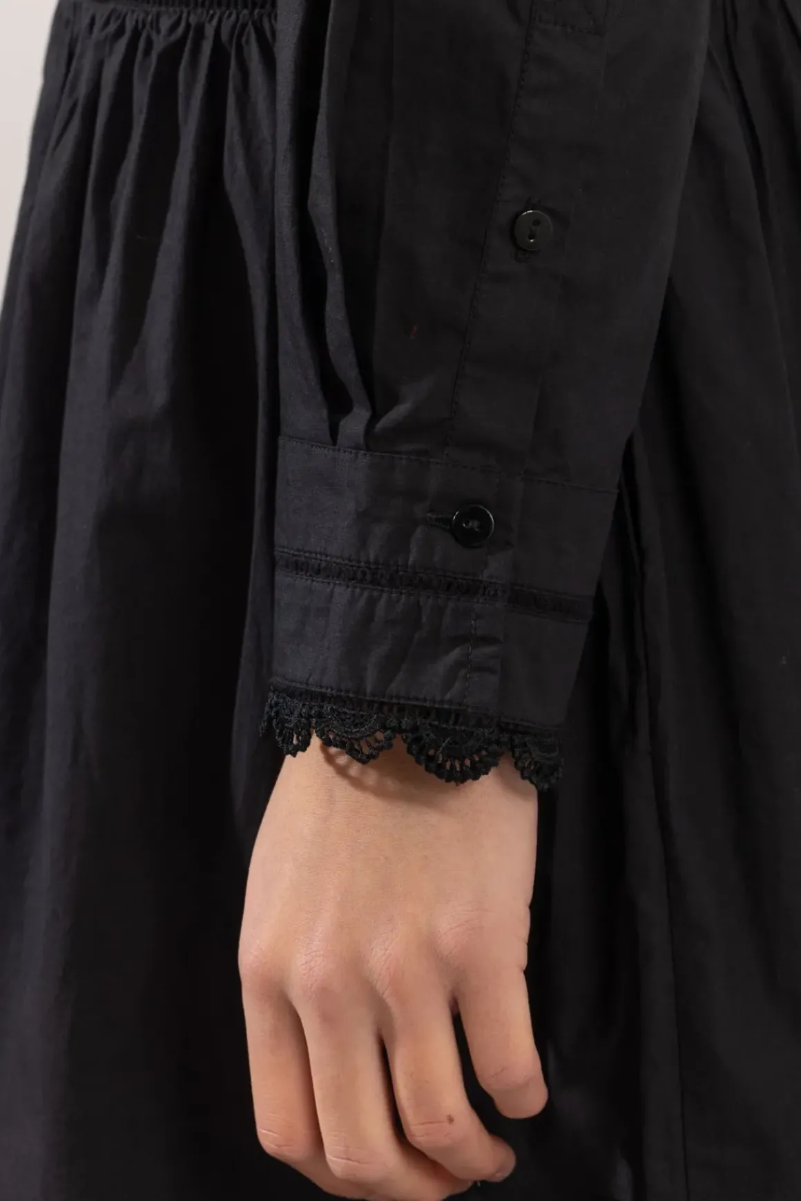 Ariane Noir-kjolen er en klassisk sort penkjole som passer til alle anledninger. Kjolen er laget av bomull med dekorstoff i rayon og har en feminin fasong med knyting i ryggen som fremhever midjen. Knapperekken går hele veien ned, og kjolen er utstyrt med to praktiske lommer. Sømdetaljer nederst på ermene og vakre blondedetaljer tilfører ekstra eleganse, mens kragen gir et klassisk preg til designet.