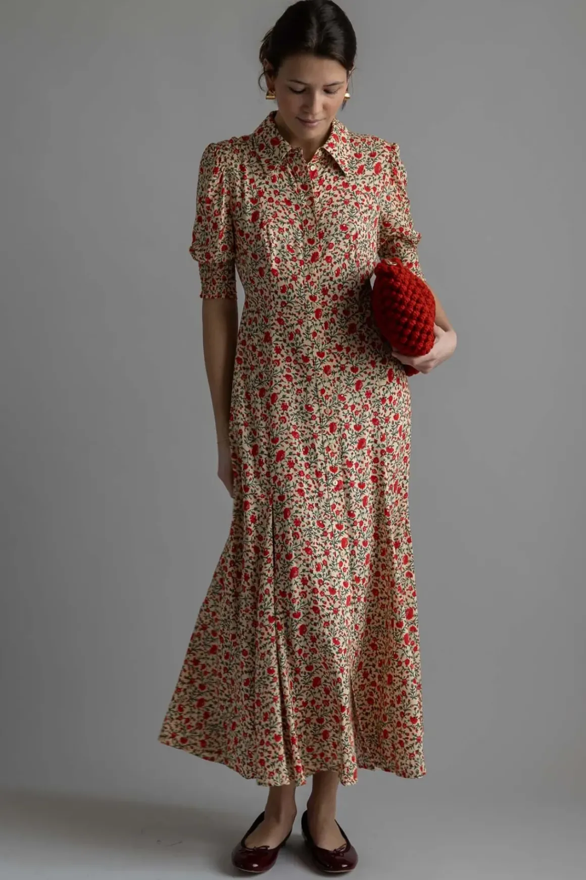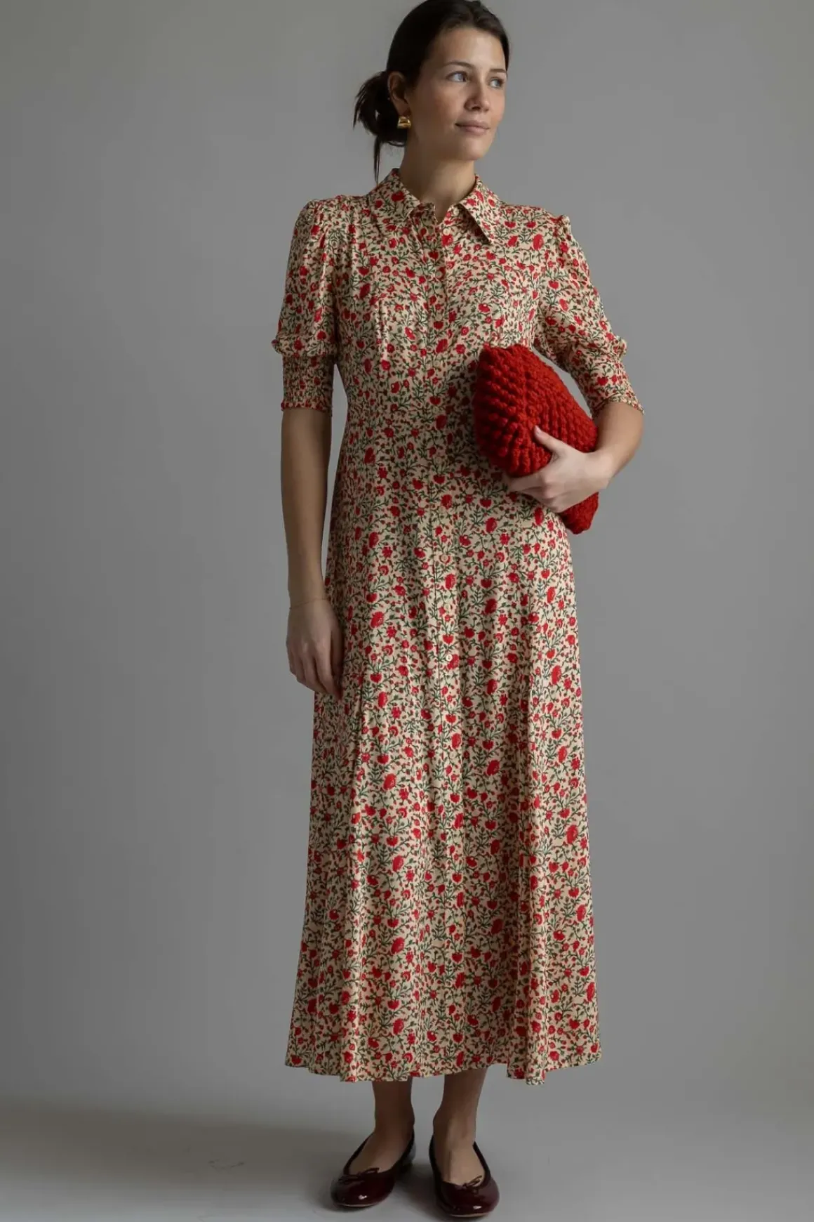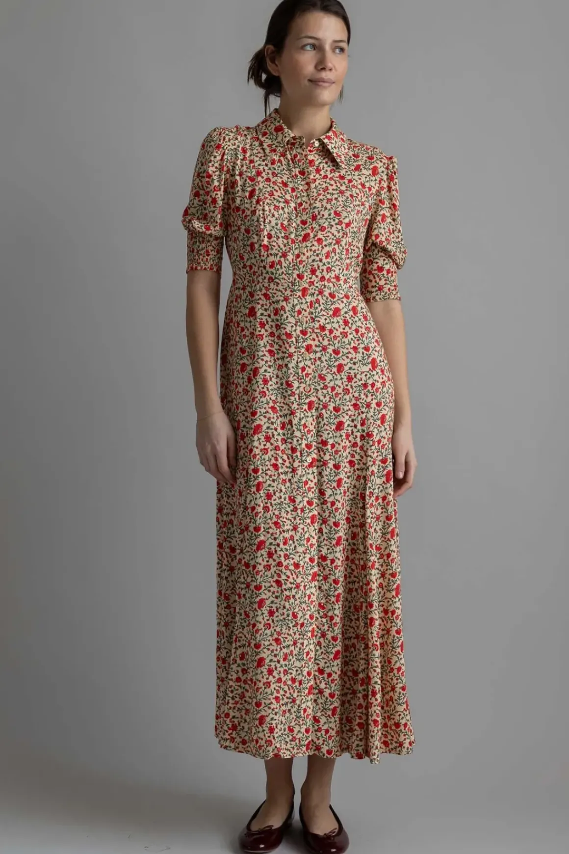 Bloom Dress Ditsy Trail Cream fra Rixo er den perfekte kombinasjonen av bohemsk sjarm og vintage-kulhet. Med sitt delikate blomstermønster og lette viskosemateriale, gir denne kjolen en luftig og feminin silhuett som passer til enhver anledning. Den har en flatterende splitt foran på skjørtet, som gir bevegelse og en nydelig detalj. Knapper fra topp til bunn tilfører en klassisk touch, mens knytingen i ryggen gir muligheten til å justere passformen etter ønske. Strikken i ermene skaper en vakker puffeffekt og bidrar til kjolens feminine uttrykk. Denne kjolen er perfekt for varme sommerdager, men kan enkelt styles opp med hæler og smykker for mer formelle anledninger.