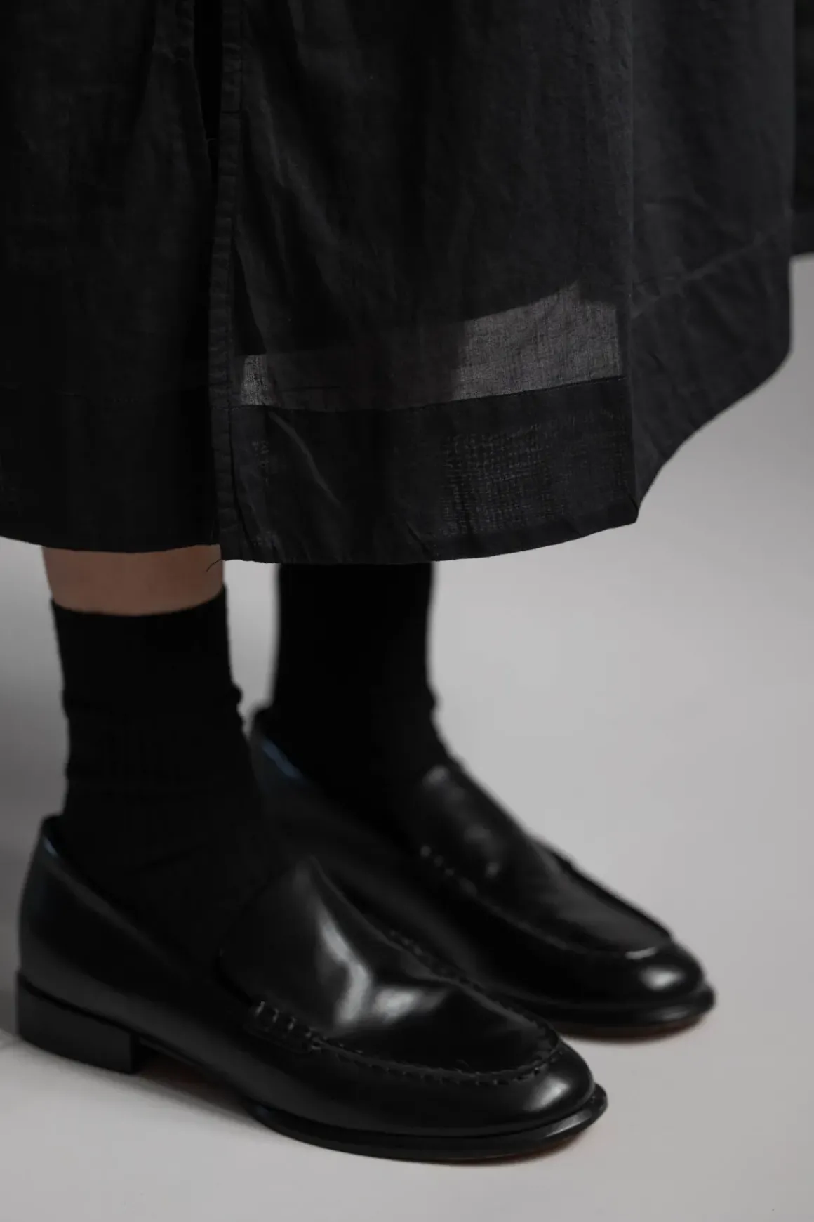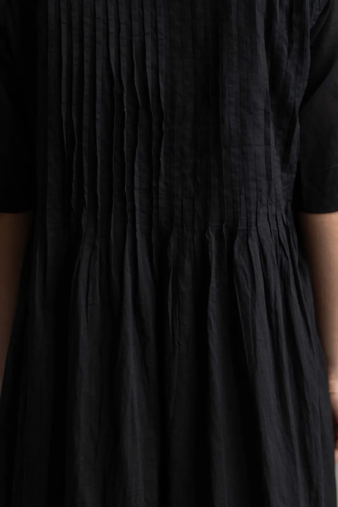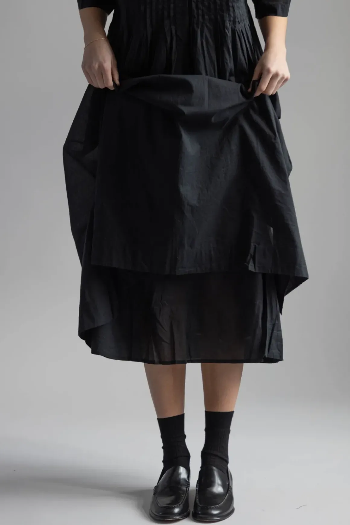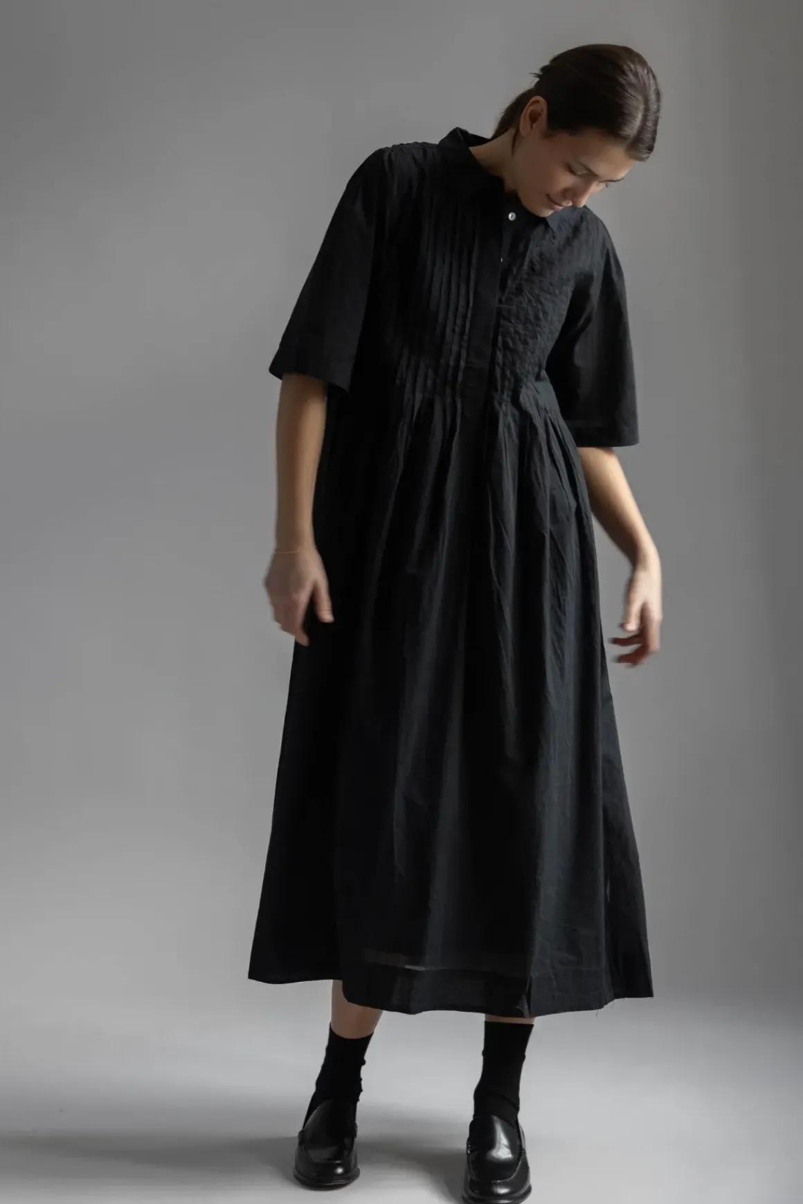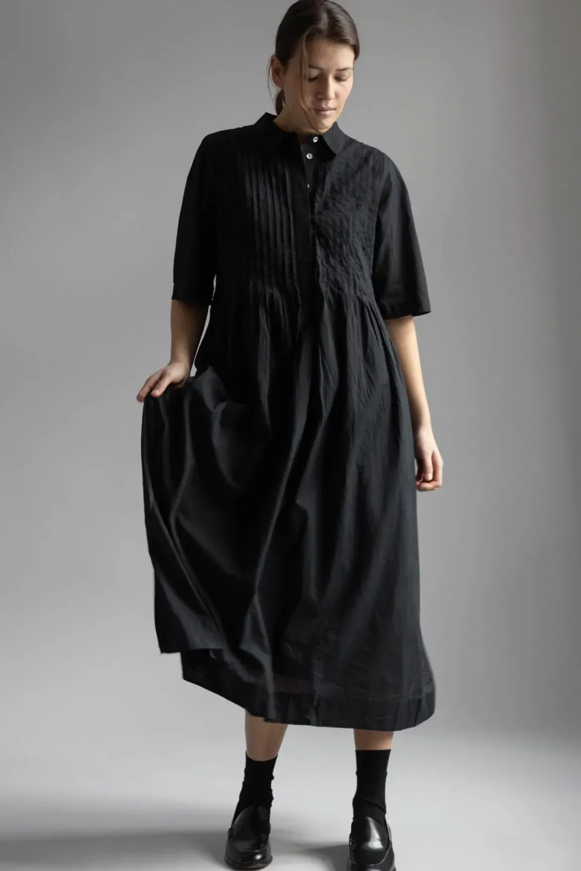 Dot Shirtdress fra Skall Studio er en voluminøs og allsidig midikjole laget av myk, økologisk bomull. Kjolen har delikate folder som gir et feminint uttrykk, en klassisk skjortekrage med knapper i perlemor, lange T-skjorte-ermer og et skjørt med mye volum.